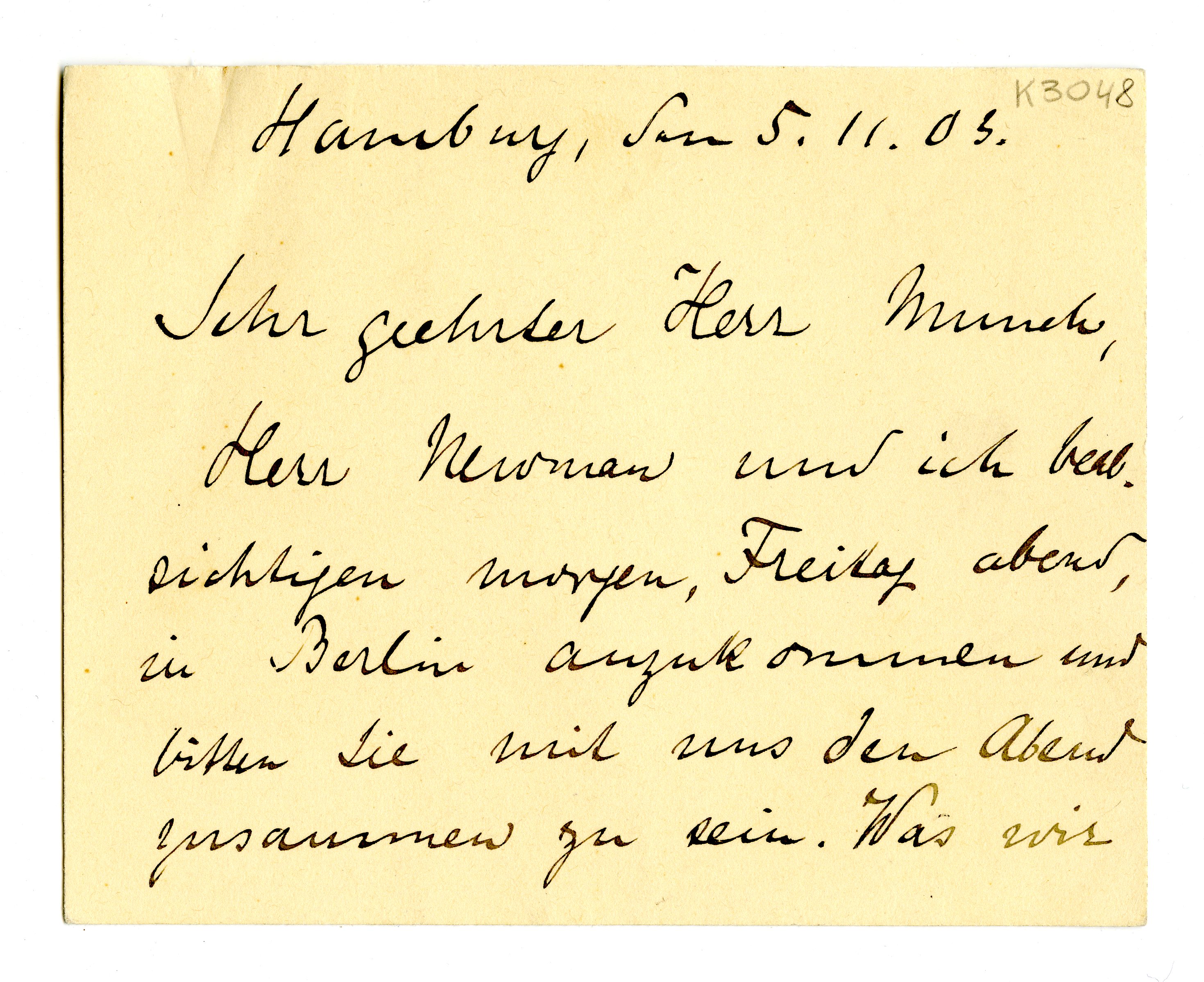 MM K 3048, Munchmuseet. Datert 05.11.1903. Brev fra Gustav Schiefler.