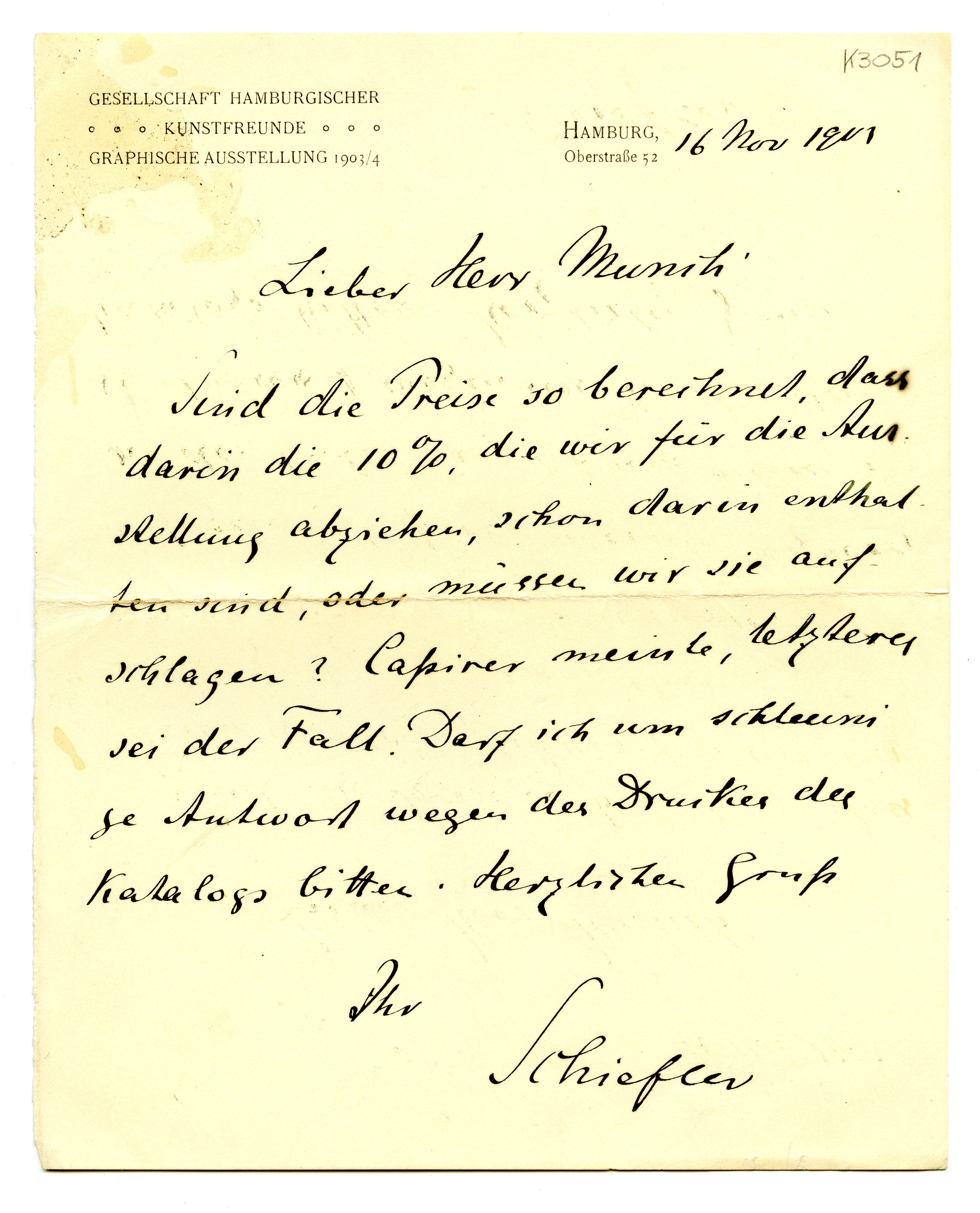 MM K 3051, Munchmuseet. Datert 16.11.1903. Brev fra Gustav Schiefler.