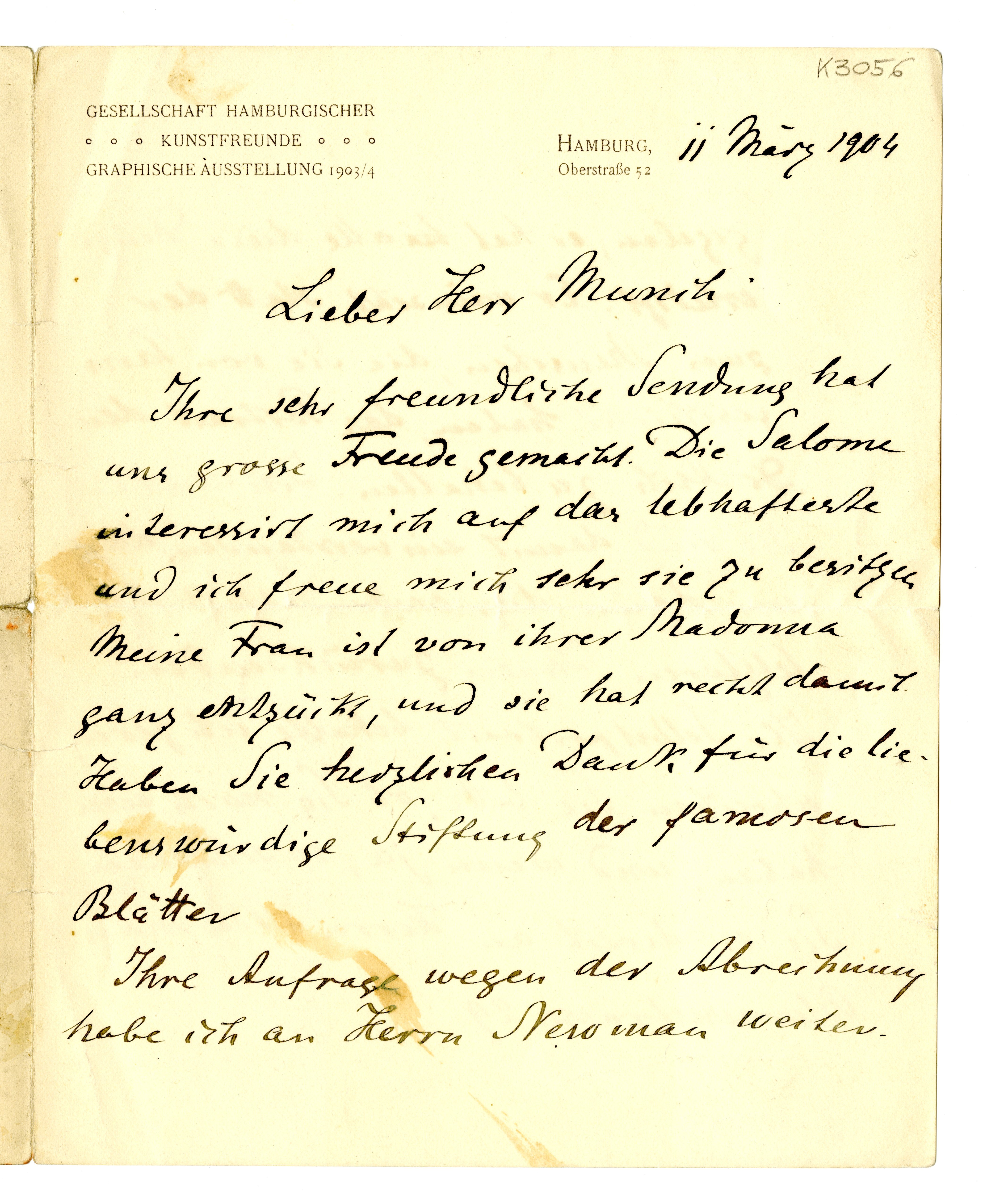 MM K 3056, Munchmuseet. Datert 11.03.1904. Brev fra Gustav Schiefler.