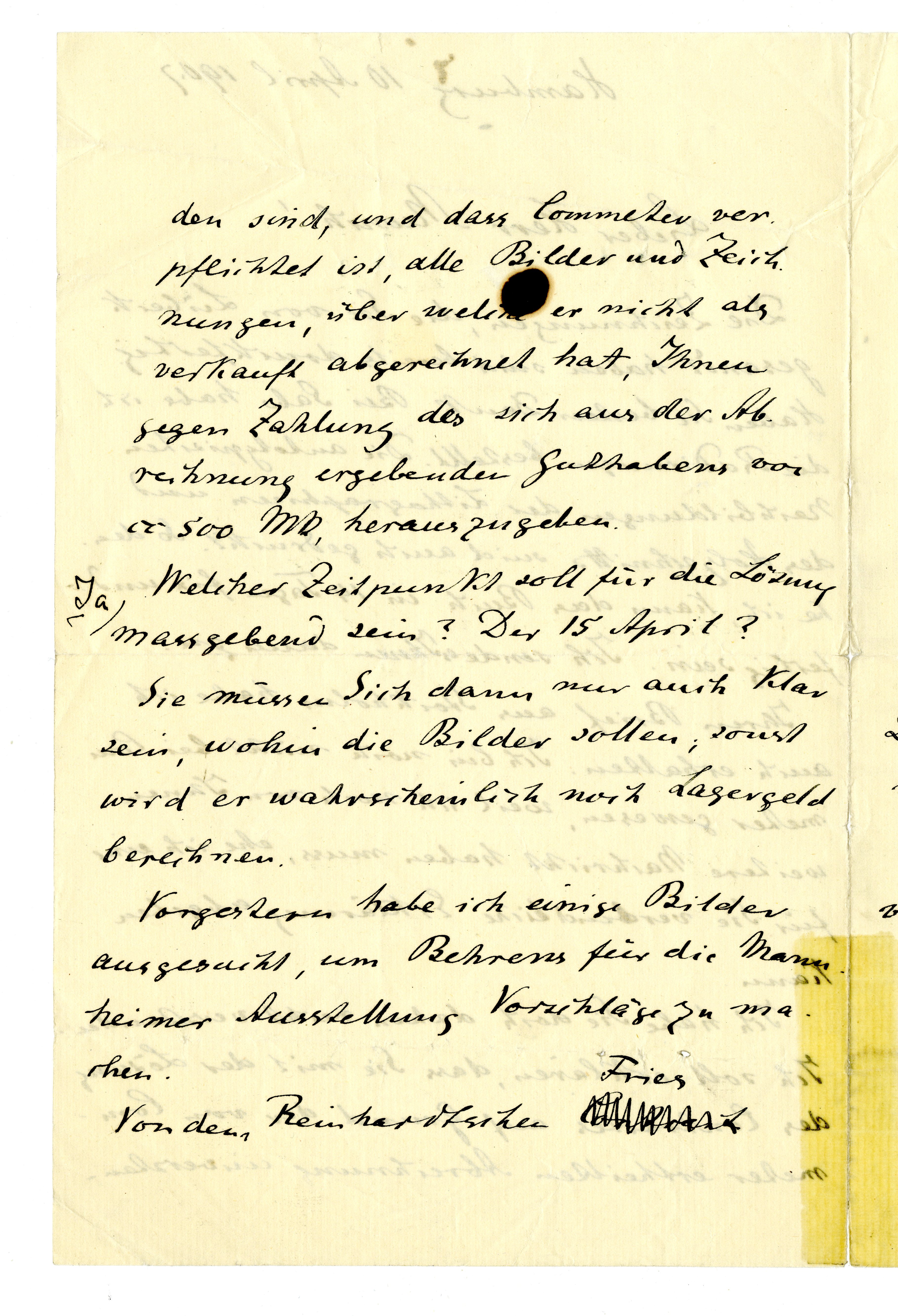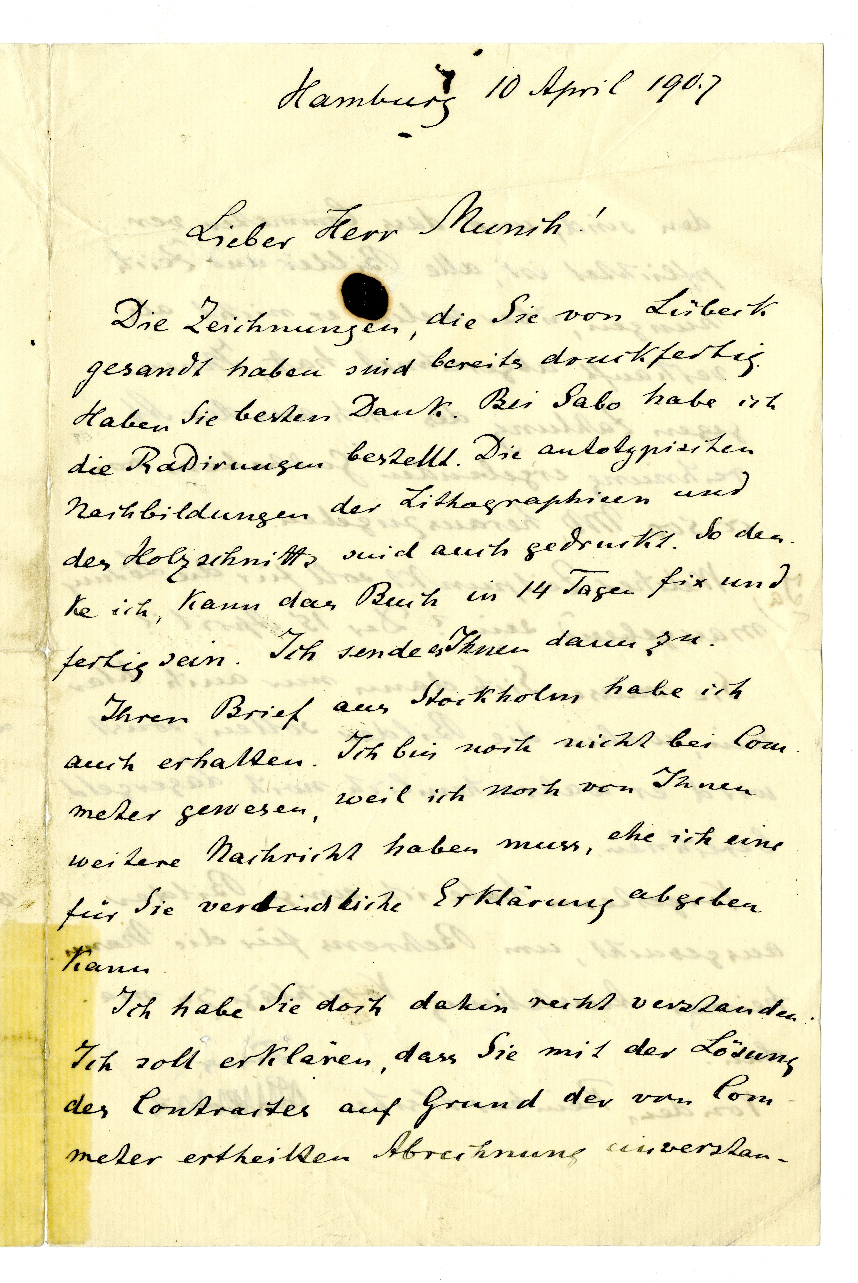 MM K 3113, Munchmuseet. Datert 10.04.1907. Brev fra Gustav Schiefler.