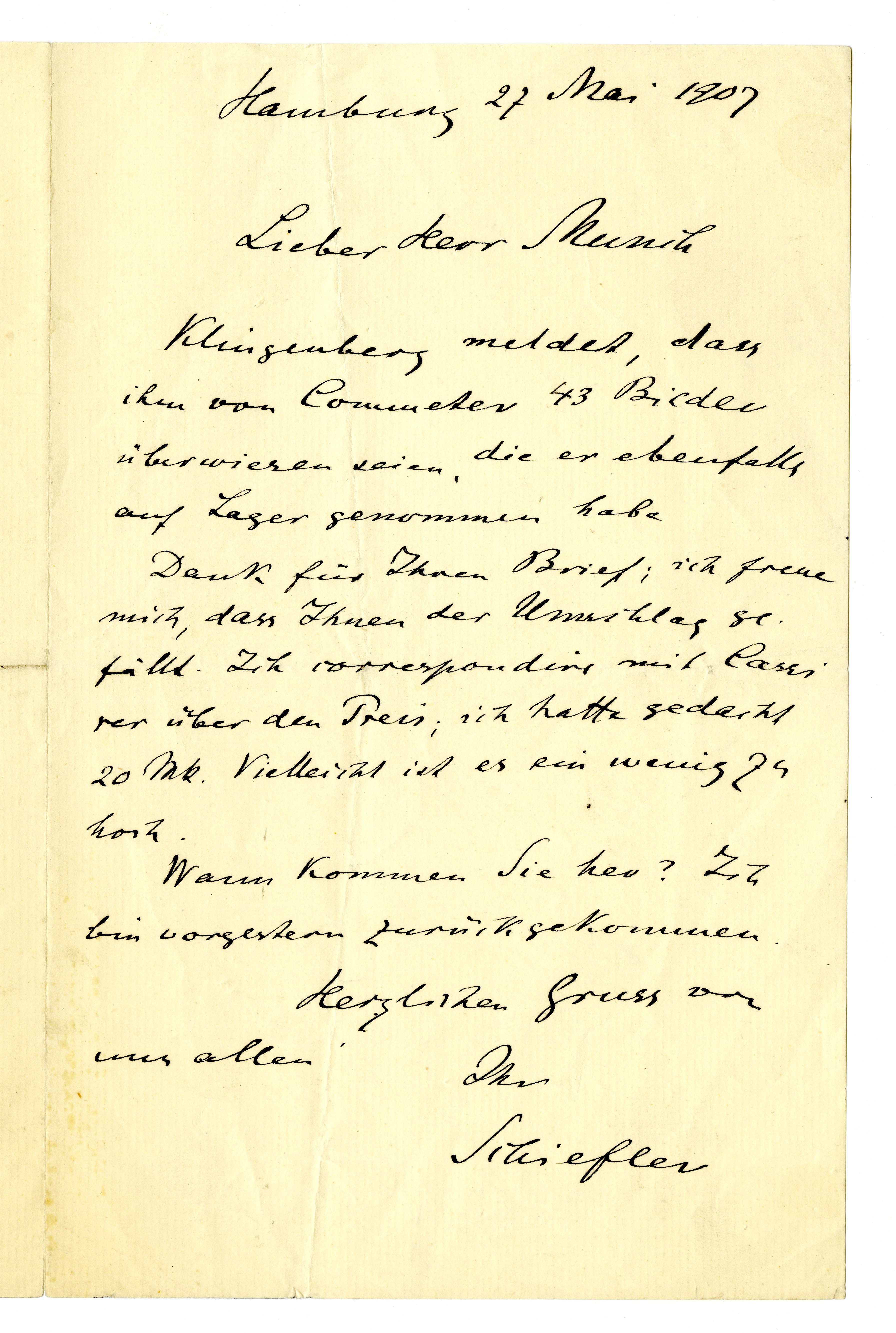 MM K 3116, Munchmuseet. Datert 27.05.1907. Brev fra Gustav Schiefler.