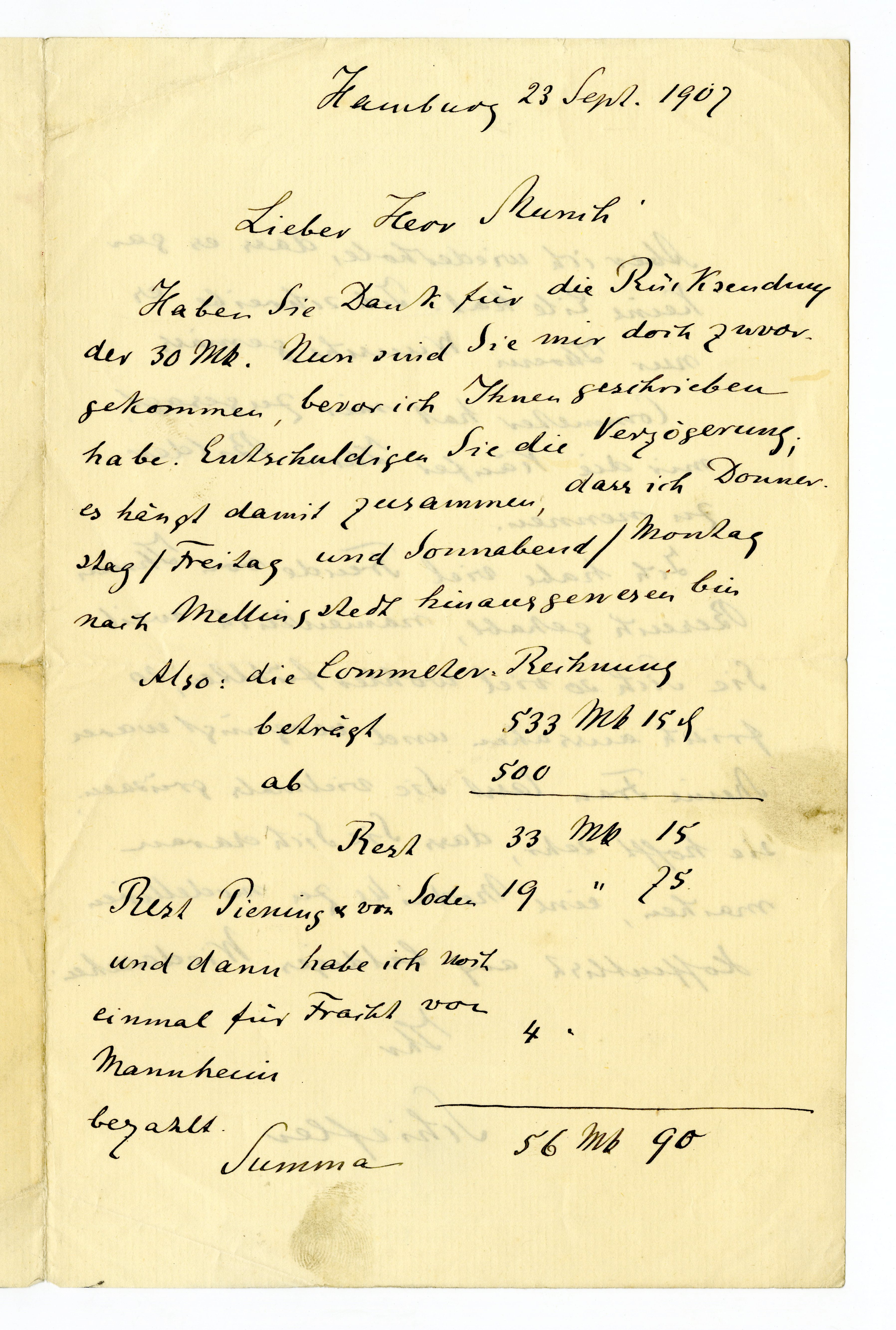 MM K 3117, Munchmuseet. Datert 23.09.1907. Brev fra Gustav Schiefler.