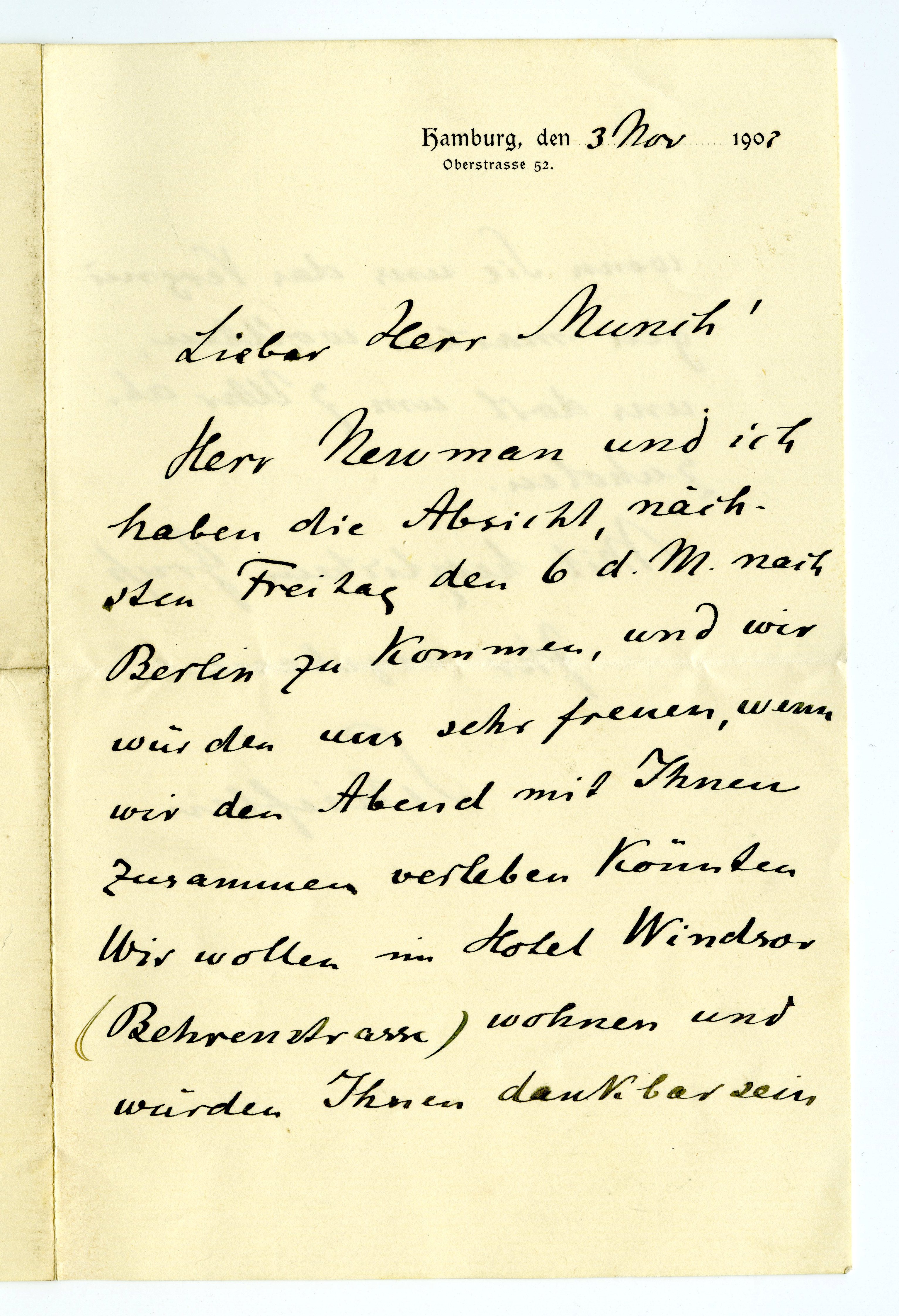 MM K 3119, Munchmuseet. Datert 03.11.1907. Brev fra Gustav Schiefler.