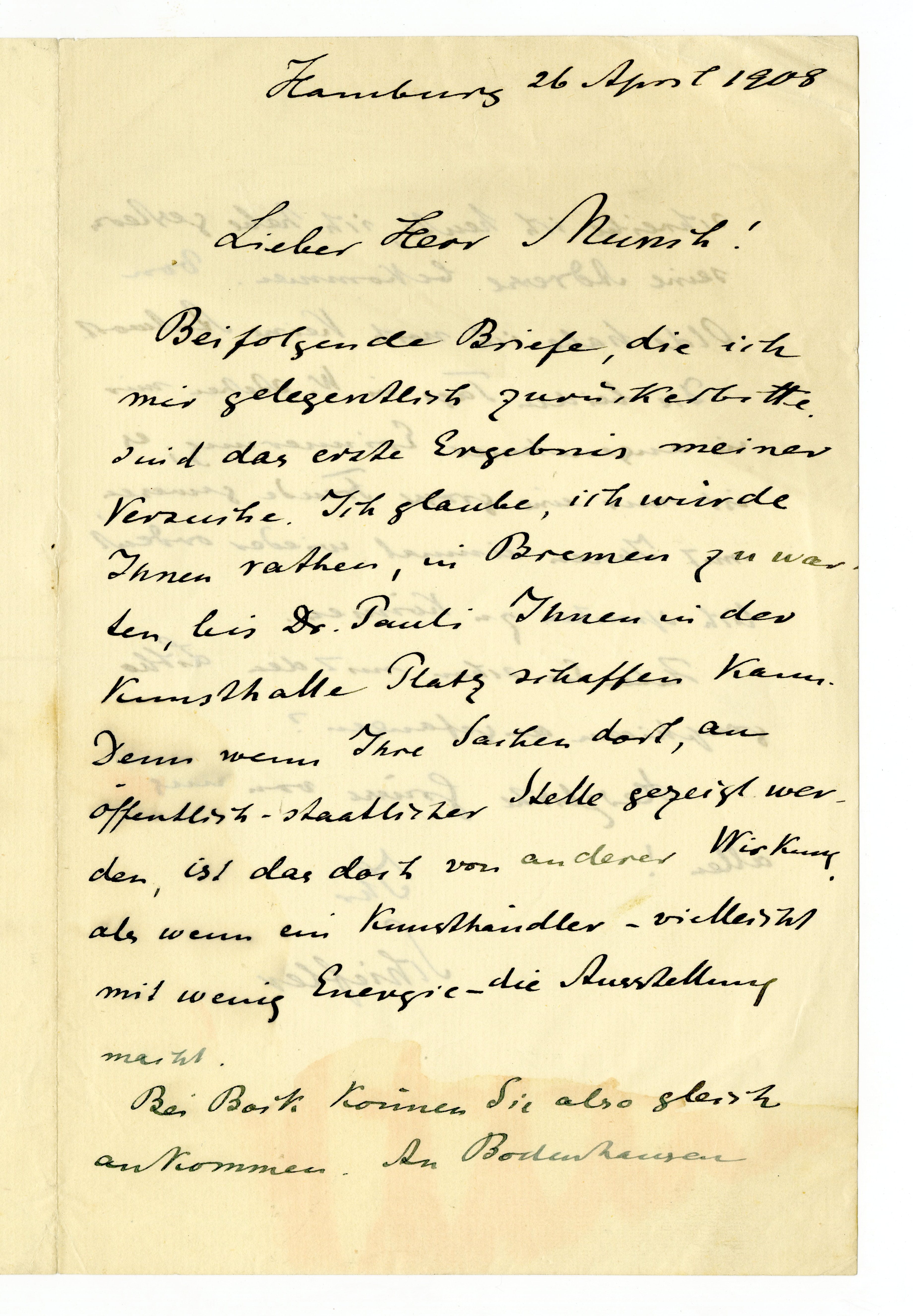 MM K 3125, Munchmuseet. Datert 26.04.1908. Brev fra Gustav Schiefler.