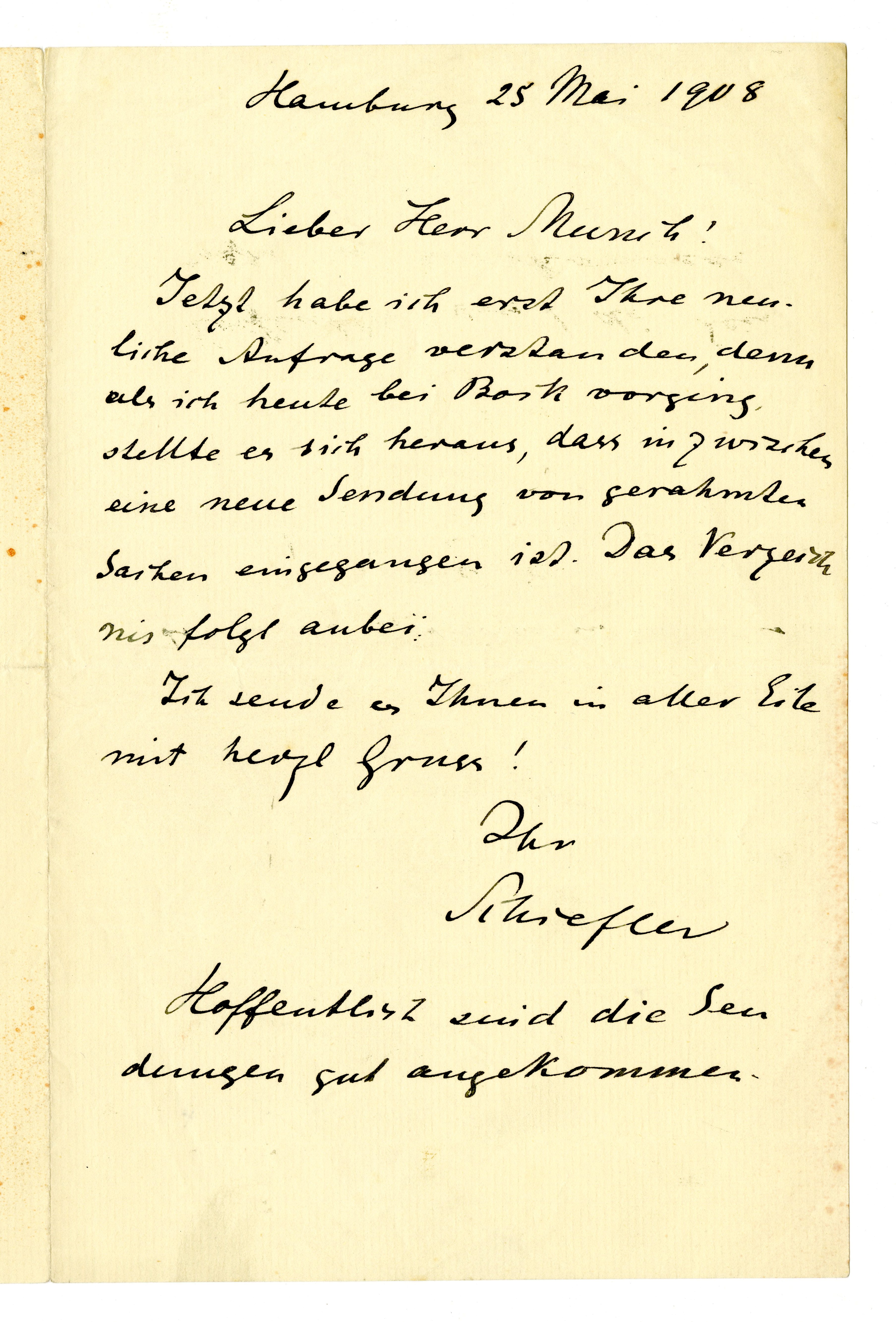 MM K 3130, Munchmuseet. Datert 25.05.1908. Brev fra Gustav Schiefler.