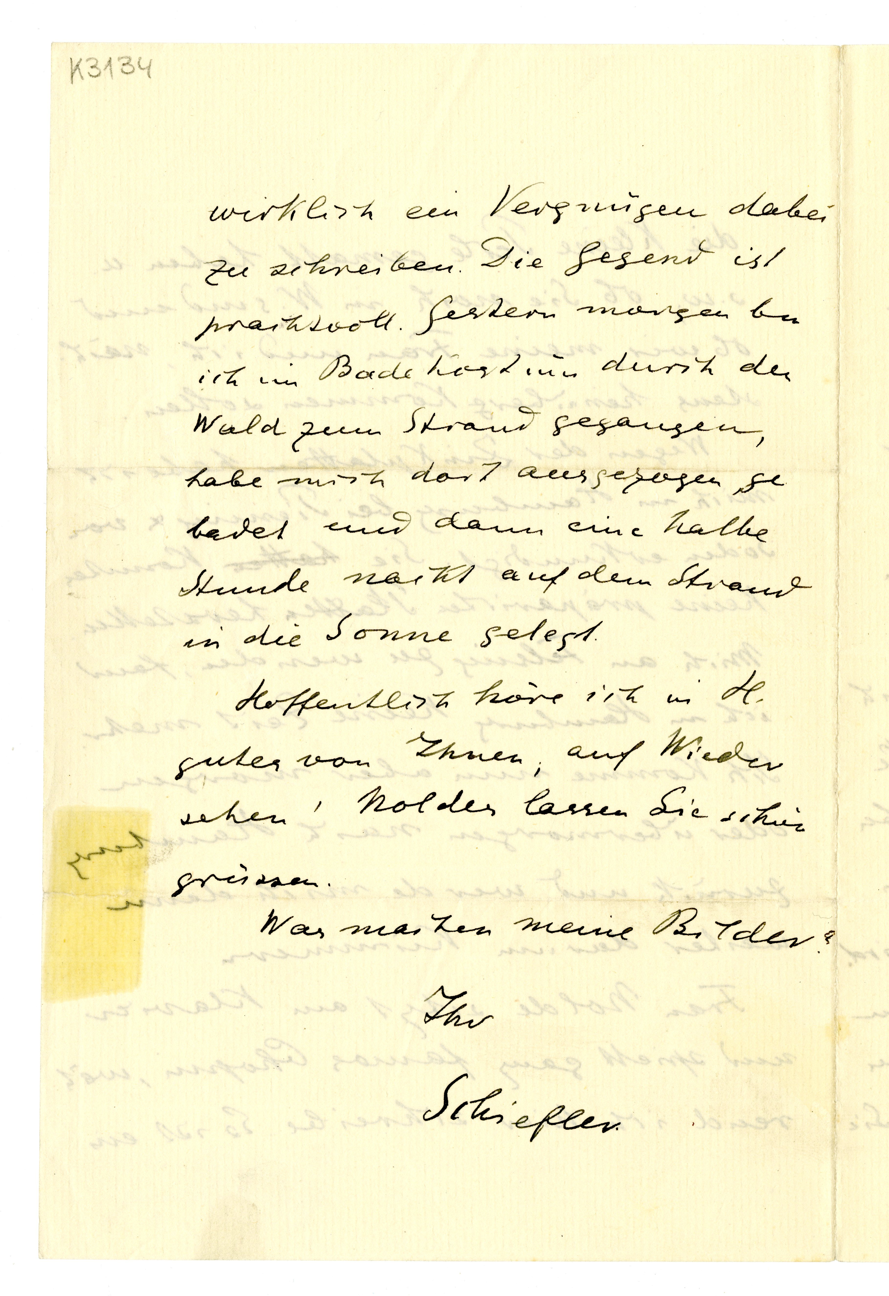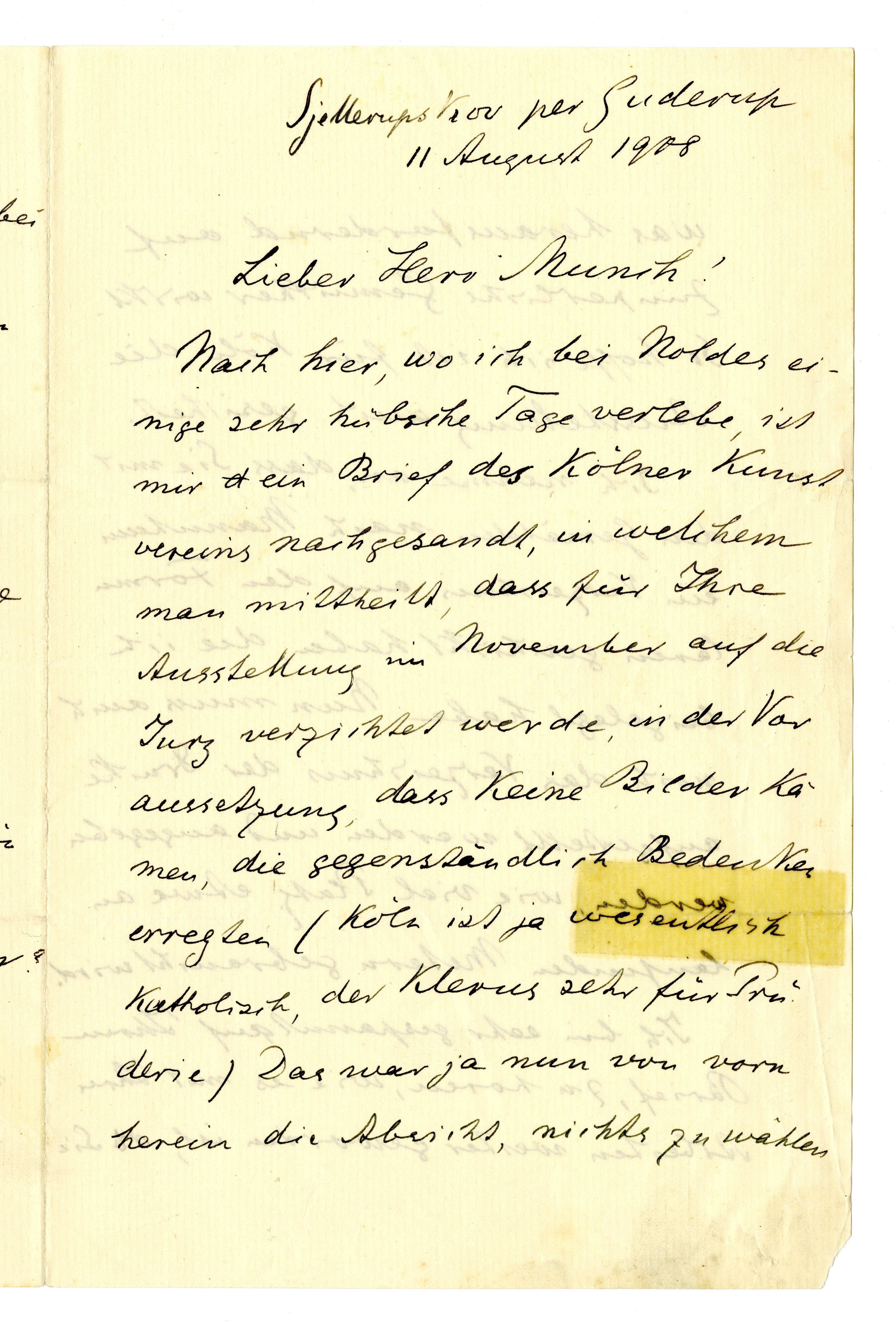 MM K 3134, Munchmuseet. Datert 11.08.1908. Brev fra Gustav Schiefler.