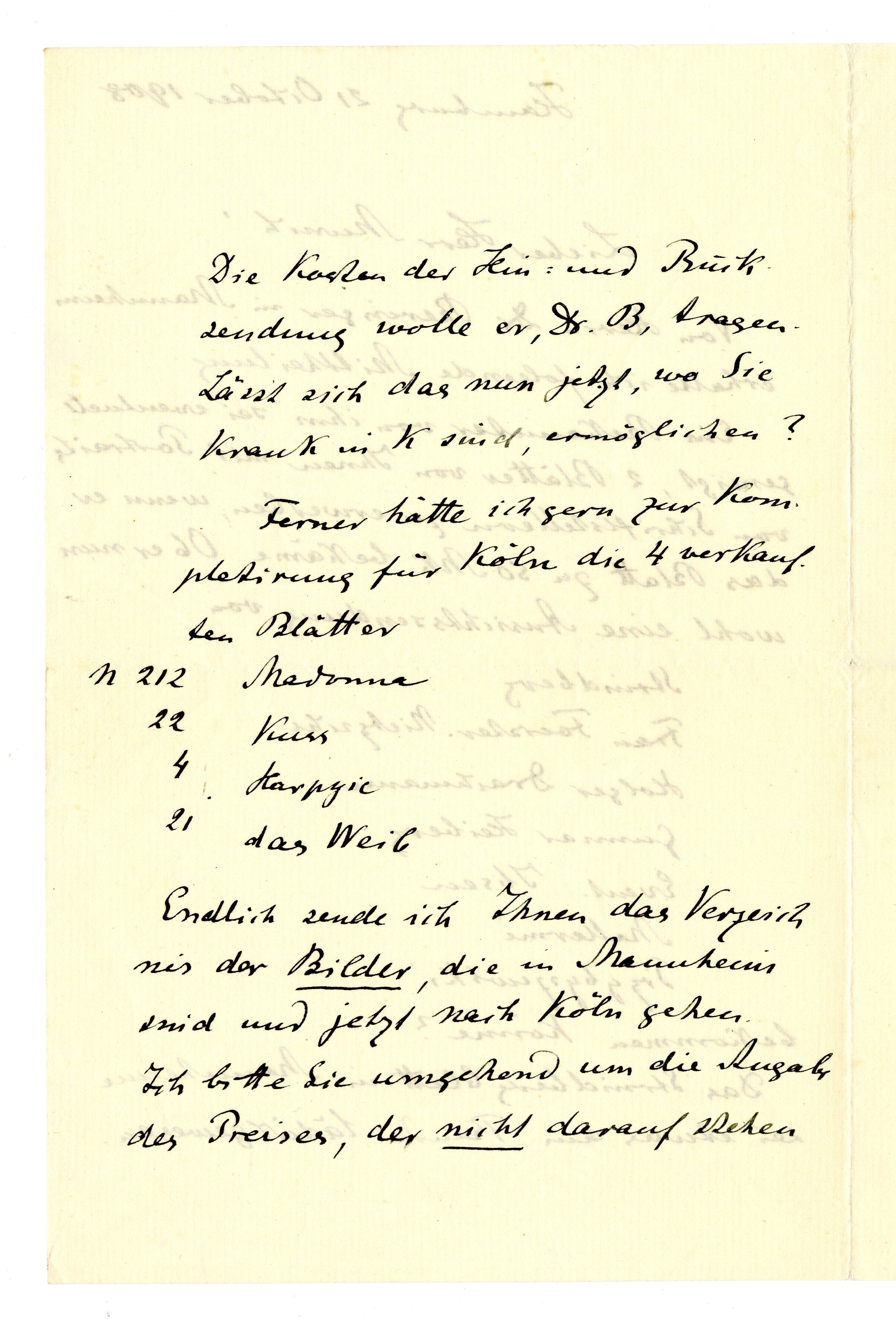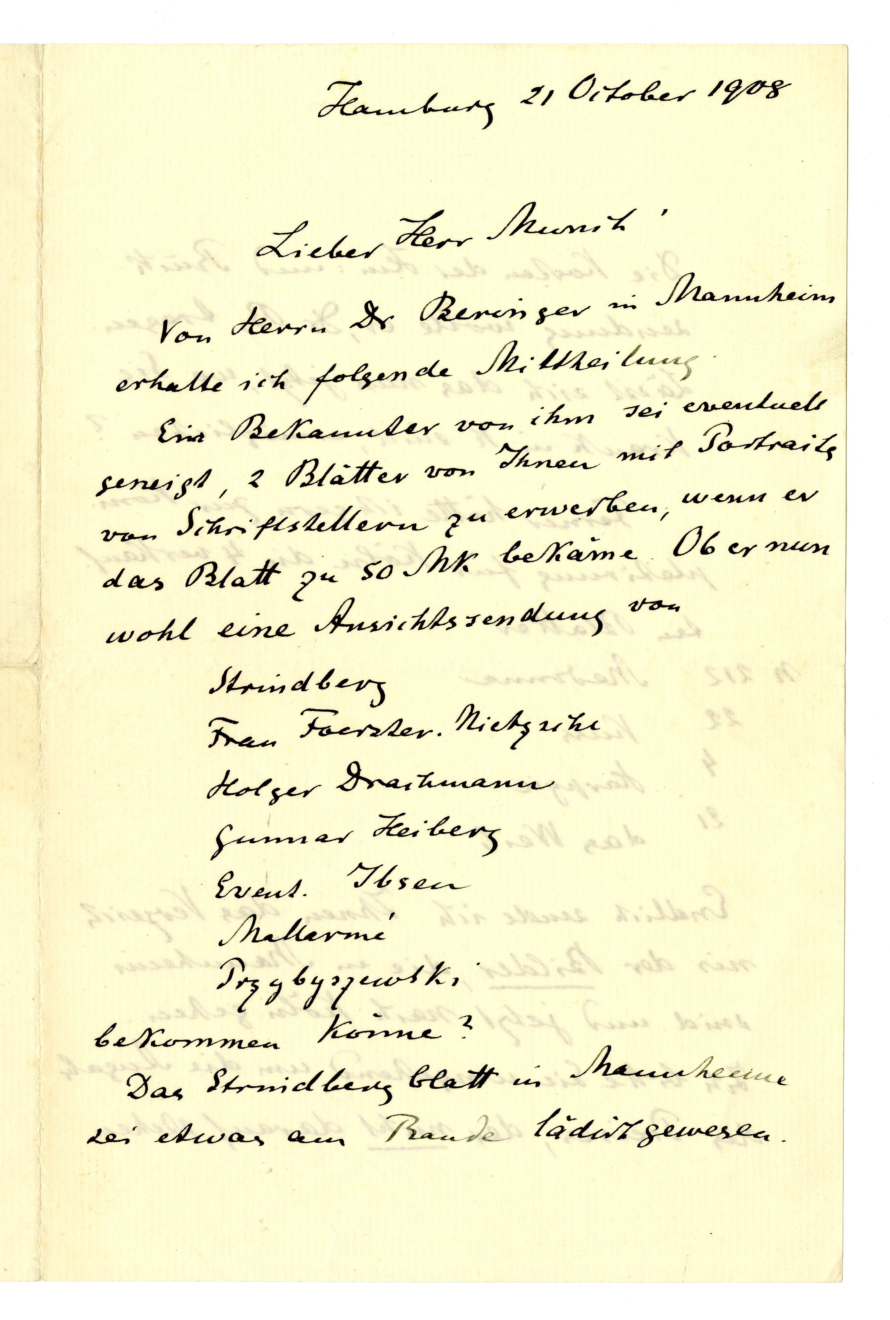 MM K 3137, Munchmuseet. Datert 21.10.1908. Brev fra Gustav Schiefler.
