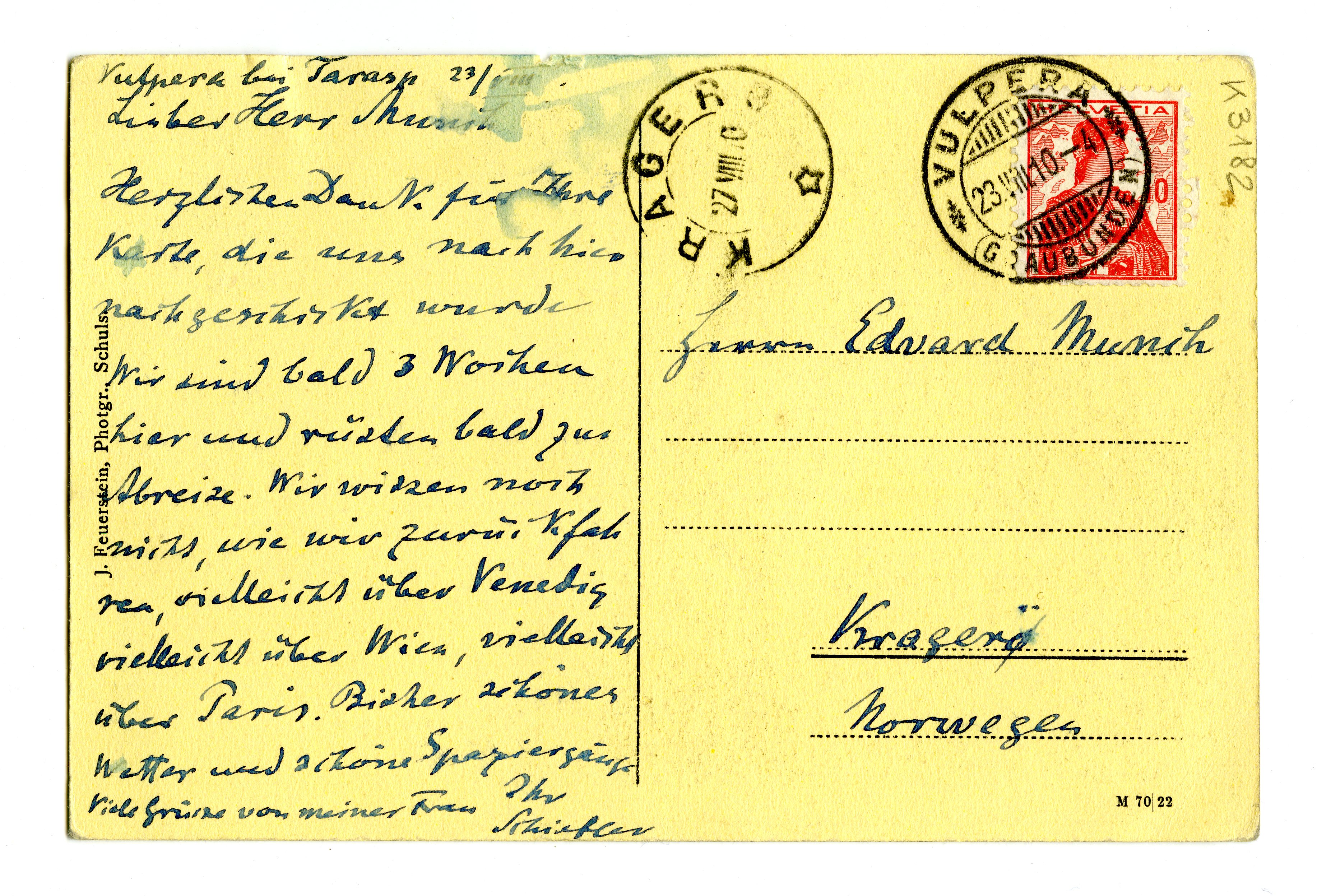 MM K 3182, Munchmuseet. Datert 23.08.1910. Brev fra Gustav Schiefler.