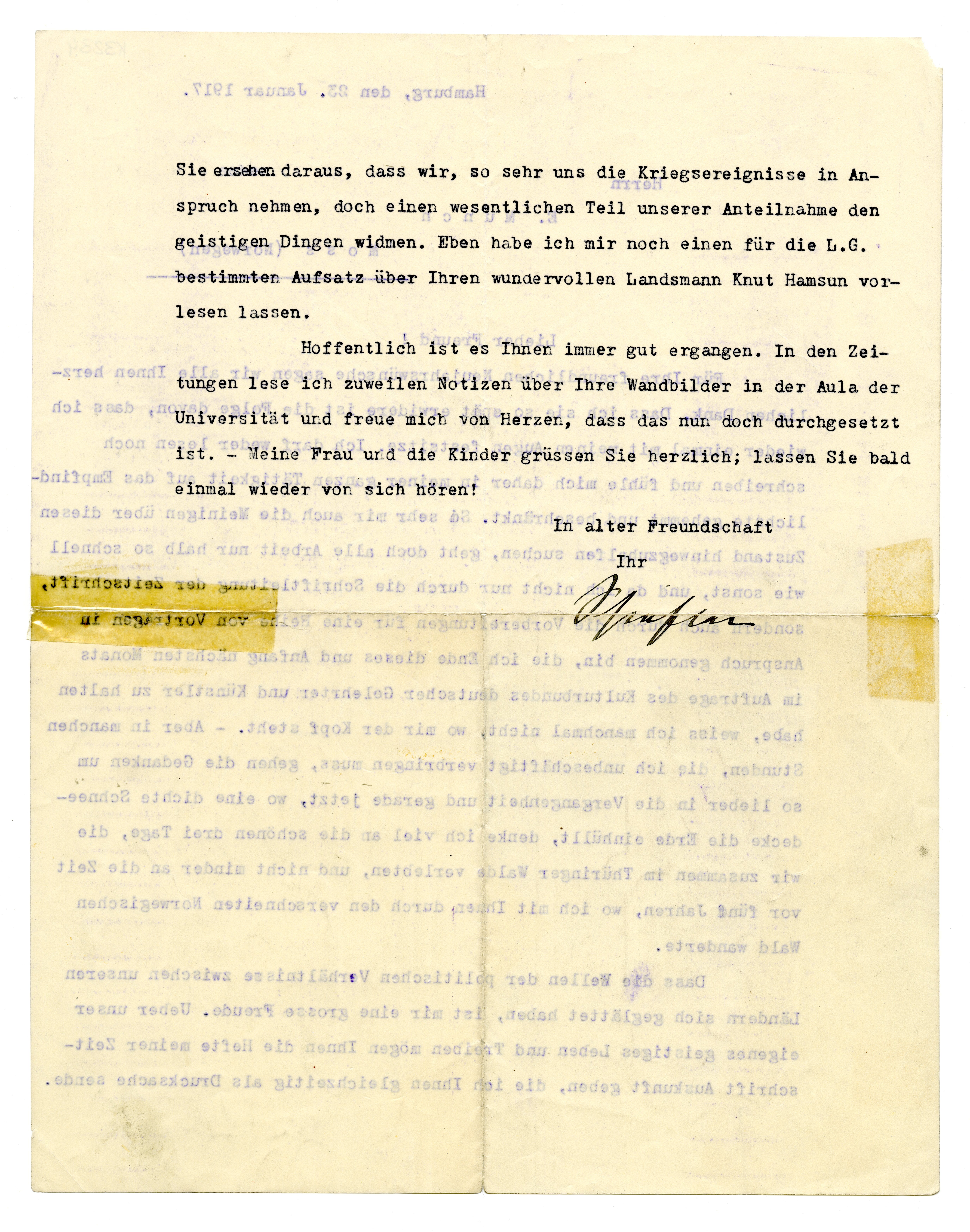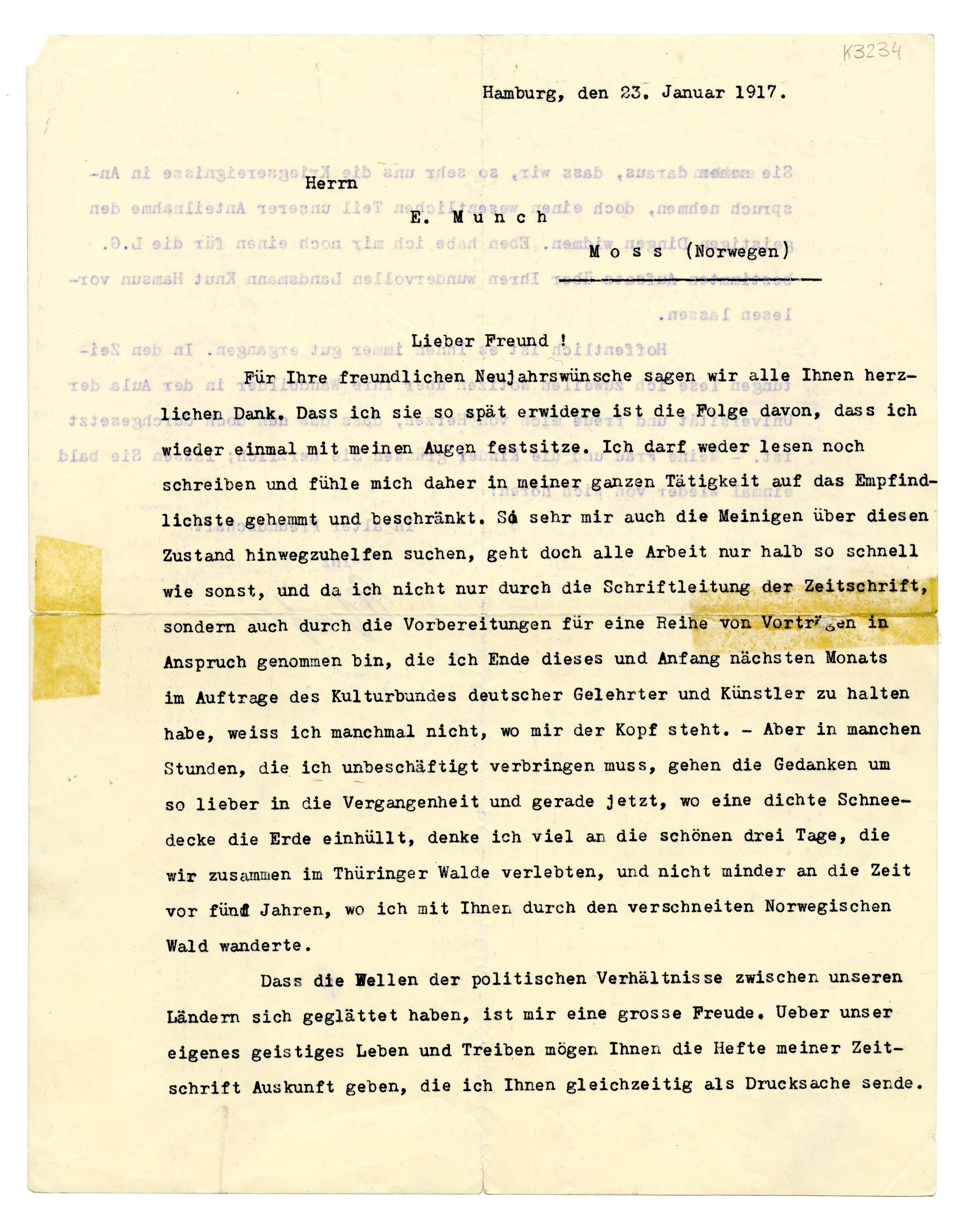 MM K 3234, Munchmuseet. Datert 23.01.1917. Brev fra Gustav Schiefler.
