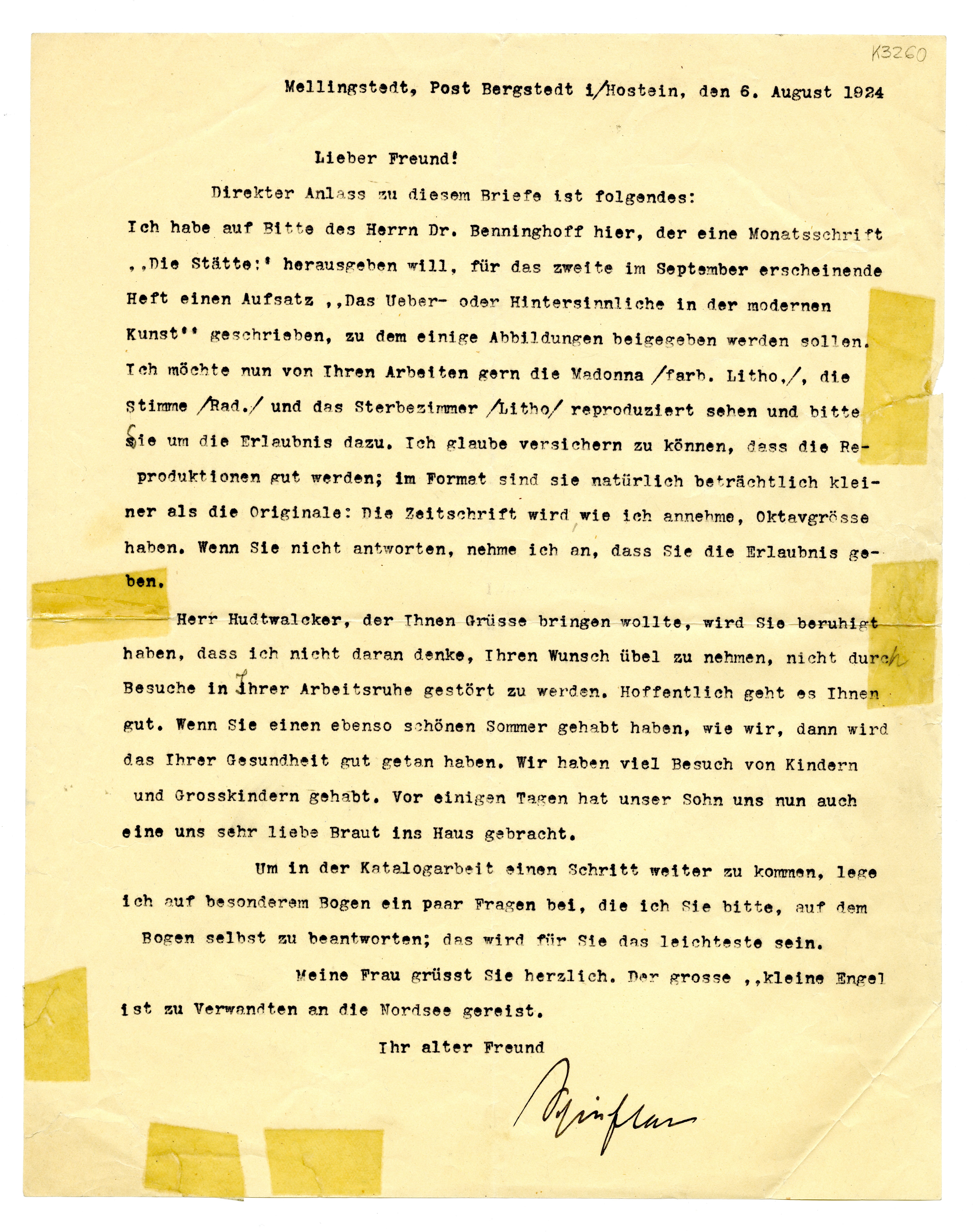 MM K 3260, Munchmuseet. Datert 06.08.1924. Brev fra Gustav Schiefler.