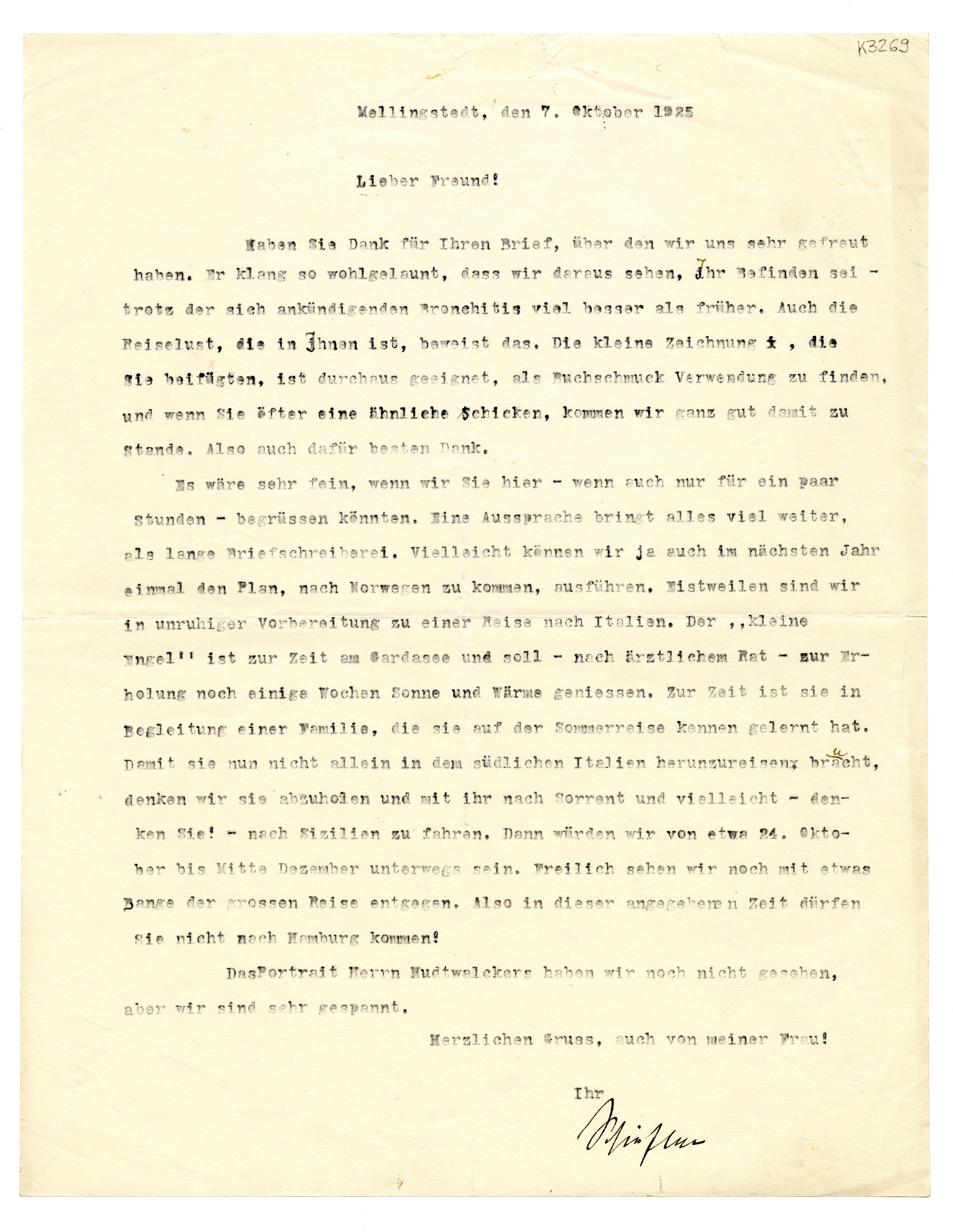 MM K 3269, Munchmuseet. Datert 07.10.1925. Brev fra Gustav Schiefler.