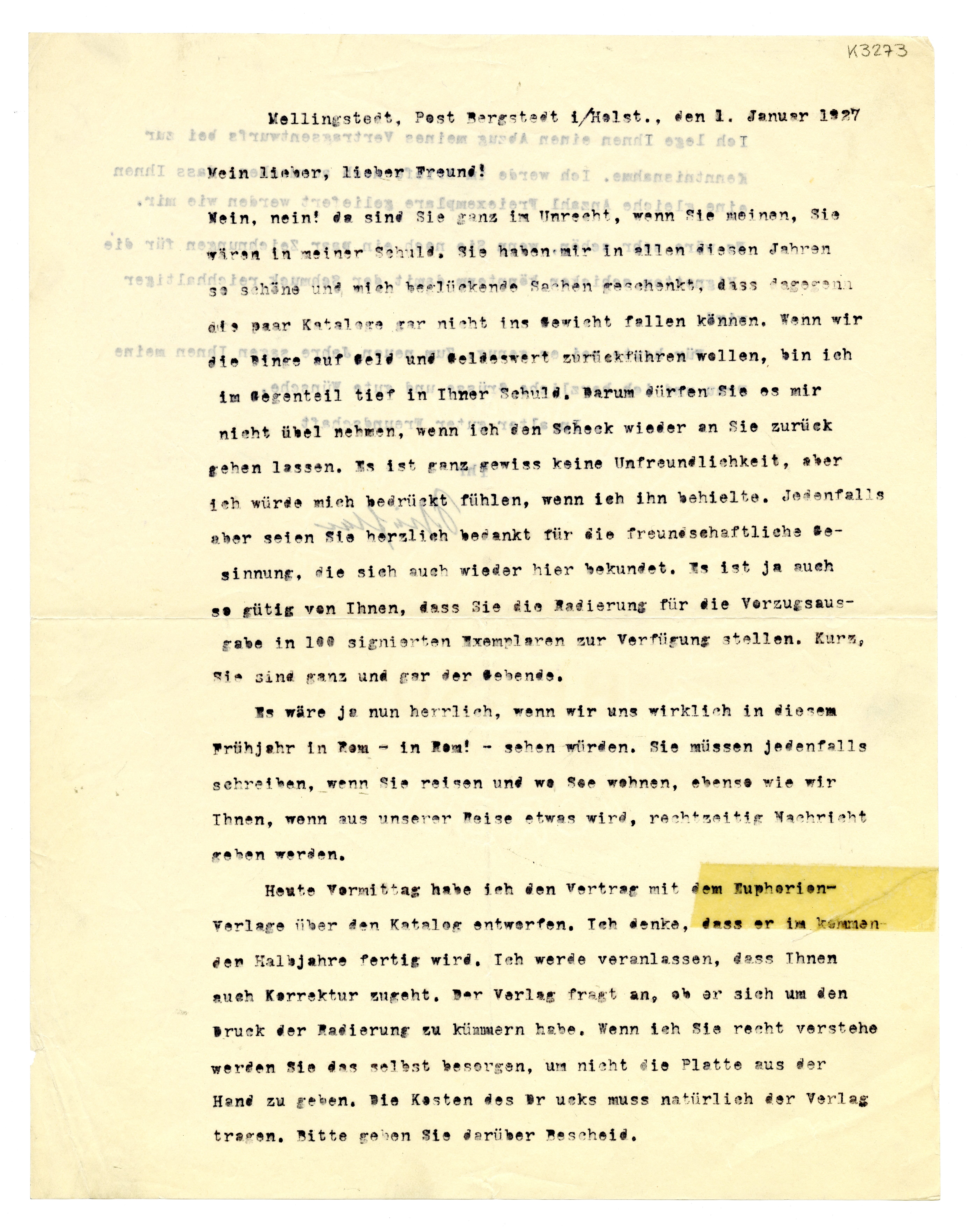 MM K 3273, Munchmuseet. Datert 01.01.1927. Brev fra Gustav Schiefler.