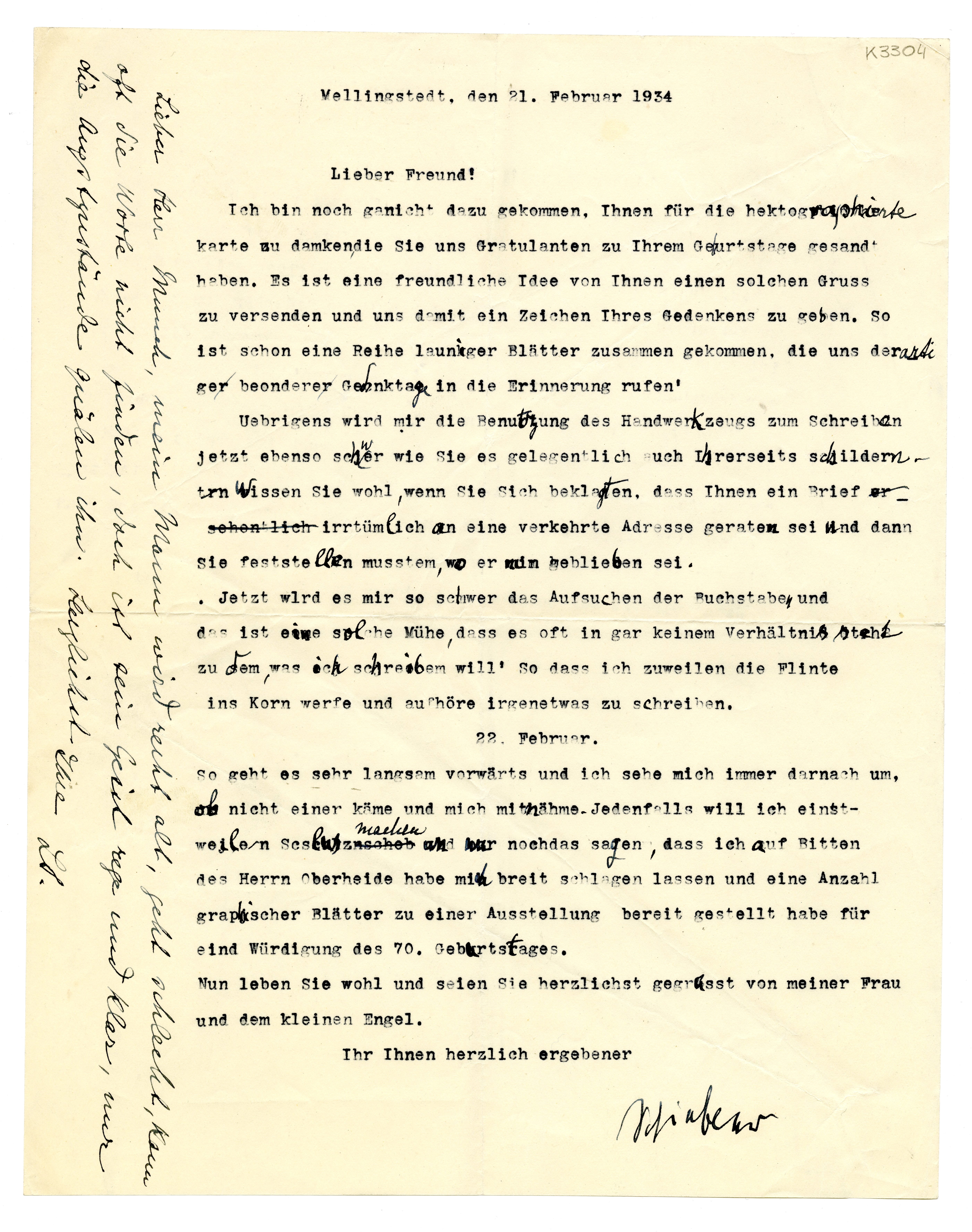 MM K 3304, Munchmuseet. Datert 21.02.1934. Brev fra Gustav Schiefler, Luise Schiefler.