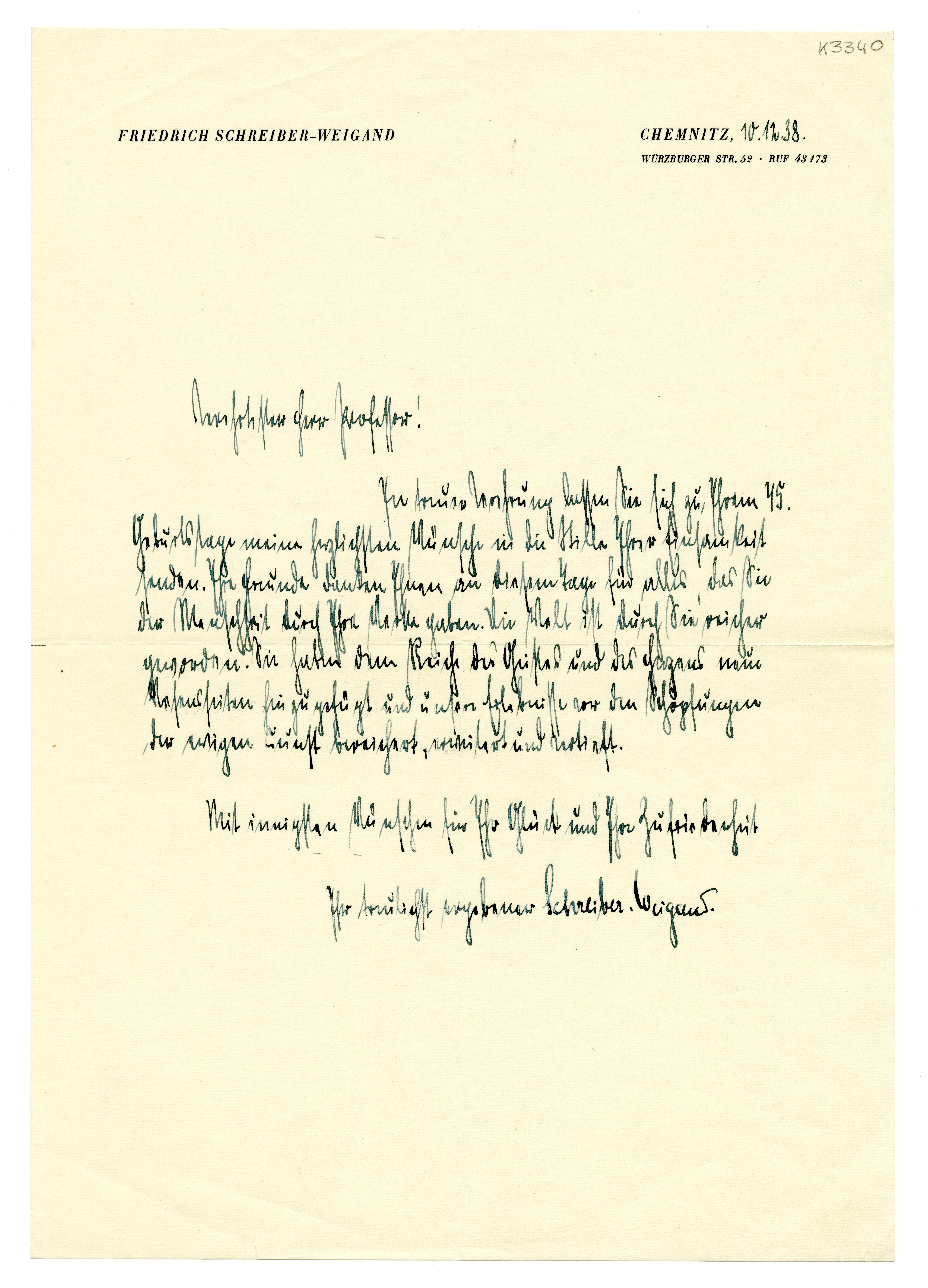 MM K 3340, Munchmuseet. Datert 10.12.1938. Brev fra Friedrich Schreiber-Weigand.