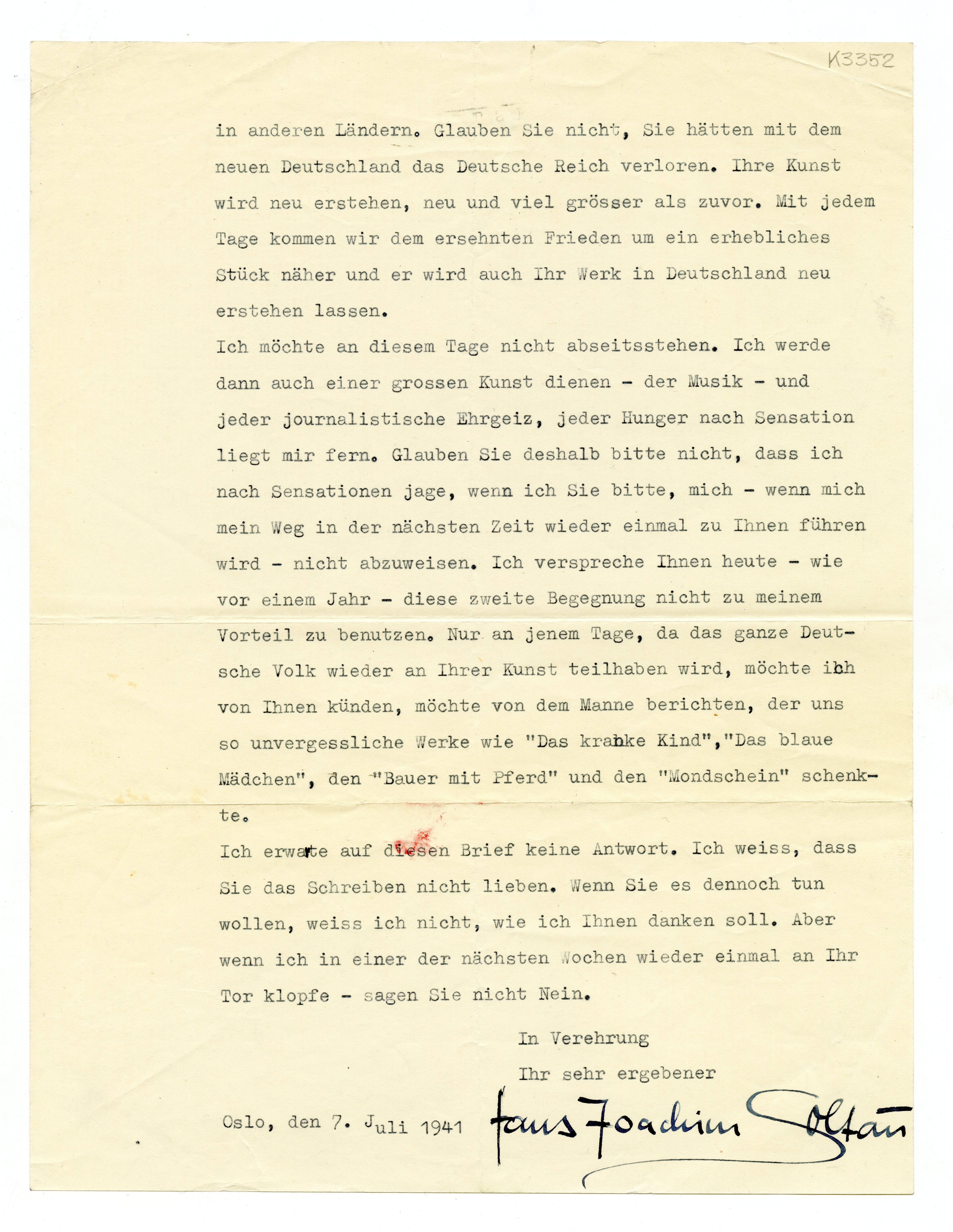 MM K 3352, Munchmuseet. Datert 07.07.1941. Brev fra Hans Joachim Soltau.