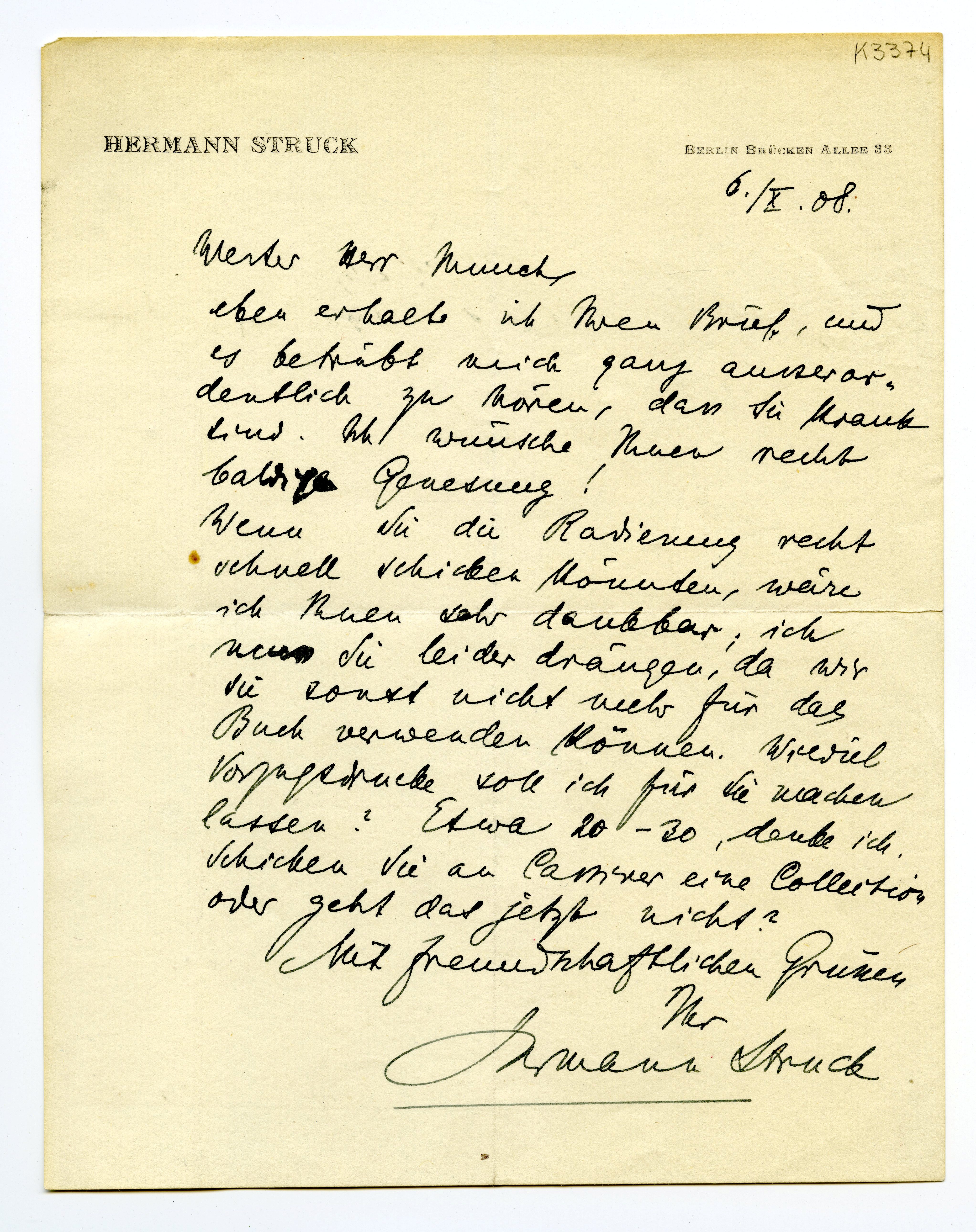 MM K 3374, Munchmuseet. Datert 06.10.1908. Brev fra Hermann Struck.