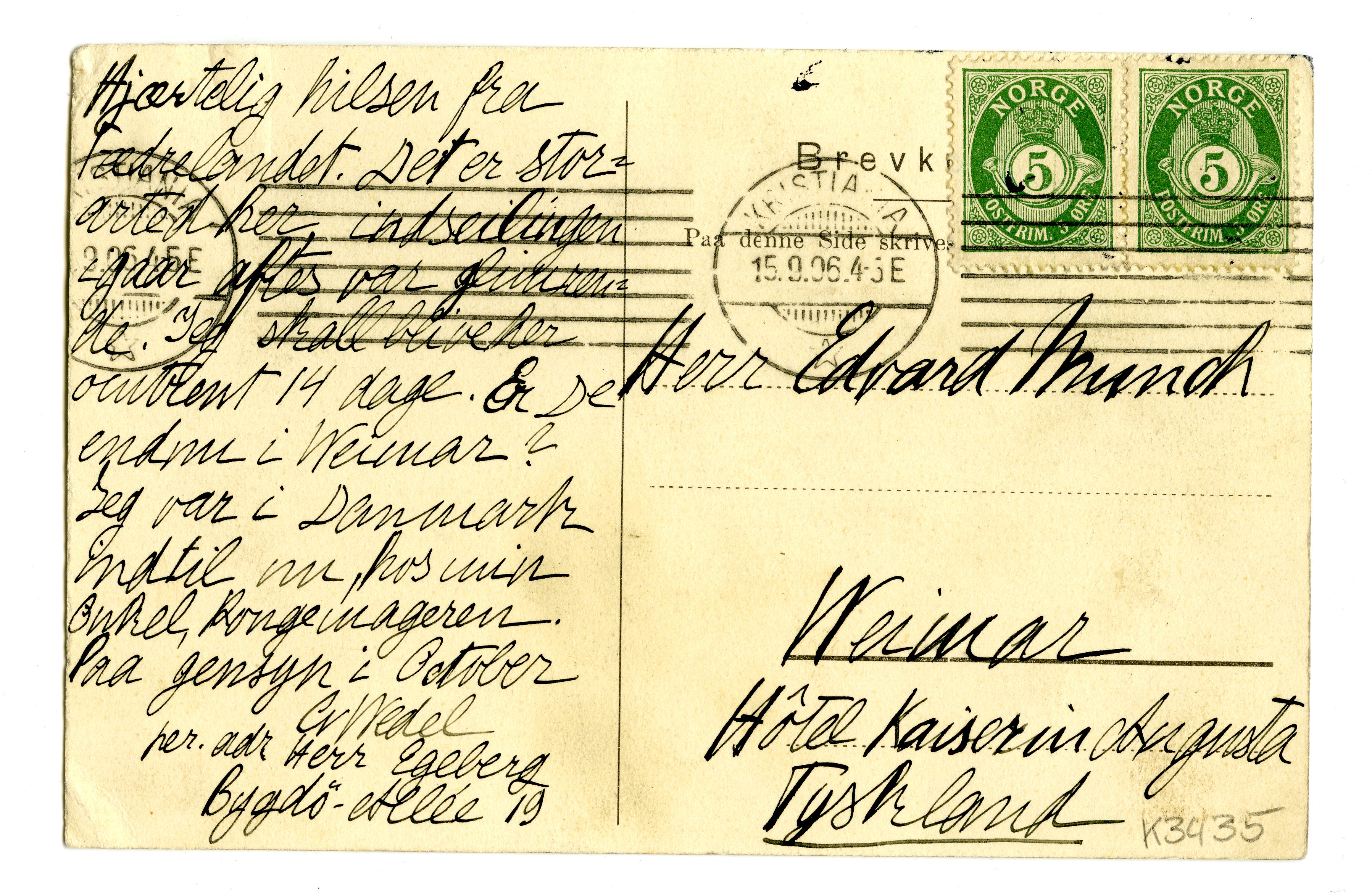 MM K 3435, Munchmuseet. Datert 15.09.1906. Brev fra Cecilie von Wedel.