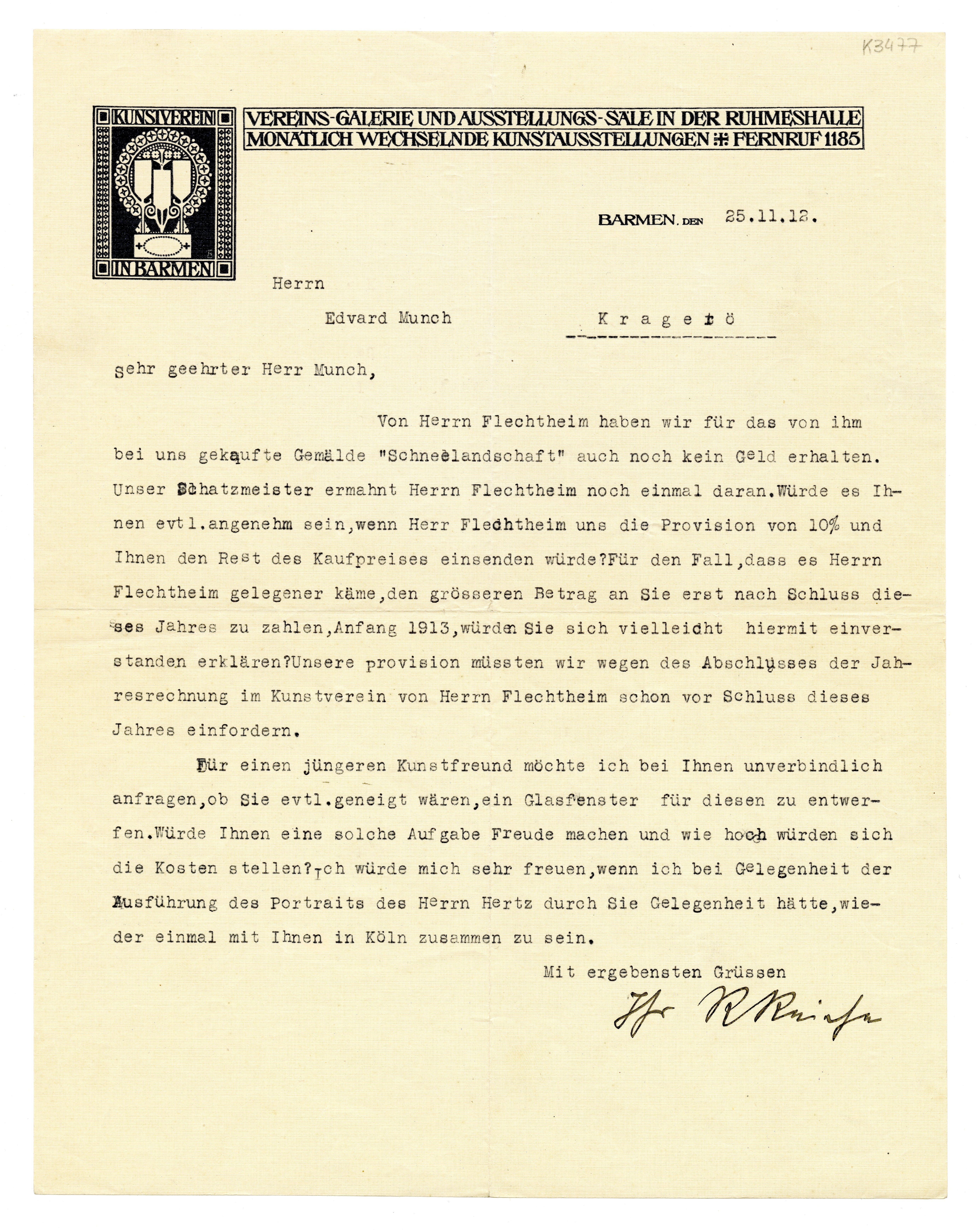 MM K 3477, Munchmuseet. Datert 25.11.1912. Brev fra Richard Reiche, Kunstverein in Barmen.