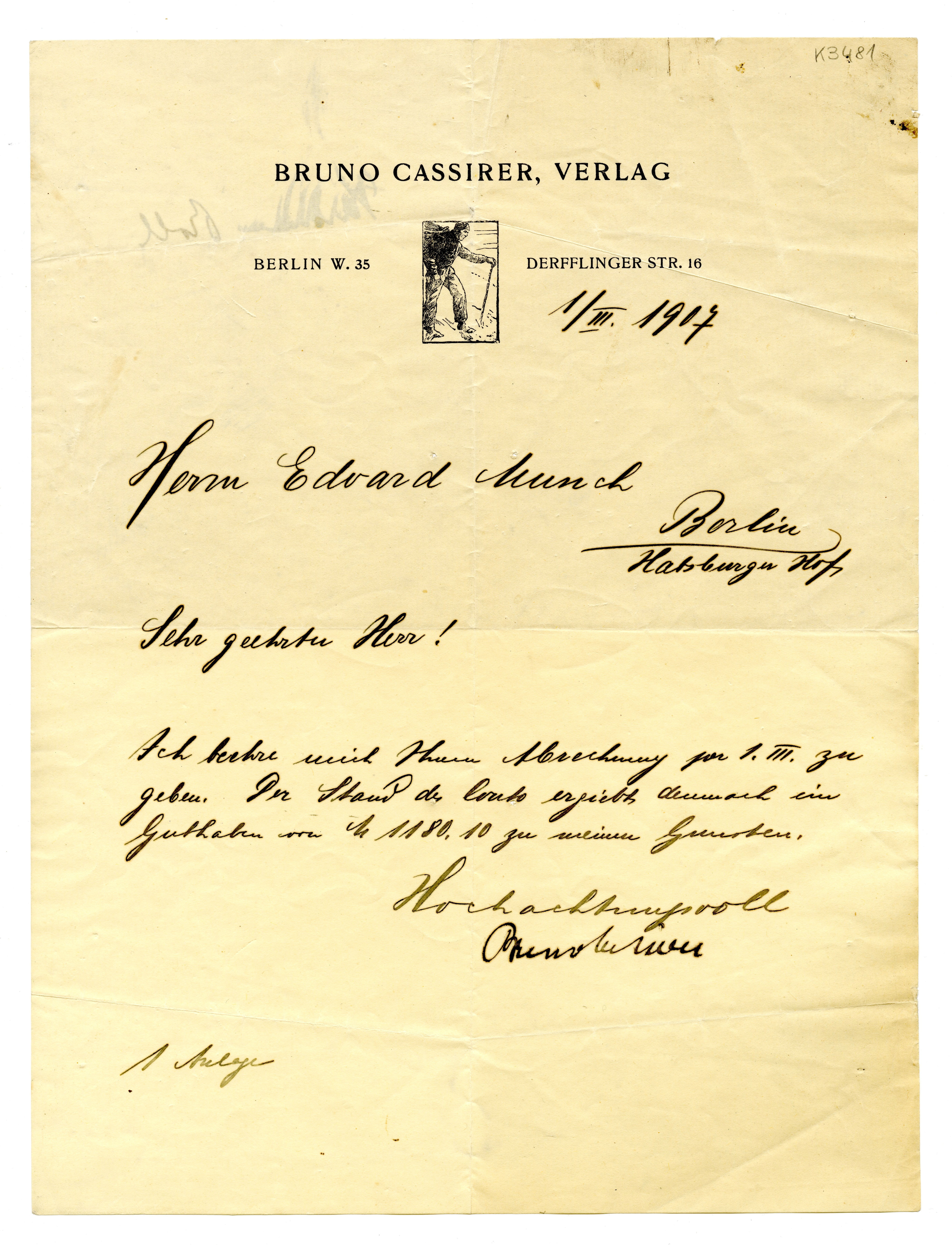 MM K 3481, Munchmuseet. Datert 01.03.1907. Brev fra Bruno Cassirer, Bruno Cassirer Verlag.