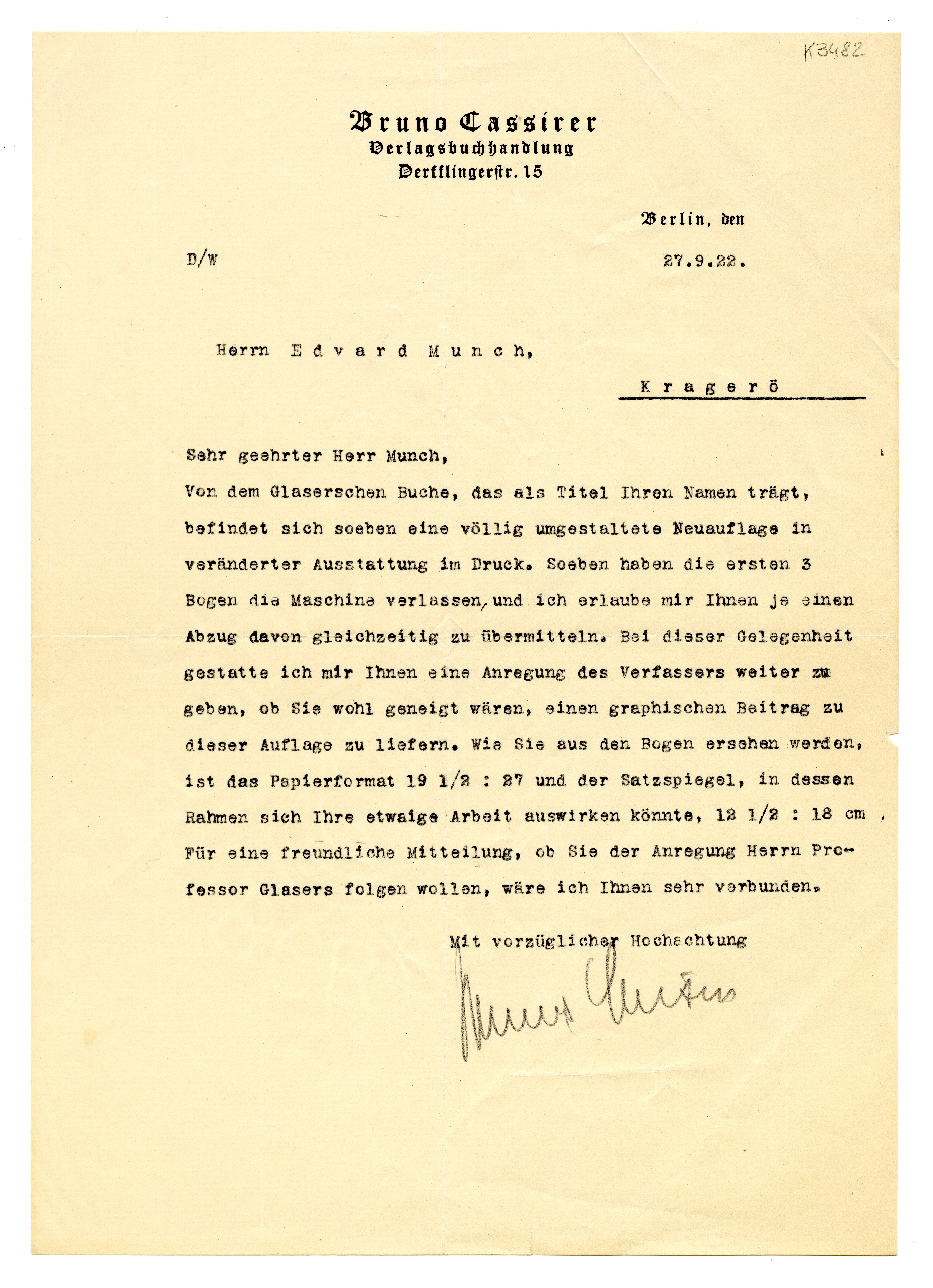 MM K 3482, Munchmuseet. Datert 27.09.1922. Brev fra Bruno Cassirer, Bruno Cassirer Verlag.