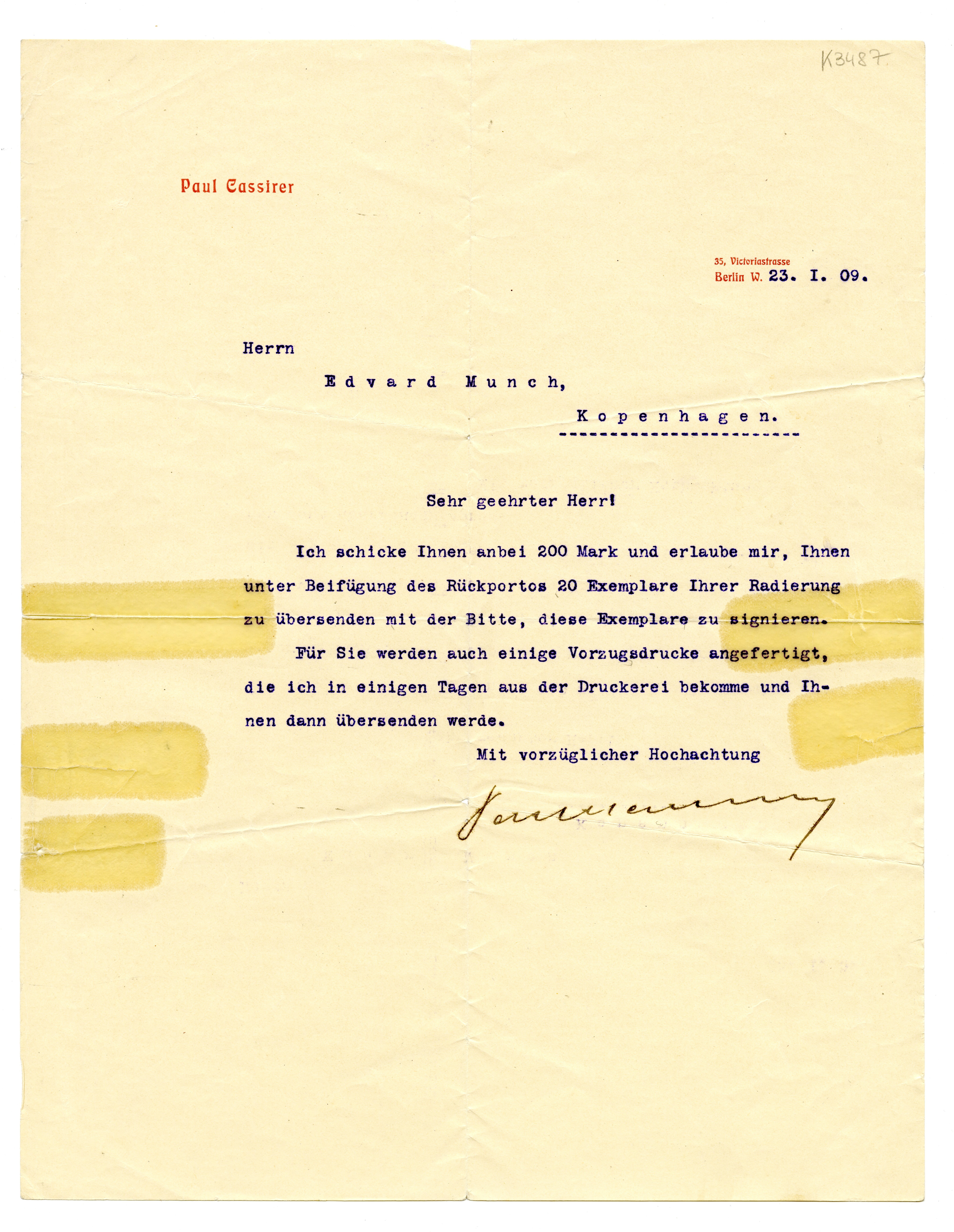 MM K 3487, Munchmuseet. Datert 23.01.1909. Brev fra Paul Cassirer, Paul Cassirer Kunst-ausstellung und Verlagsanstalt.