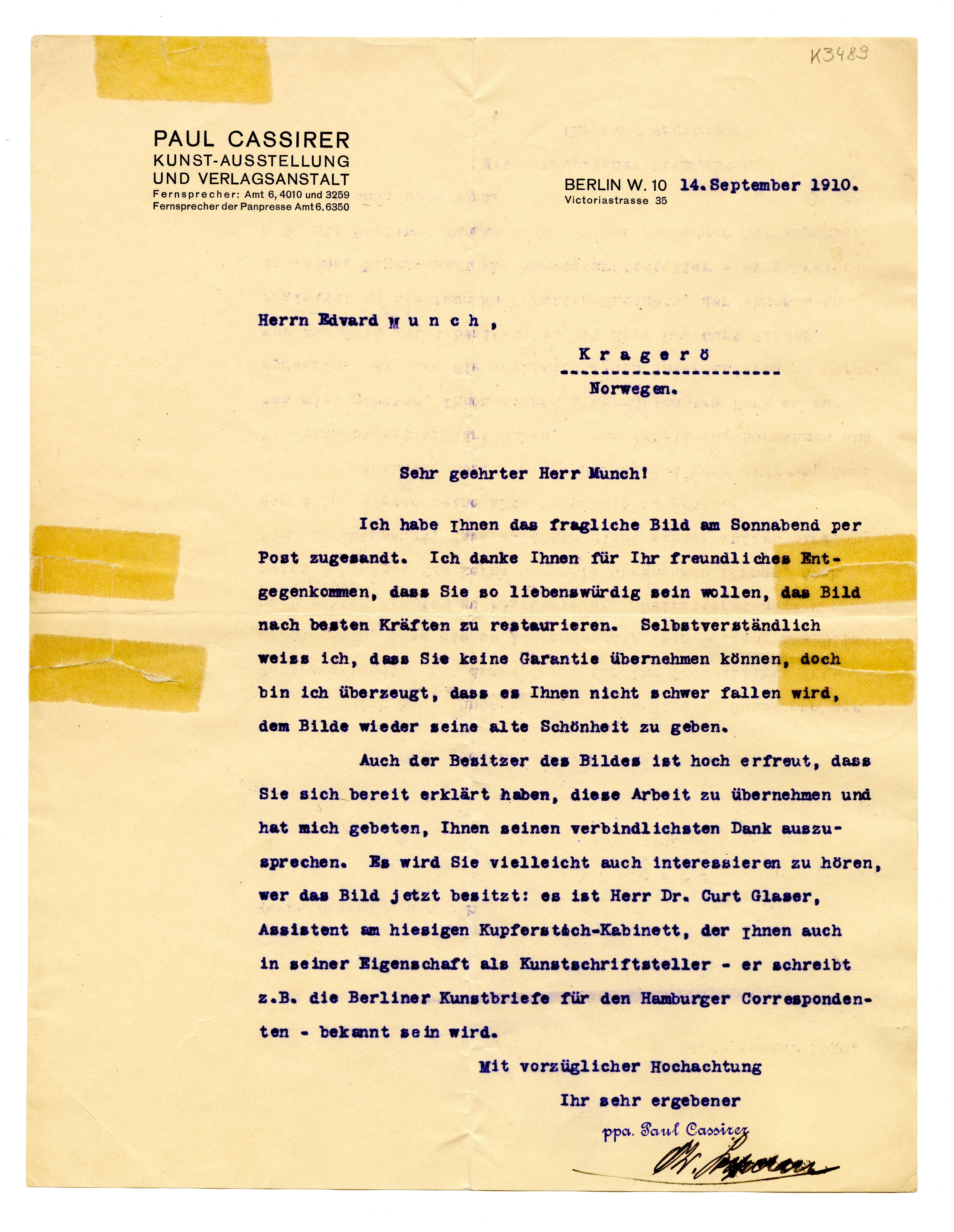 MM K 3489, Munchmuseet. Datert 14.09.1910. Brev fra Paul Cassirer, Paul Cassirer Kunst-ausstellung und Verlagsanstalt.