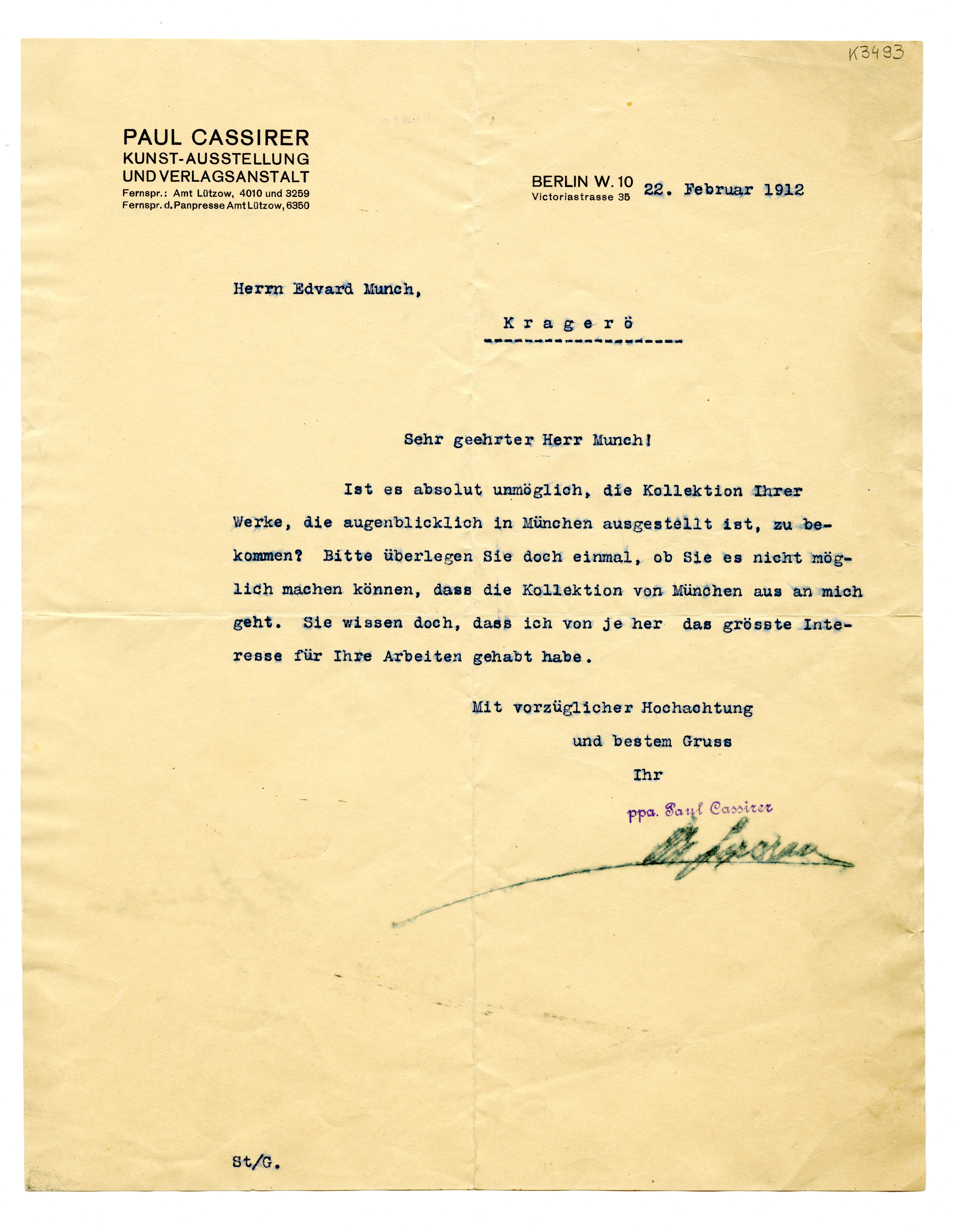 MM K 3493, Munchmuseet. Datert 22.02.1912. Brev fra Paul Cassirer, Paul Cassirer Kunst-ausstellung und Verlagsanstalt.