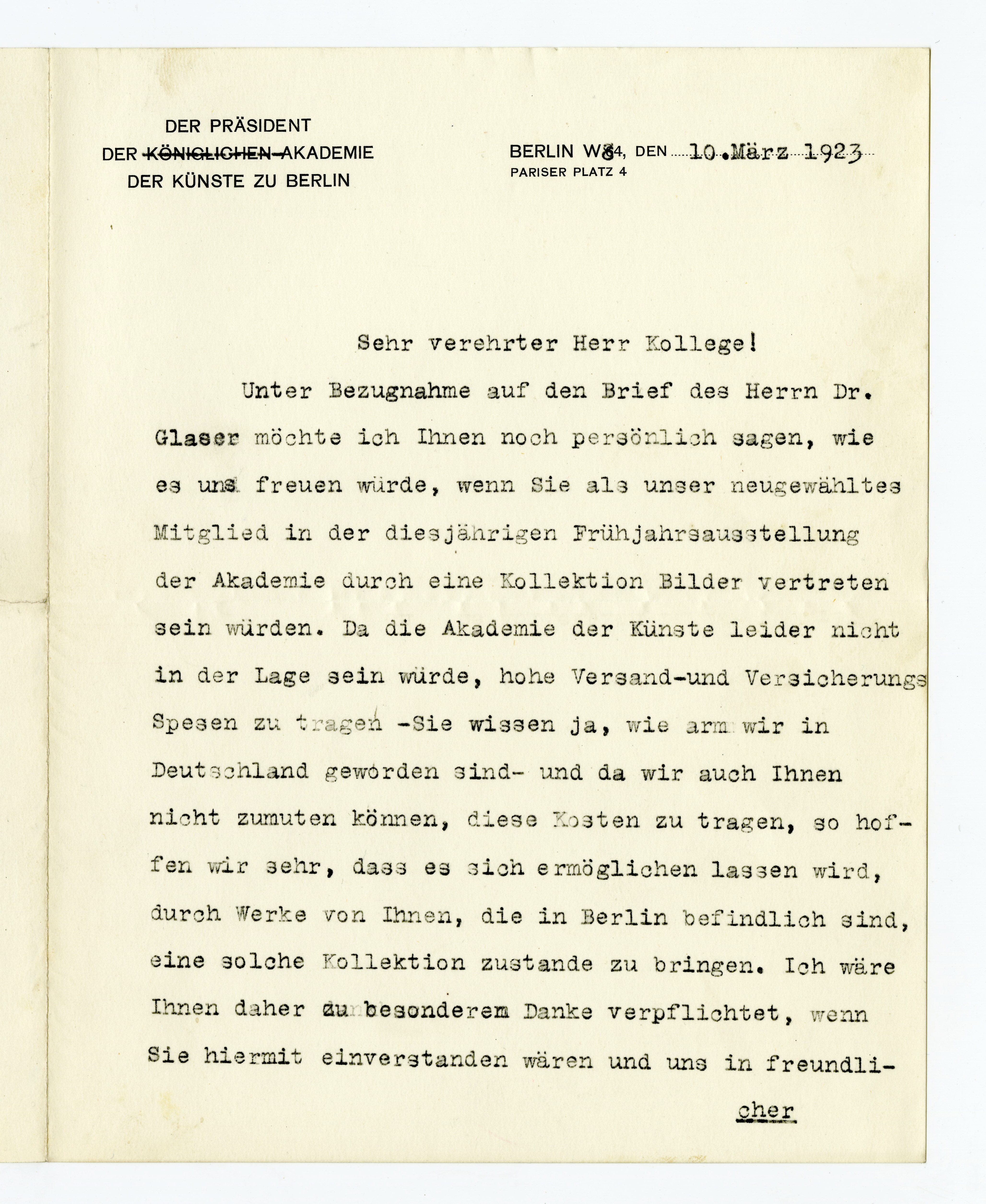 MM K 3508, Munchmuseet. Datert 10.03.1923. Brev fra Max Liebermann, Akademie Der Künste zu Berlin.