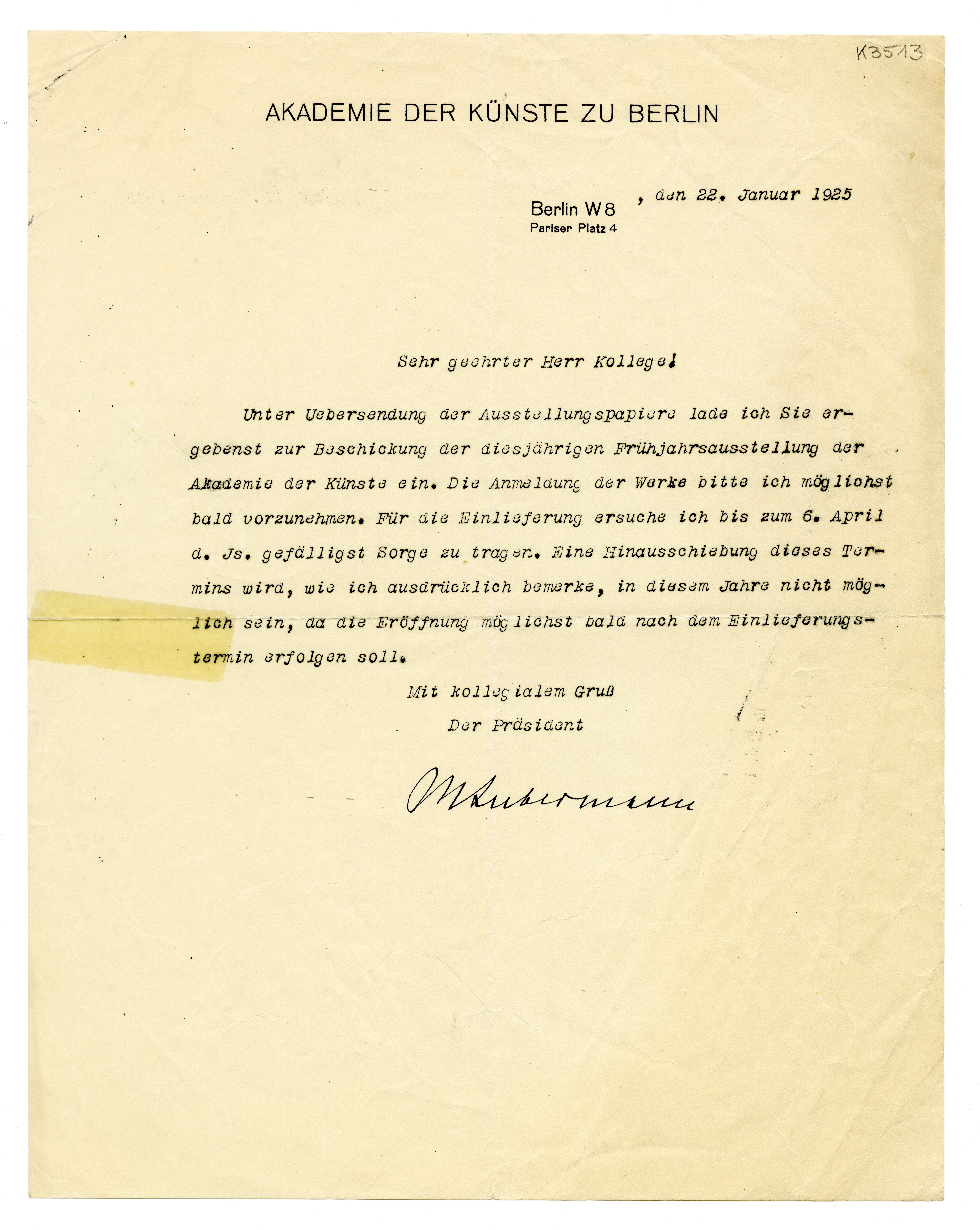 MM K 3513, Munchmuseet. Datert 22.01.1925. Brev fra Max Liebermann, Akademie Der Künste zu Berlin.