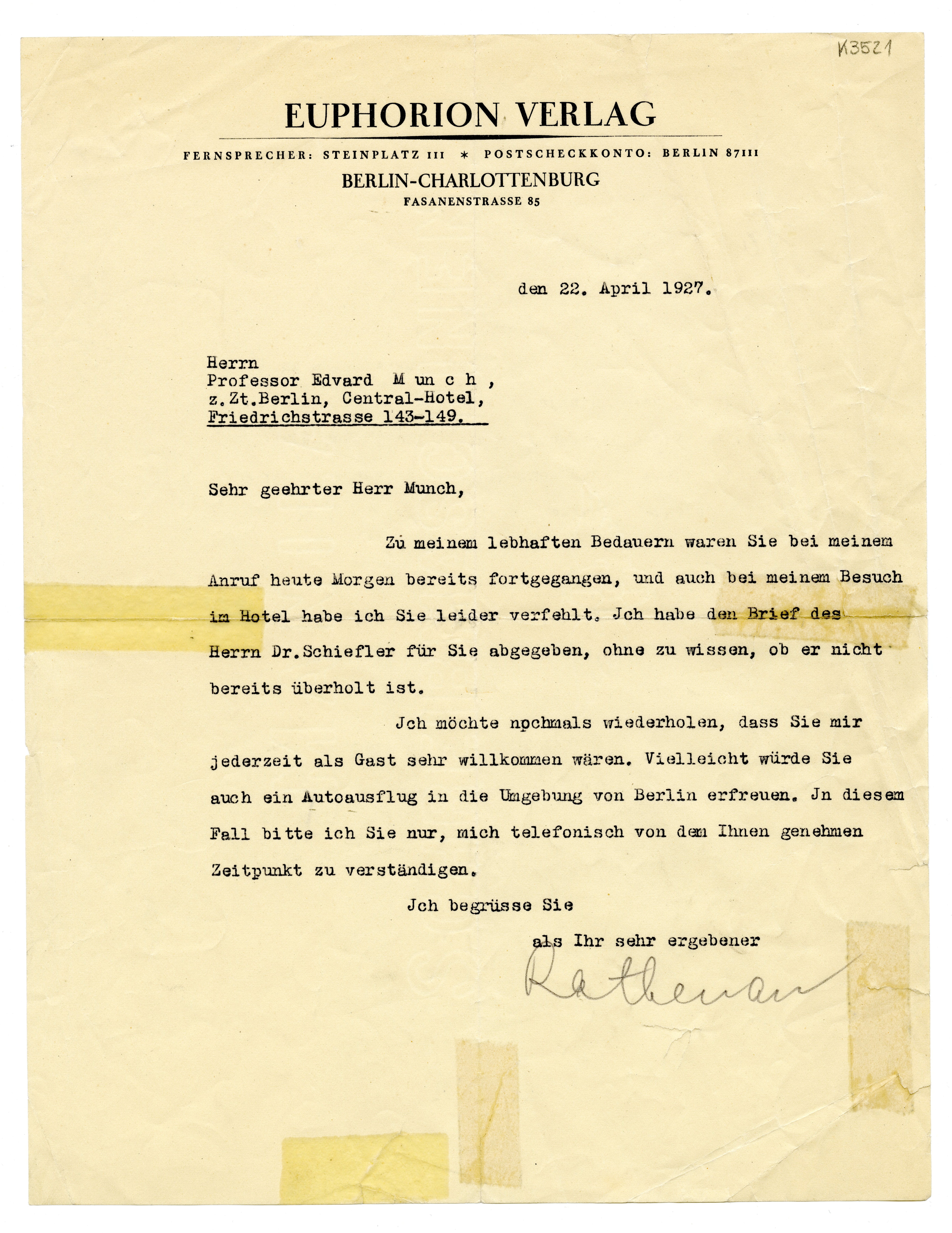 MM K 3521, Munchmuseet. Datert 22.04.1927. Brev fra Ernst Rathenau, Euphorion Verlag.