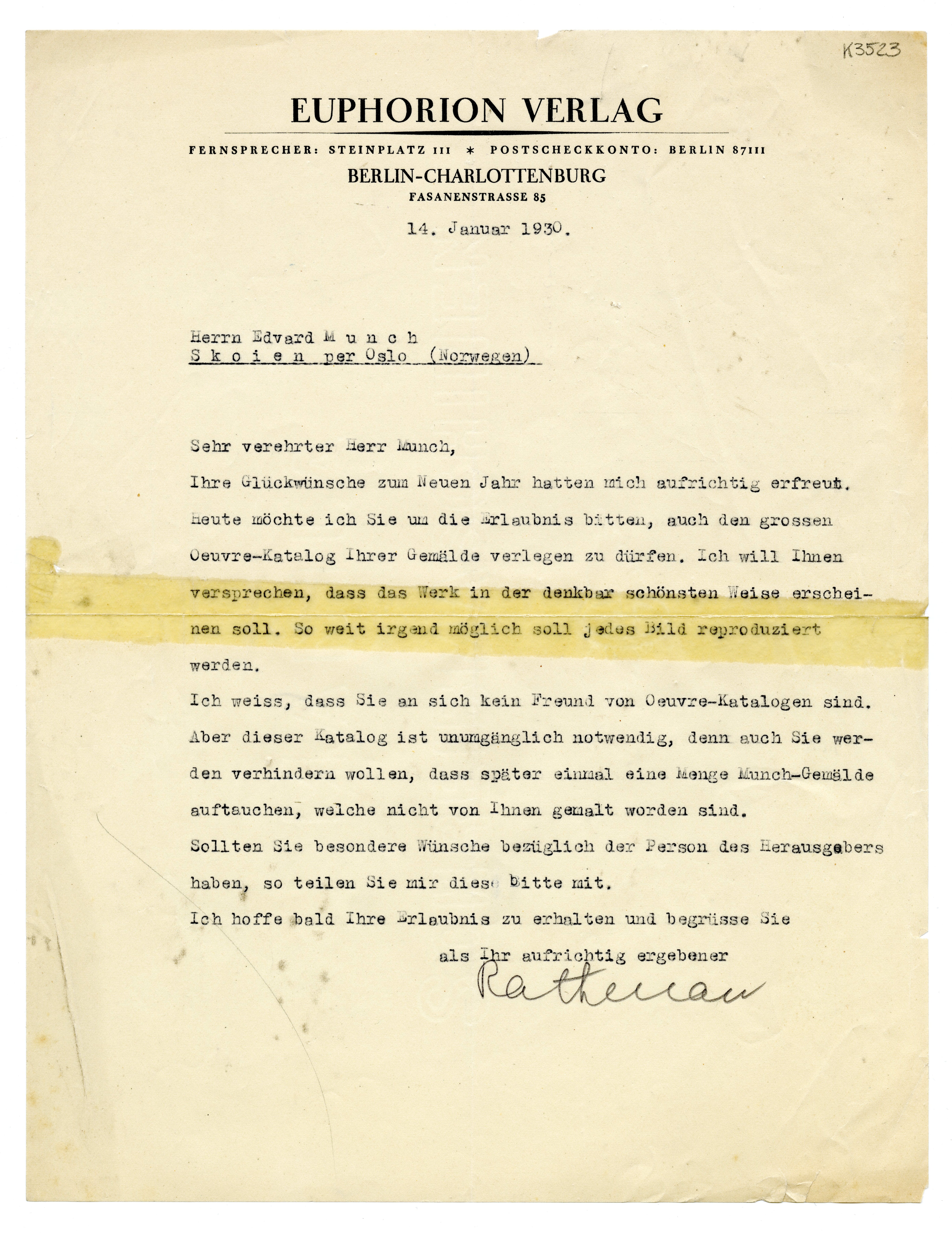 MM K 3523, Munchmuseet. Datert 14.01.1930. Brev fra Ernst Rathenau, Euphorion Verlag.