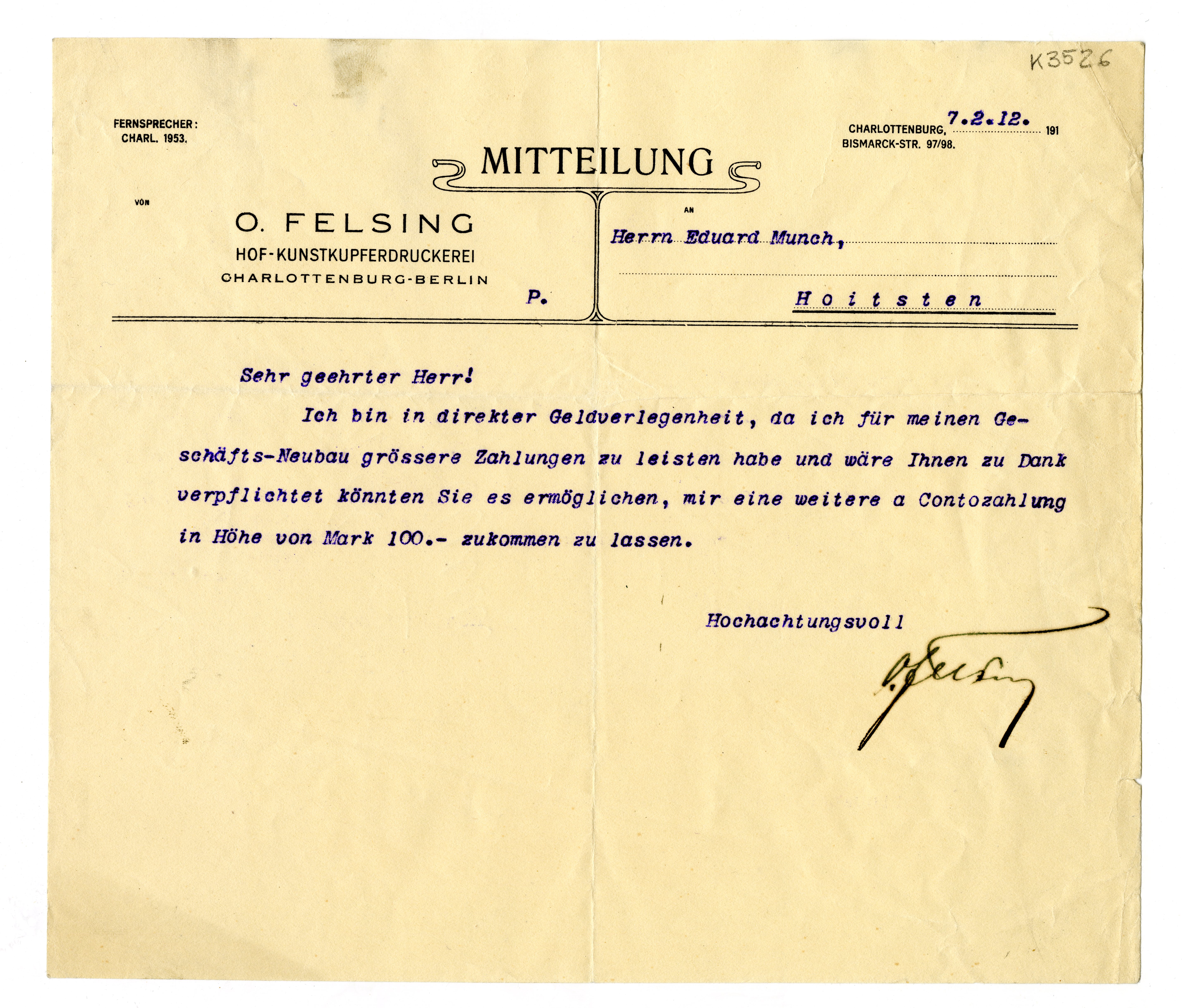 MM K 3526, Munchmuseet. Datert 07.02.1912. Brev fra Wilhelm Felsing, Hof-Kunstkupferdruckerei O. Felsing.