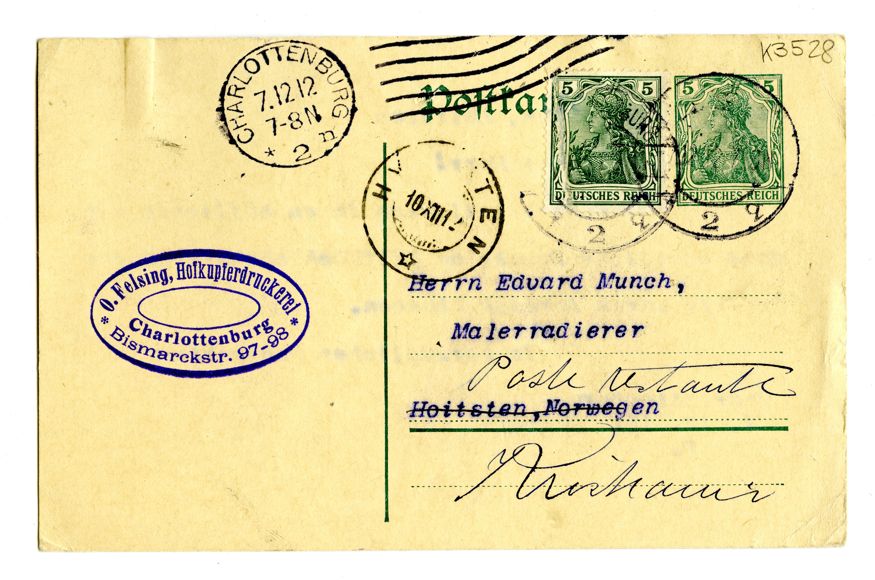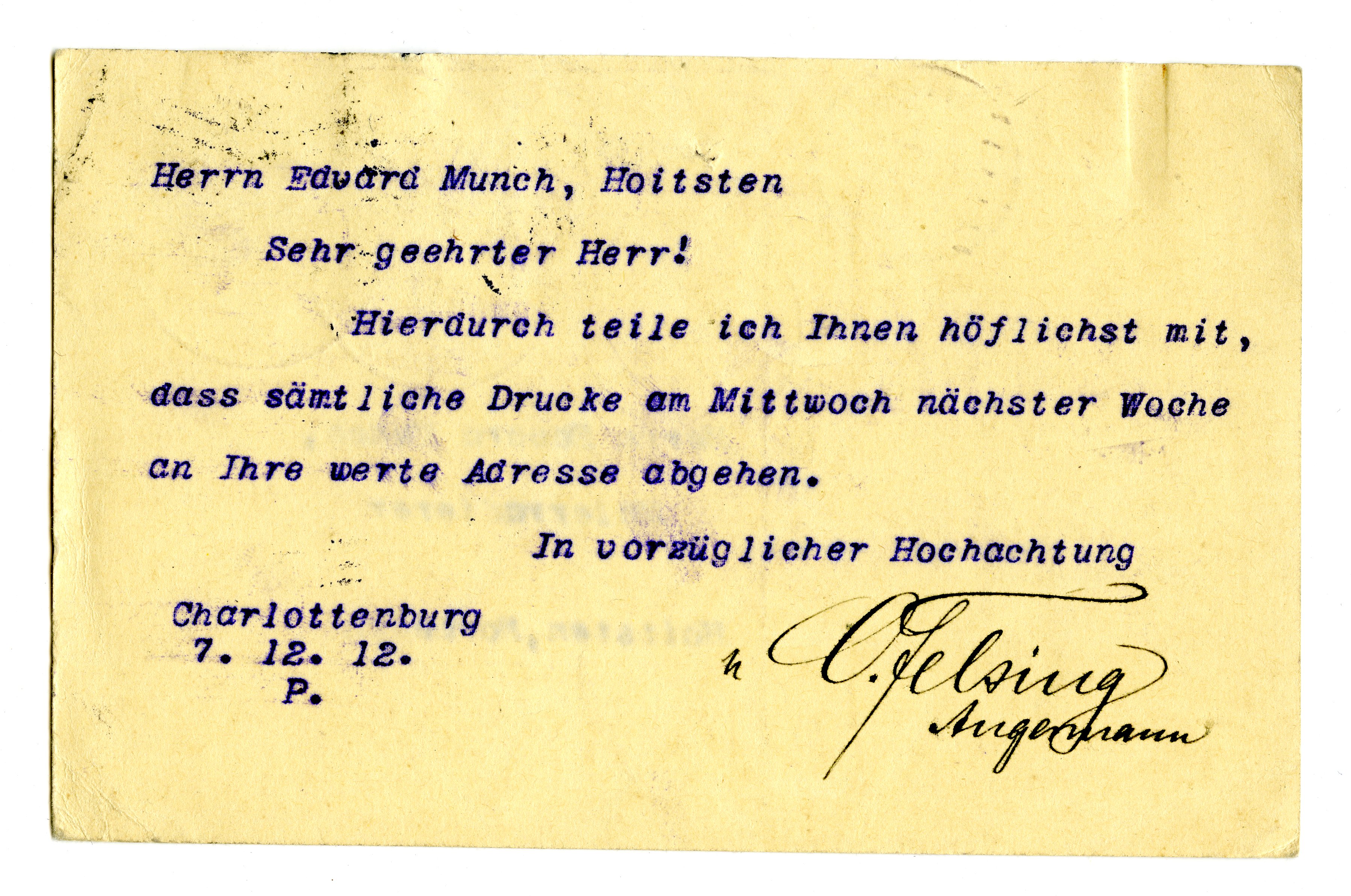 MM K 3528, Munchmuseet. Datert 07.12.1912. Brev fra Wilhelm Felsing, Hof-Kunstkupferdruckerei O. Felsing.