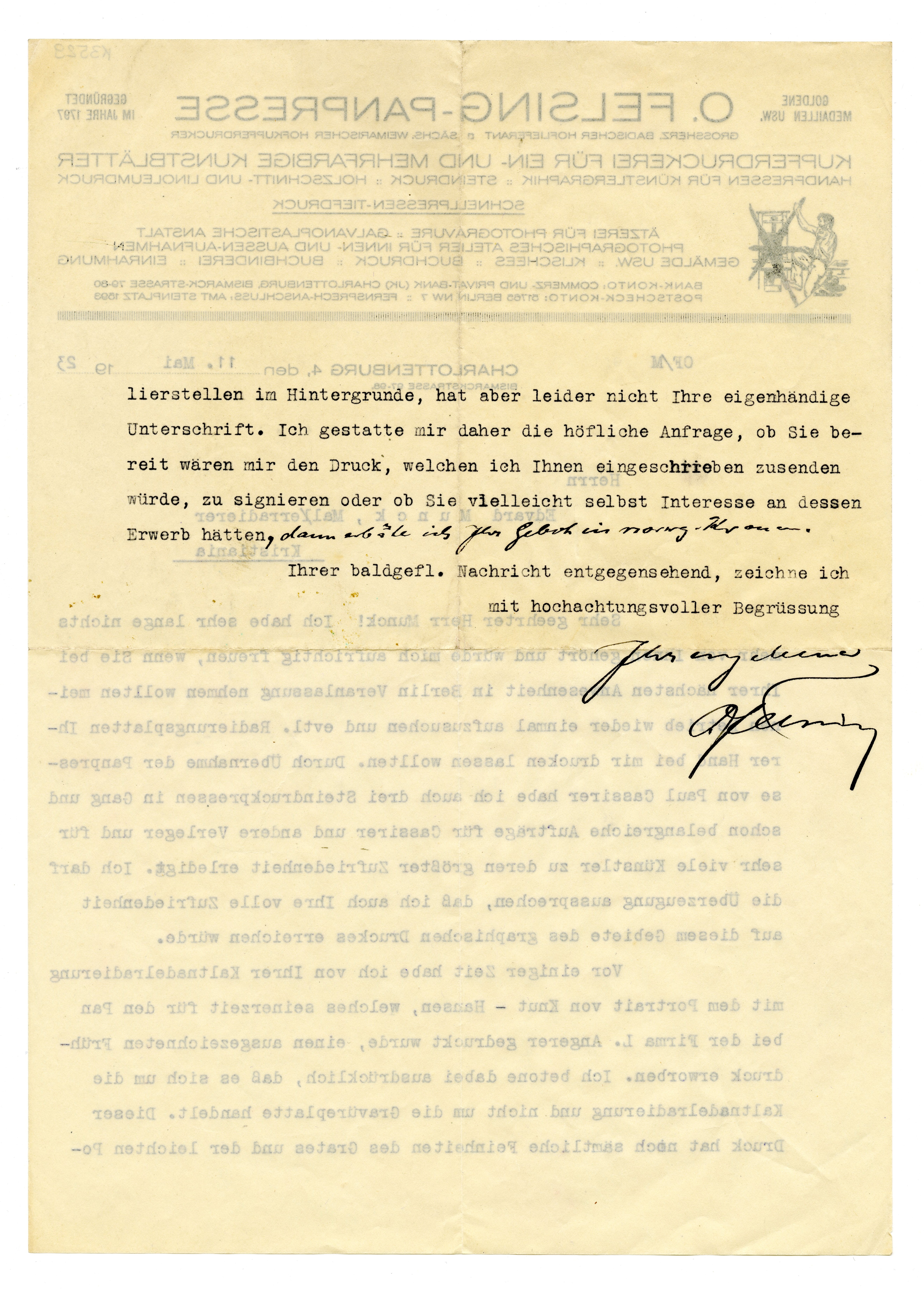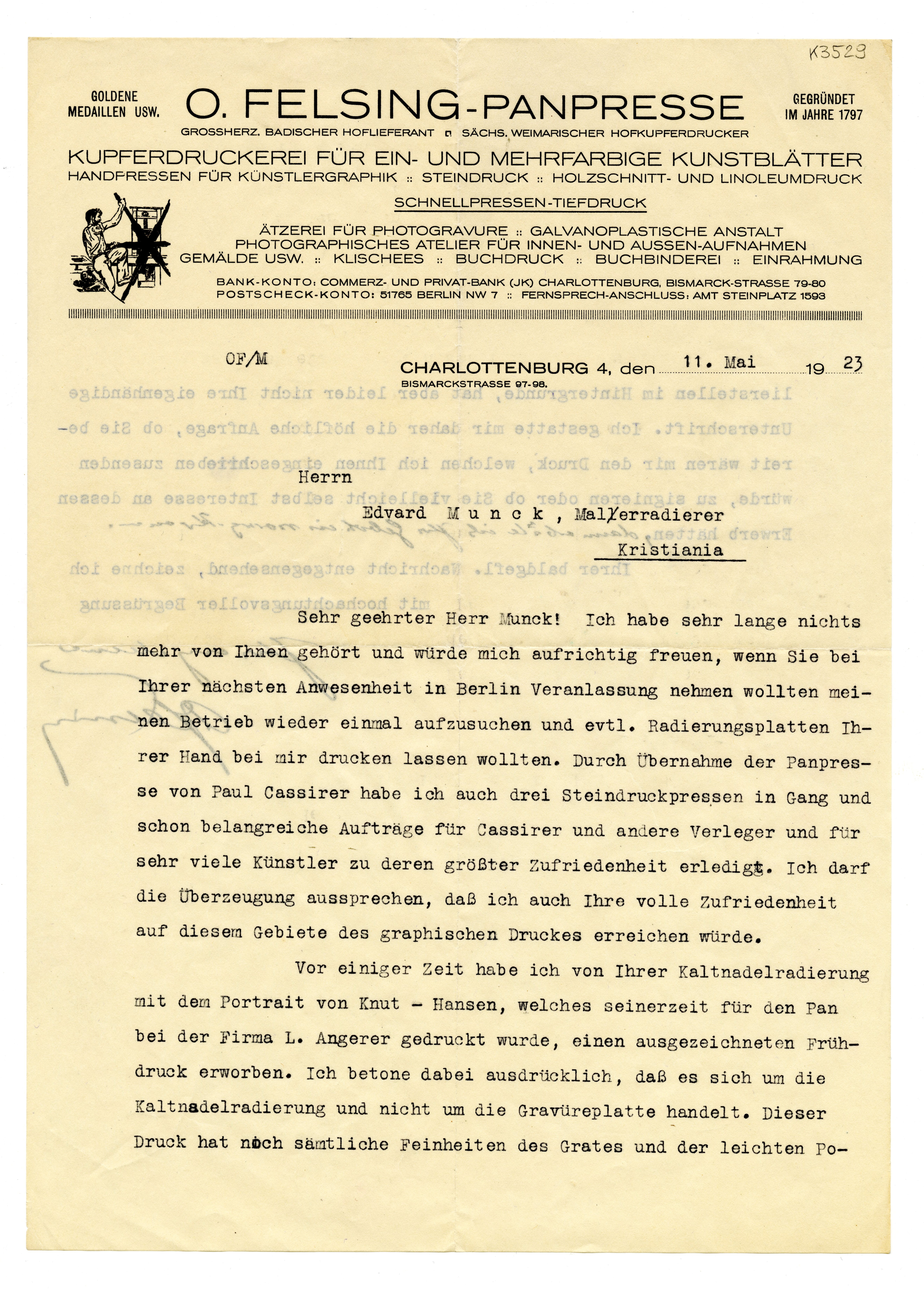 MM K 3529, Munchmuseet. Datert 11.05.1923. Brev fra Wilhelm Felsing, Hof-Kunstkupferdruckerei O. Felsing.