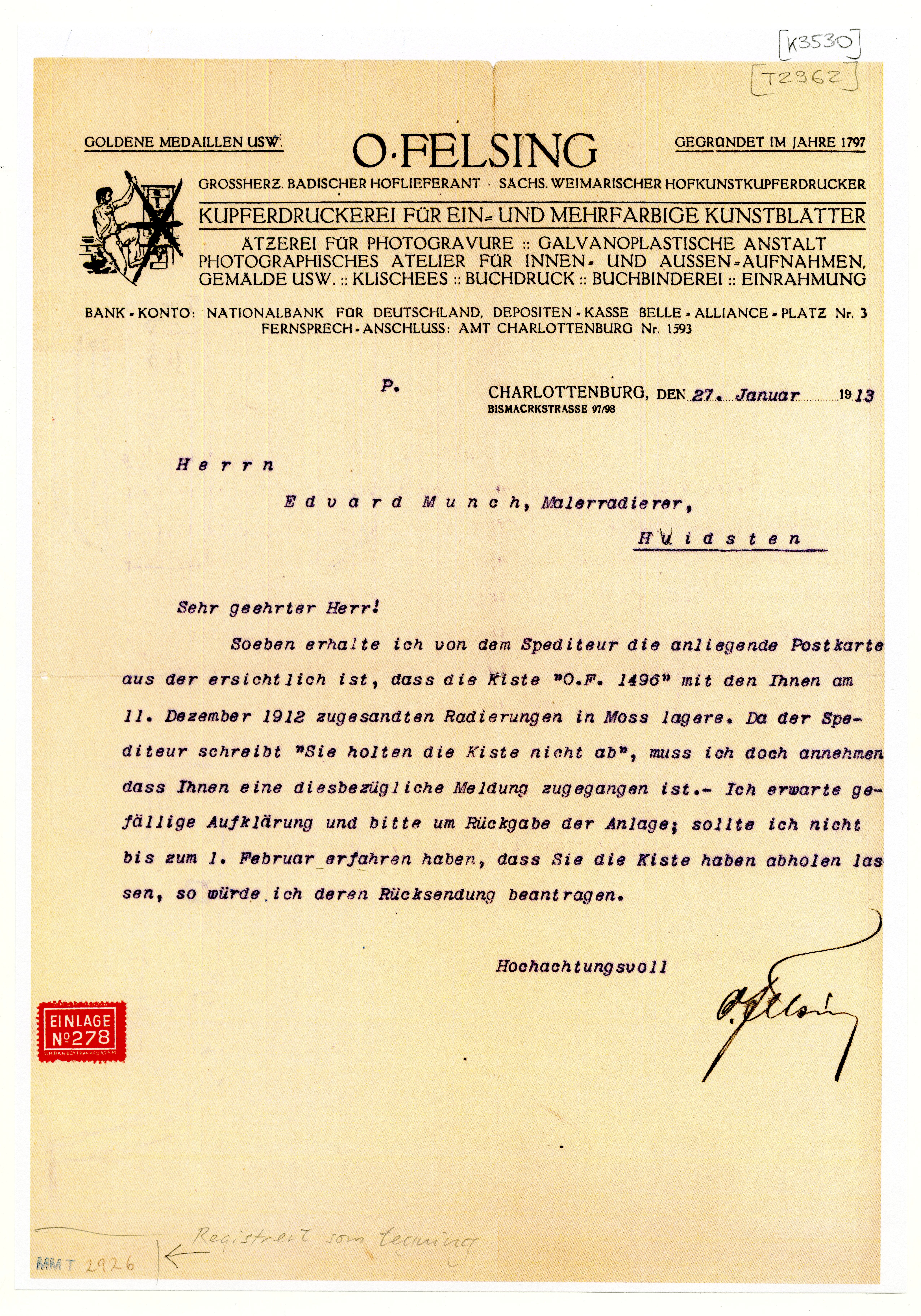 MM K 3530, Munchmuseet. Datert 27.01.1913. Brev fra Wilhelm Felsing, Hof-Kunstkupferdruckerei O. Felsing.