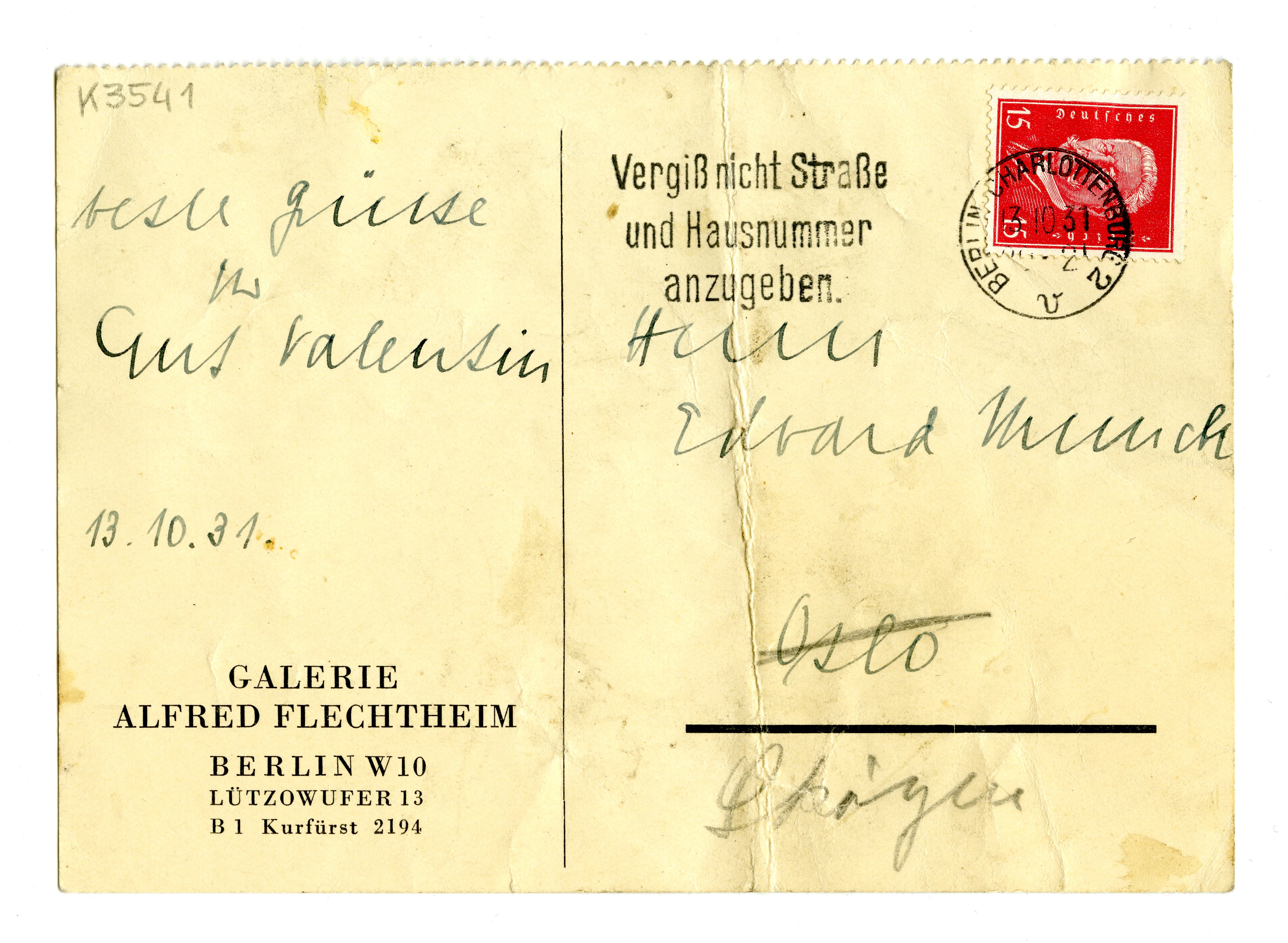 MM K 3541, Munchmuseet. Datert 13.10.1931. Brev fra Galerie Alfred Flechtheim, Curt Valentin.