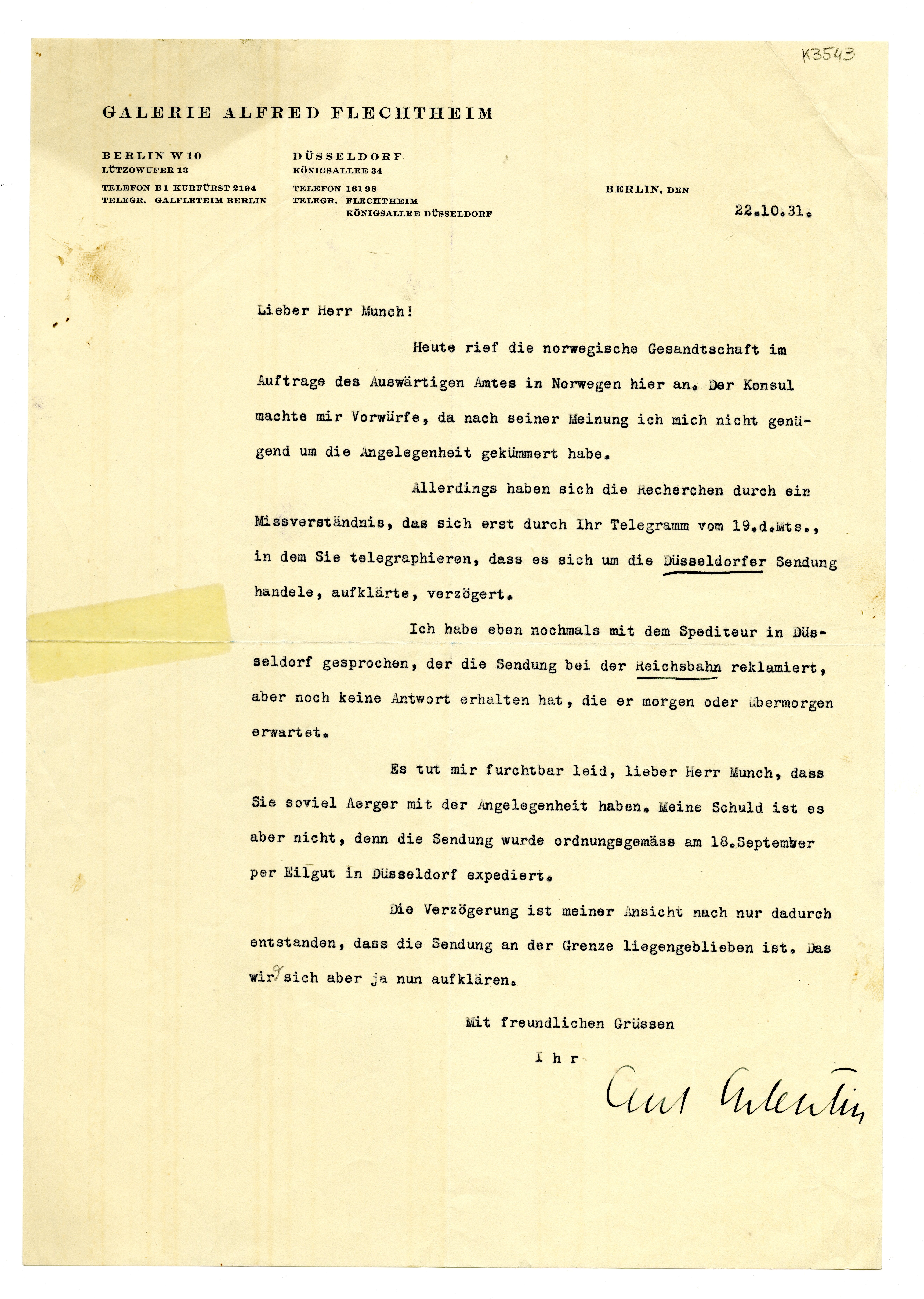 MM K 3543, Munchmuseet. Datert 22.10.1931. Brev fra Galerie Alfred Flechtheim, Curt Valentin.
