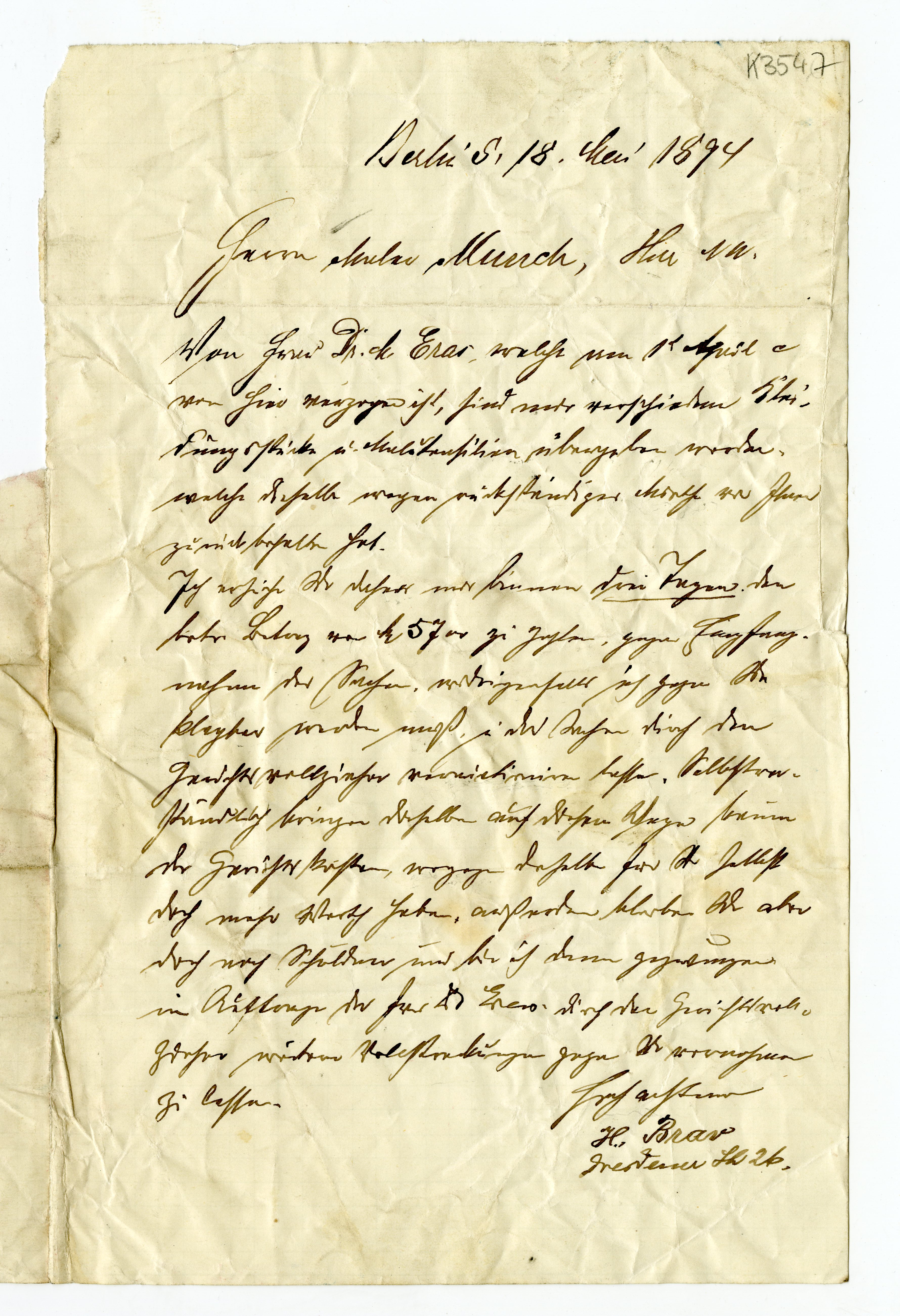 MM K 3547, Munchmuseet. Datert 18.05.1894. Brev fra H. Brav, pensjoner m. v. Hotellet.