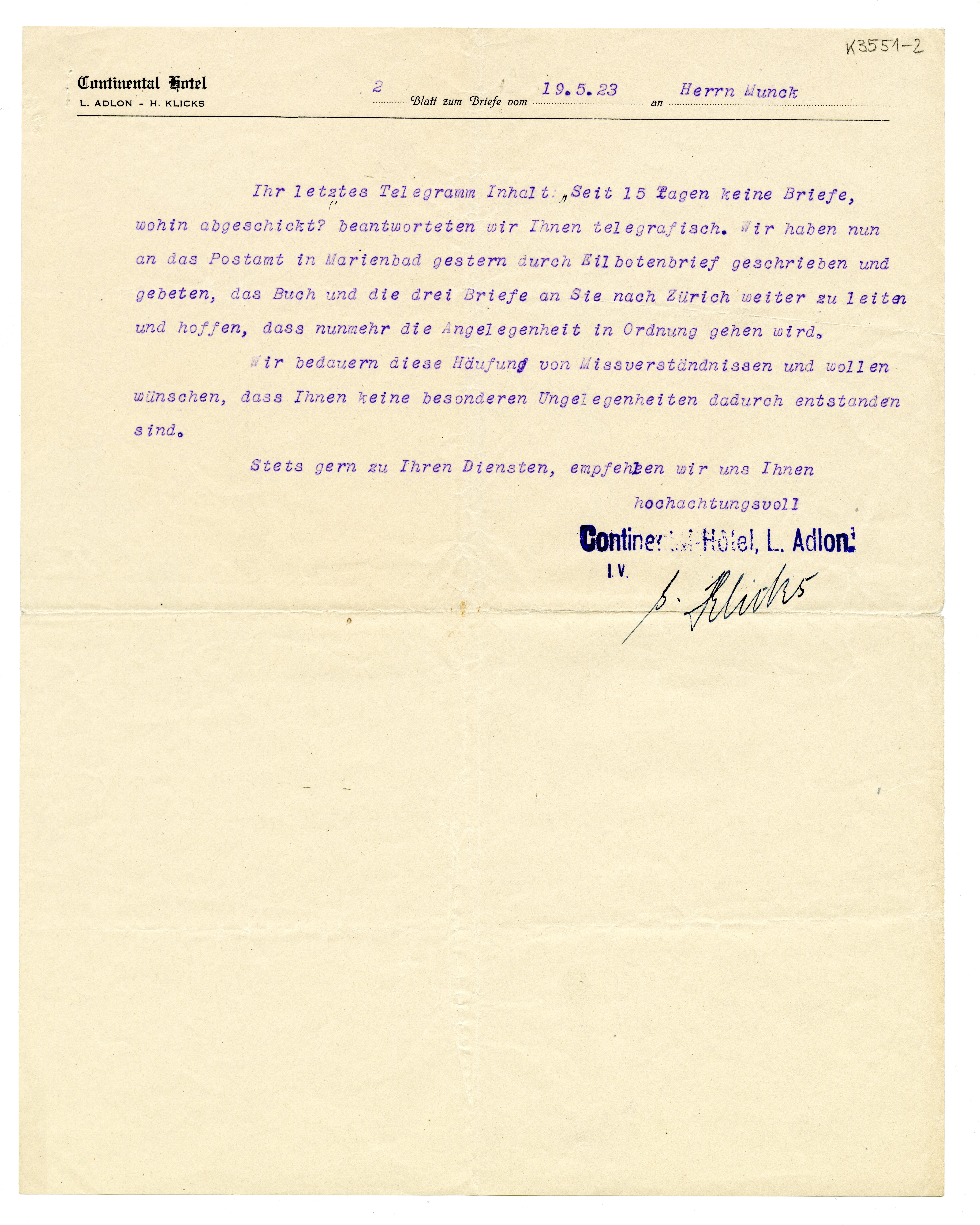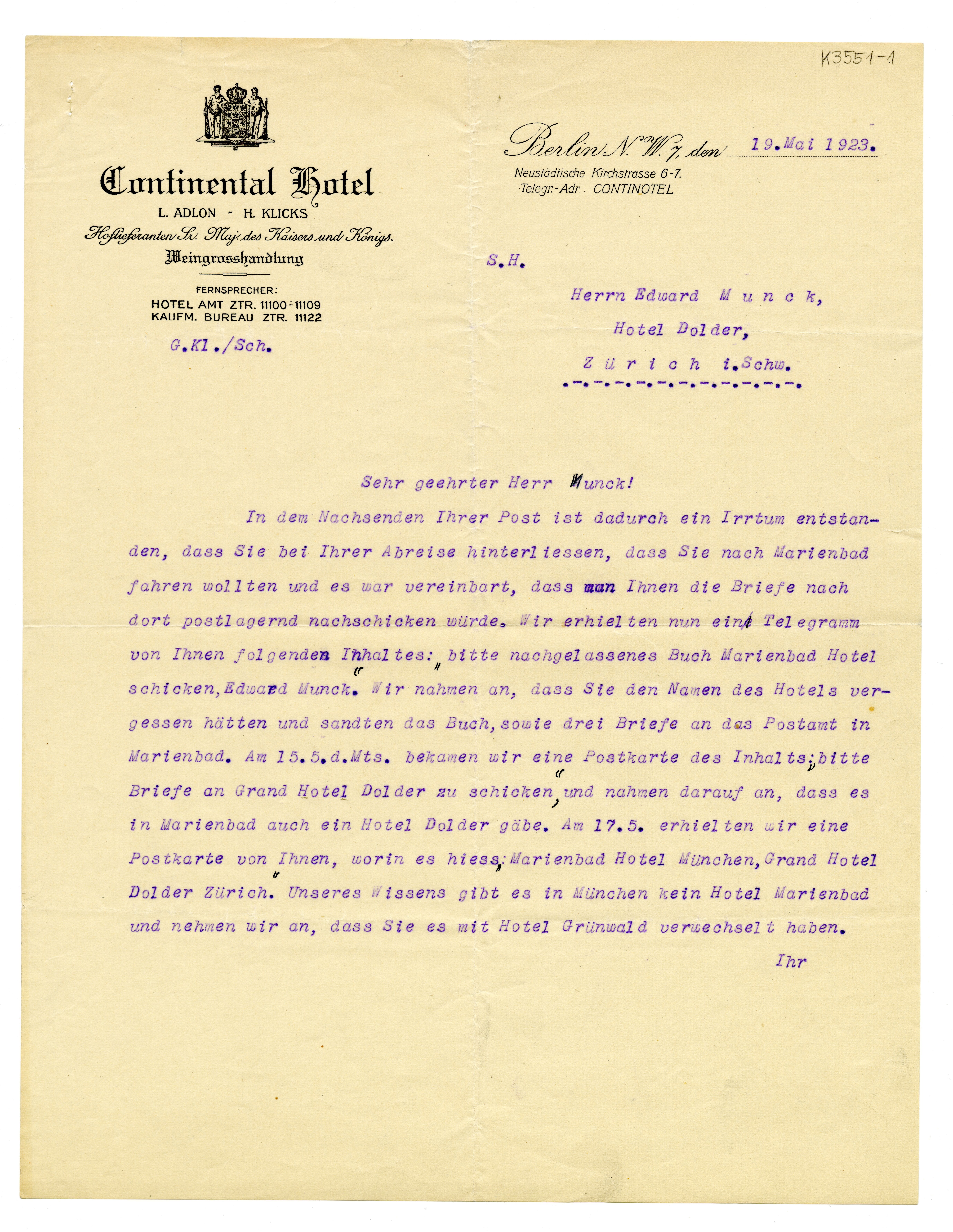 MM K 3551, Munchmuseet. Datert 19.05.1923. Brev fra L. Adlon Continental-Hotel.