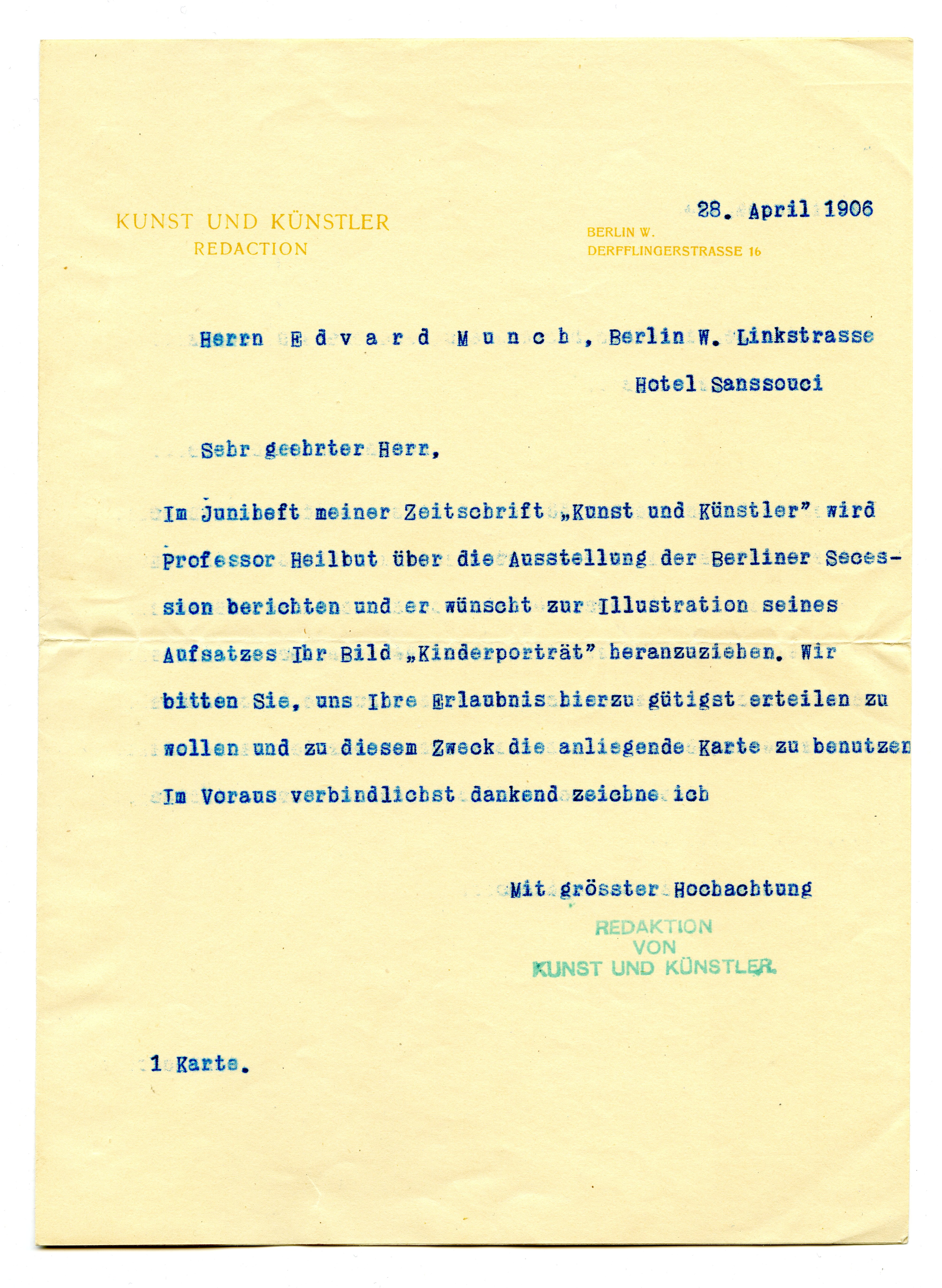 MM K 3561, Munchmuseet. Datert 28.04.1906. Brev fra Kunst und Künstler.