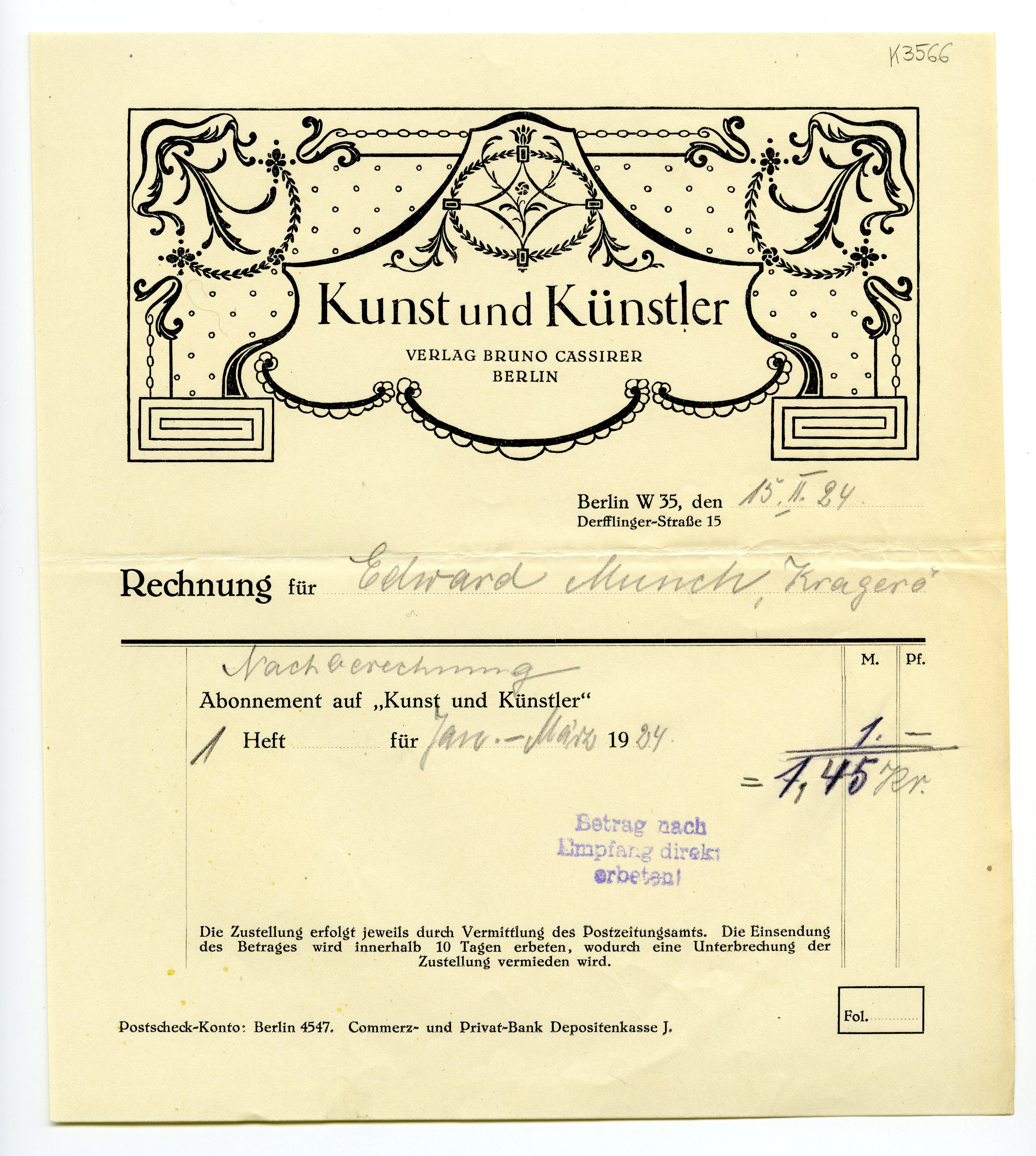MM K 3566, Munchmuseet. Datert 15.02.1924. Brev fra Karl Scheffler, Kunst und Künstler.