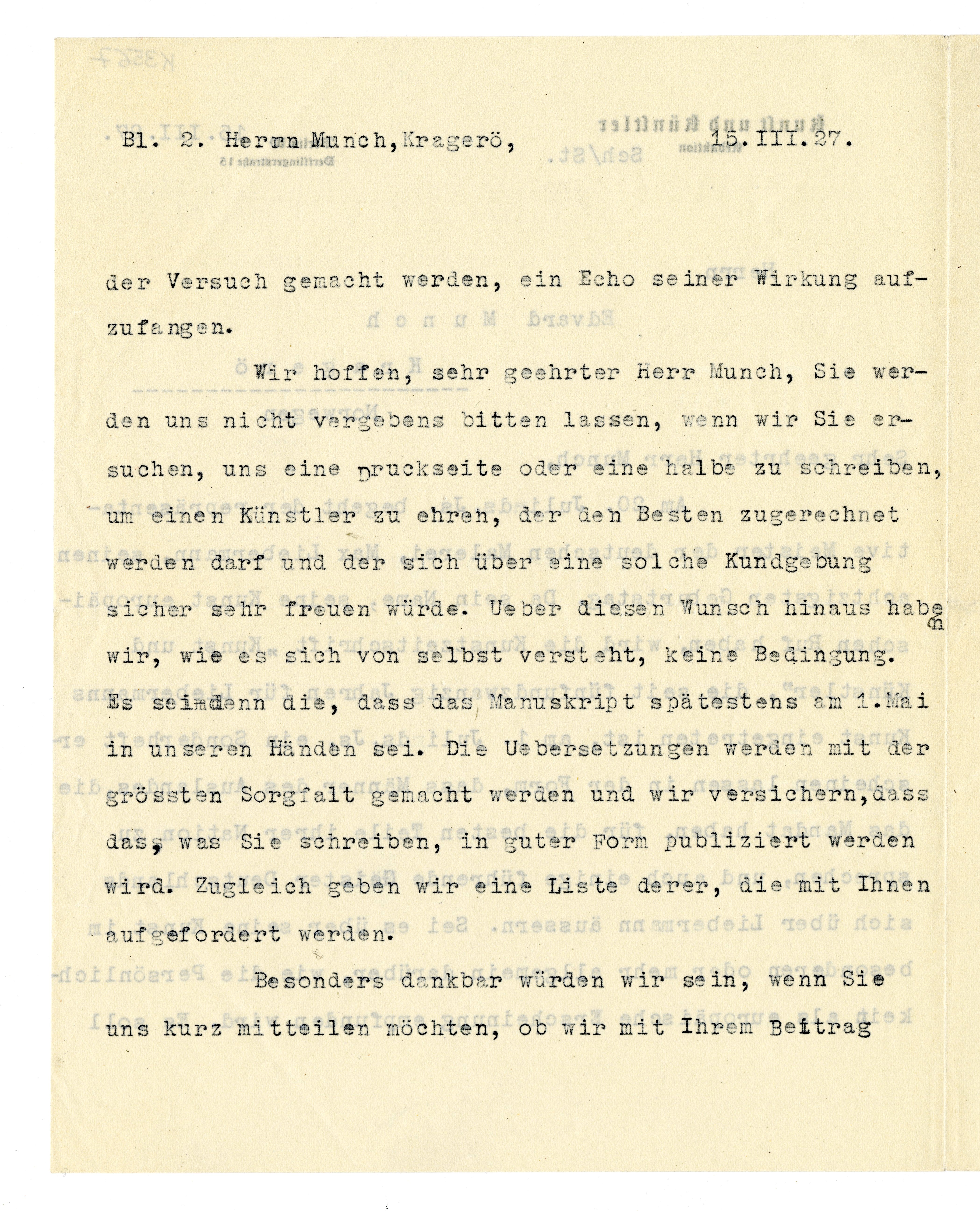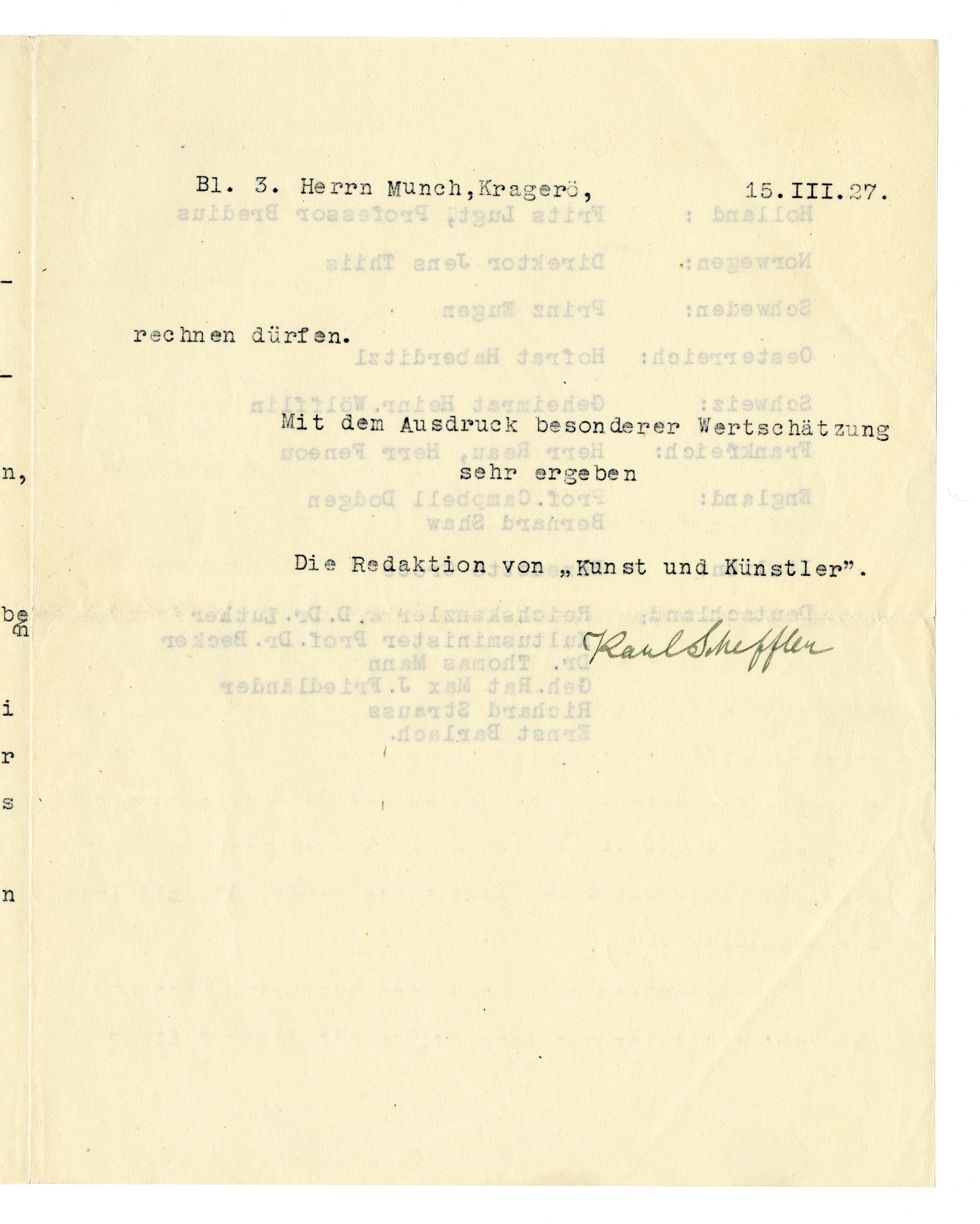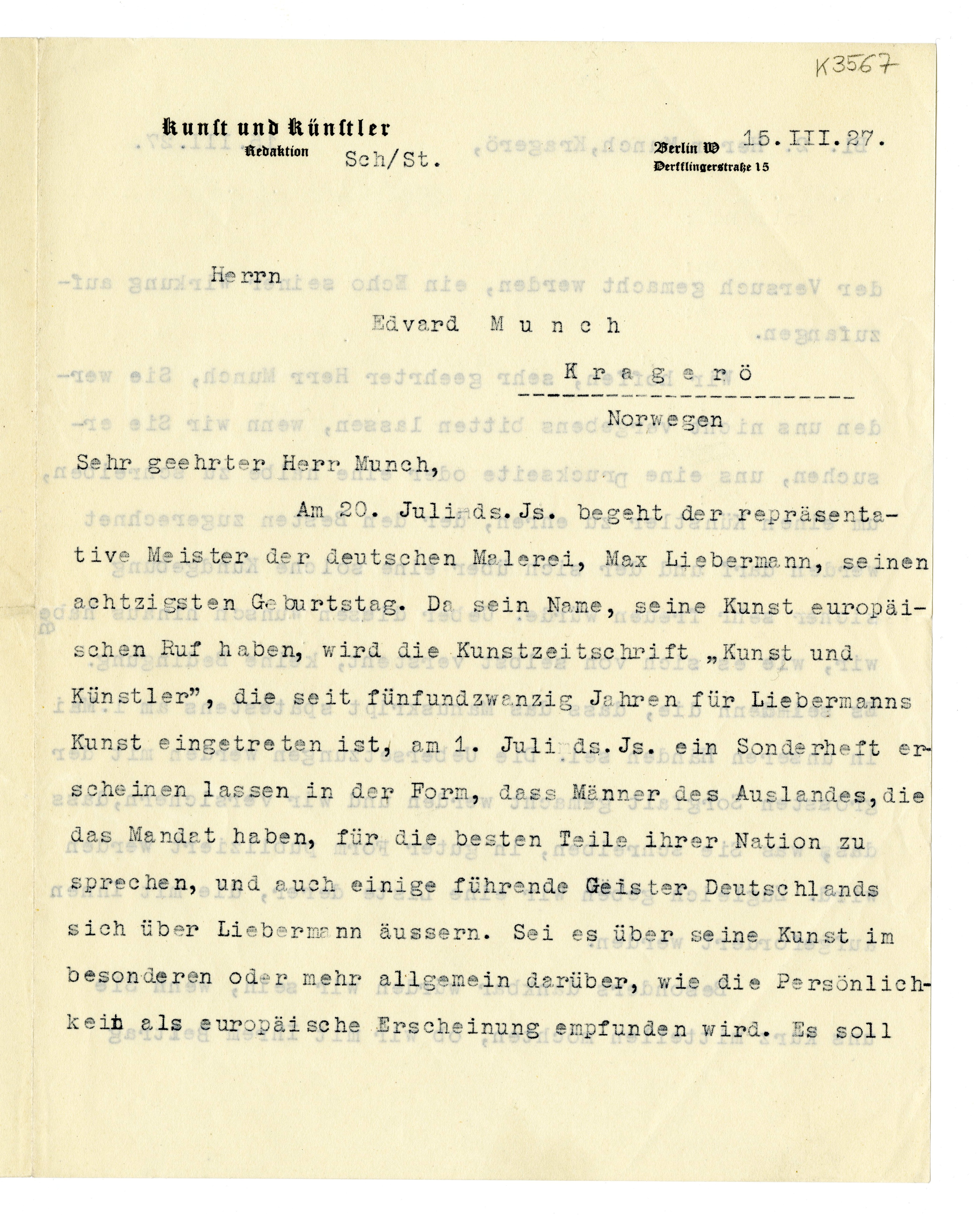 MM K 3567, Munchmuseet. Datert 15.03.1927. Brev fra Karl Scheffler, Kunst und Künstler.