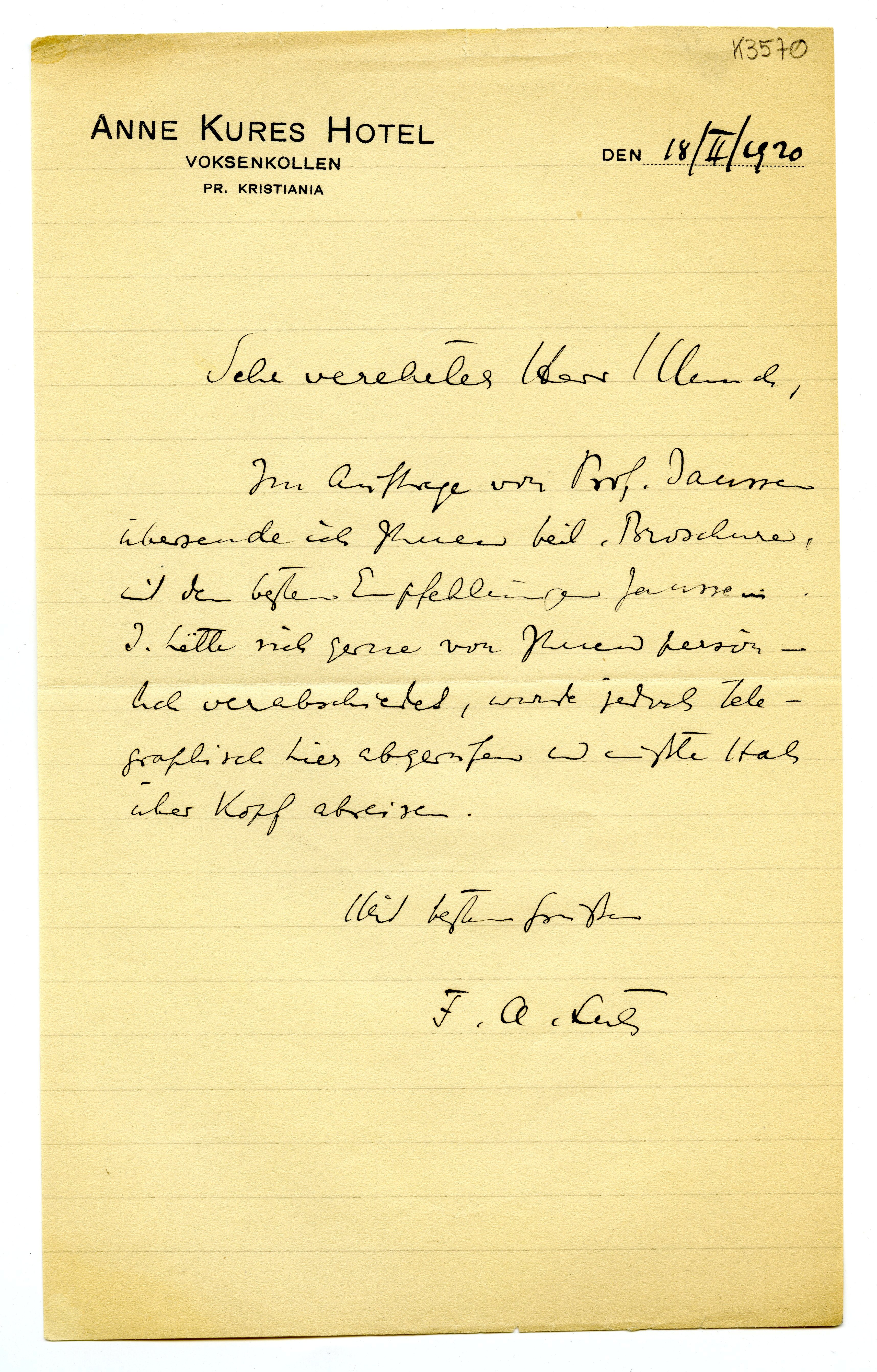 MM K 3570, Munchmuseet. Datert 18.02.1920. Brev fra F.A. Lutz, F.A. Galerie.