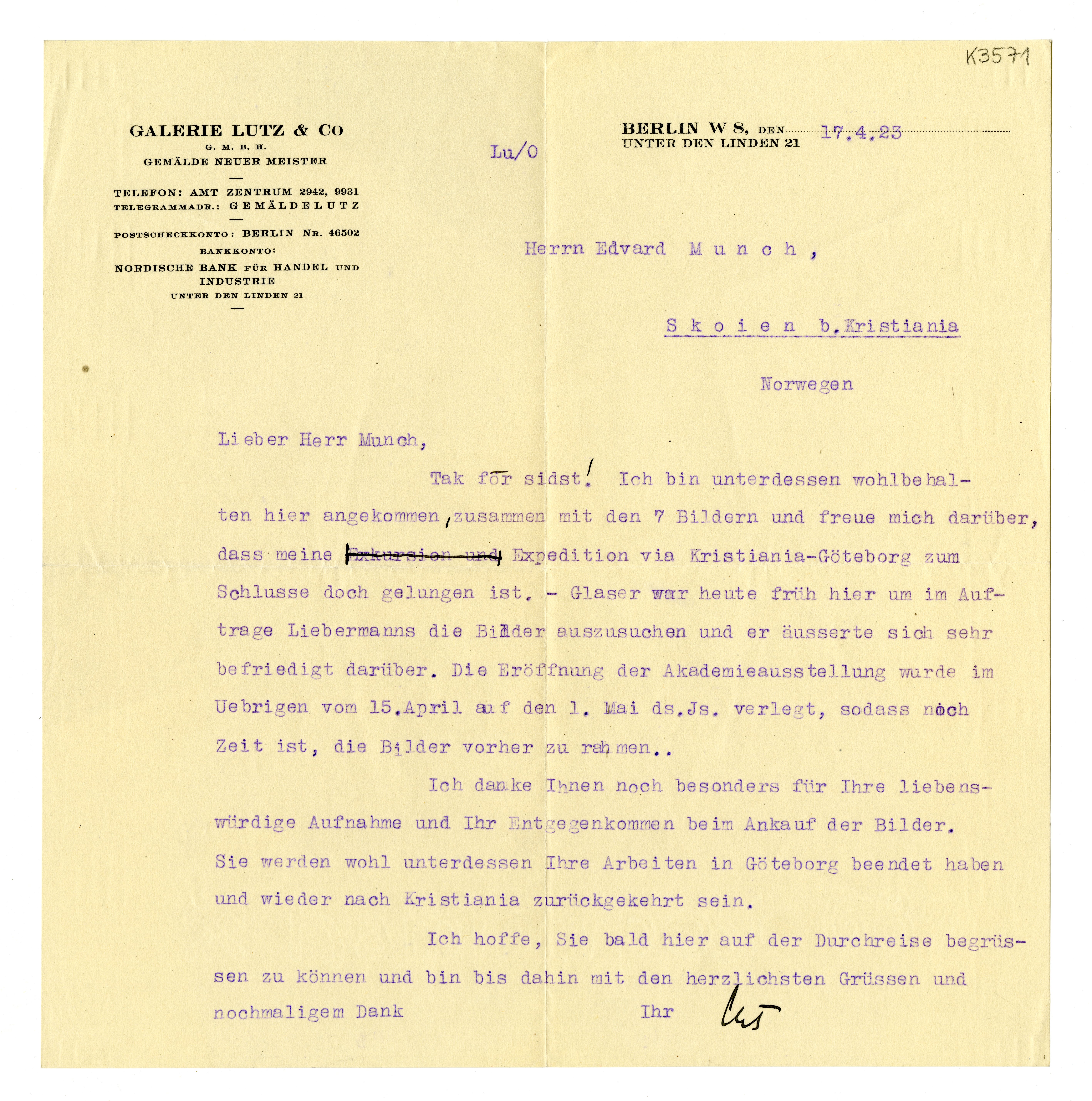 MM K 3571, Munchmuseet. Datert 17.04.1923. Brev fra F.A. Lutz, F.A. Galerie.