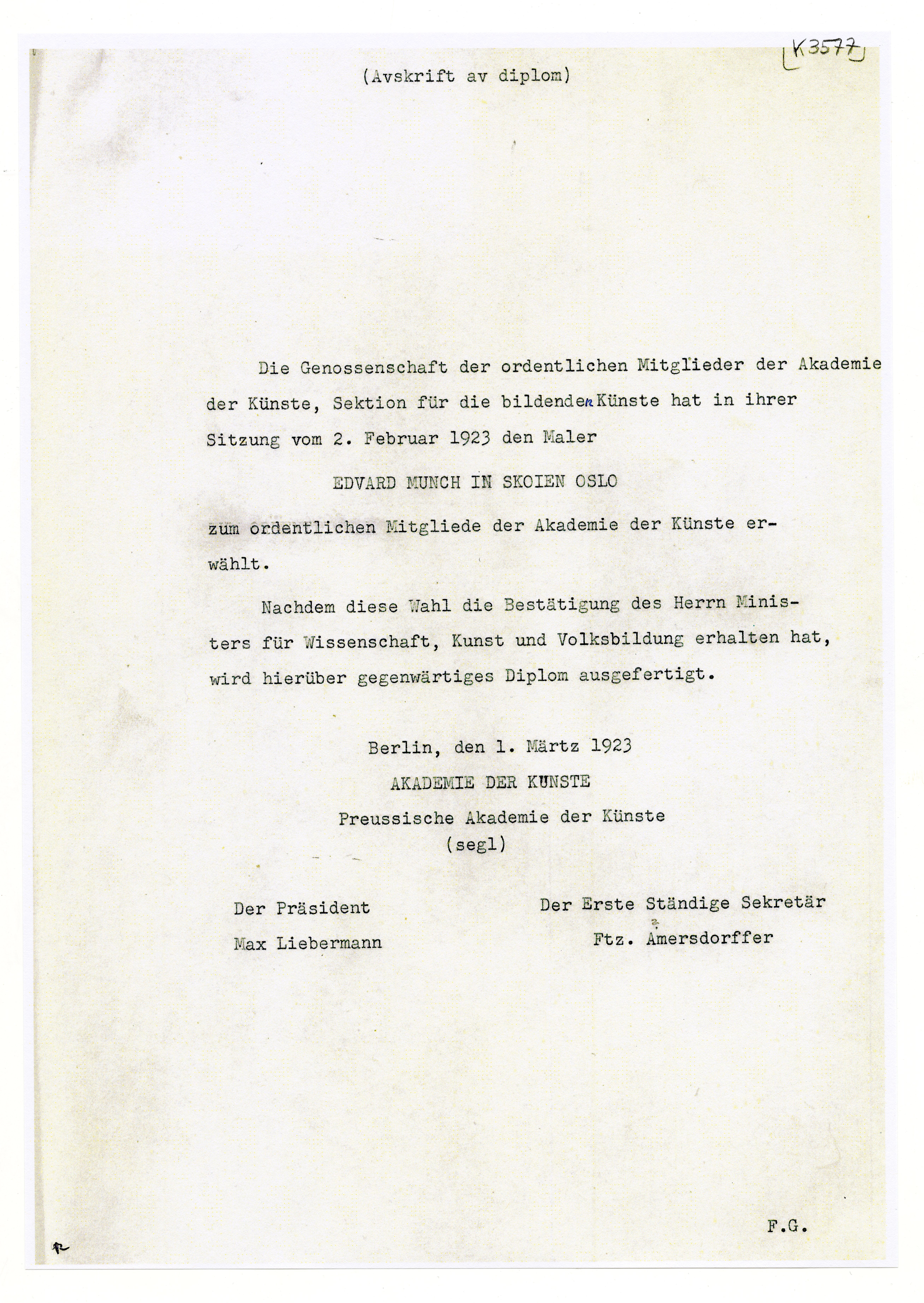 MM K 3577, Munchmuseet. Datert 01.03.1923. Brev fra Max Liebermann, Ftz. Amersdorffer, Akademie Der Künste zu Berlin.