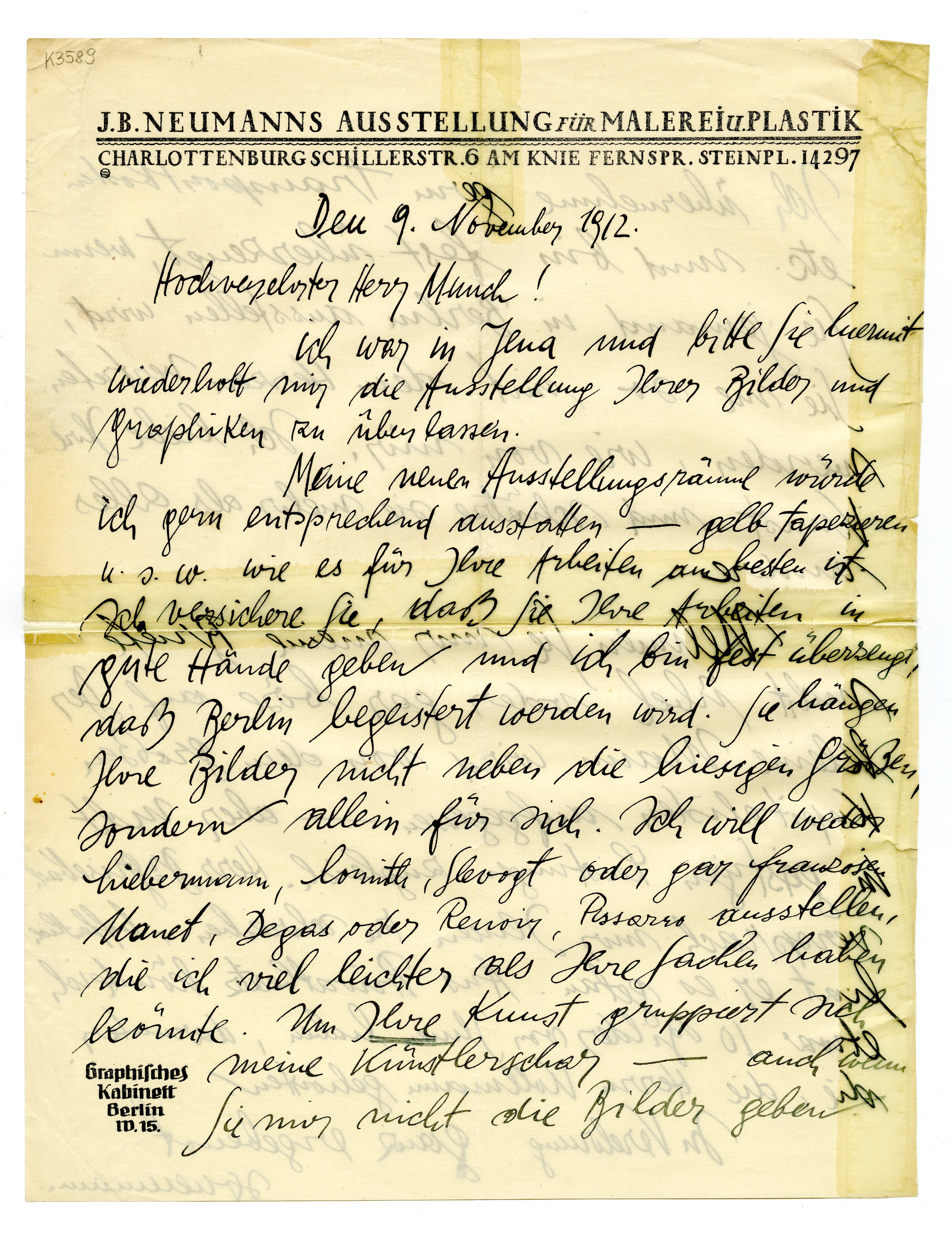 MM K 3589, Munchmuseet. Datert 09.11.1912. Brev fra J.B. Neumann, Graphisches Kabinett, J. B. Neumann.