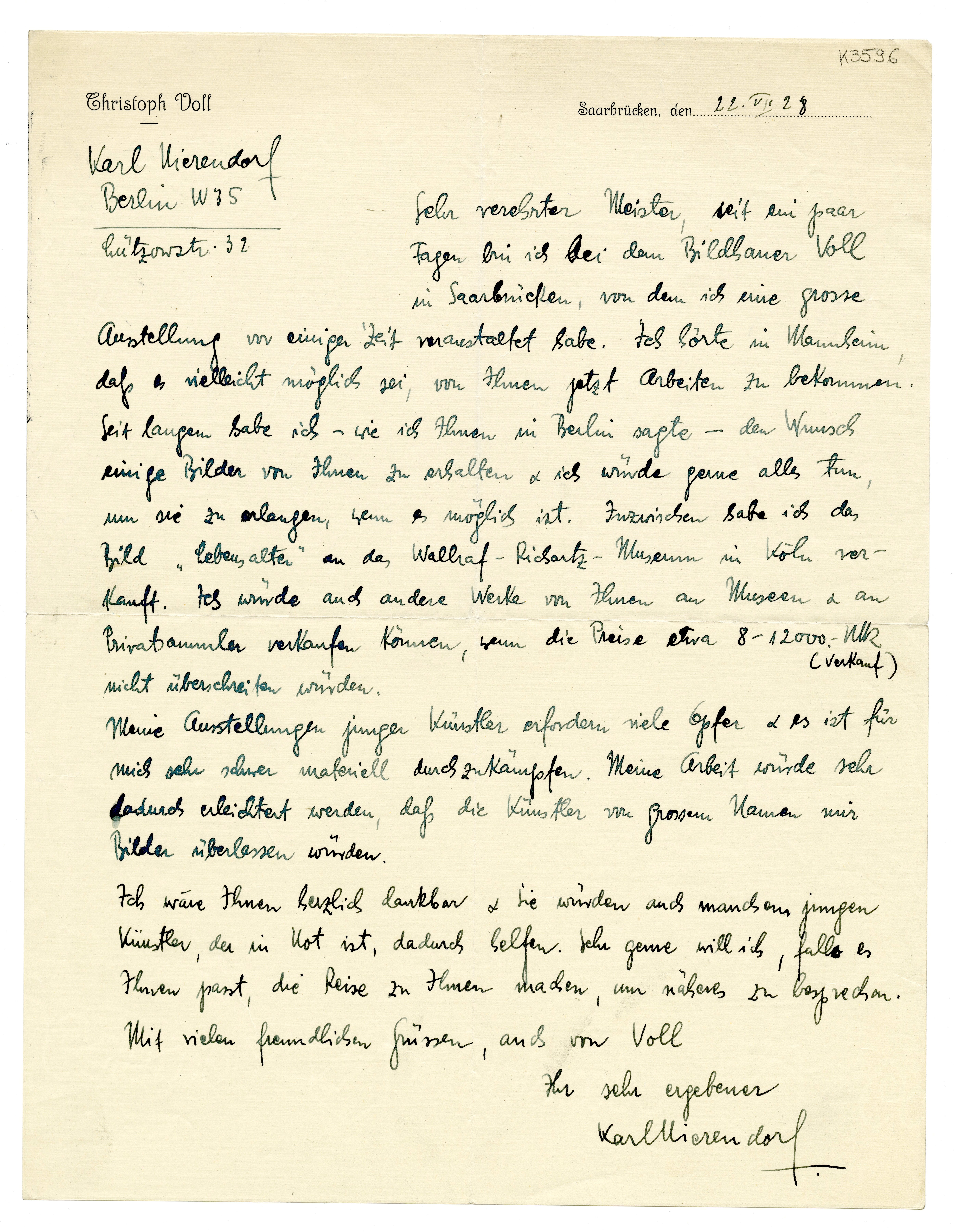 MM K 3596, Munchmuseet. Datert 22.07.1928. Brev fra Karl Nierendorf, Neumann & Nierendorf.