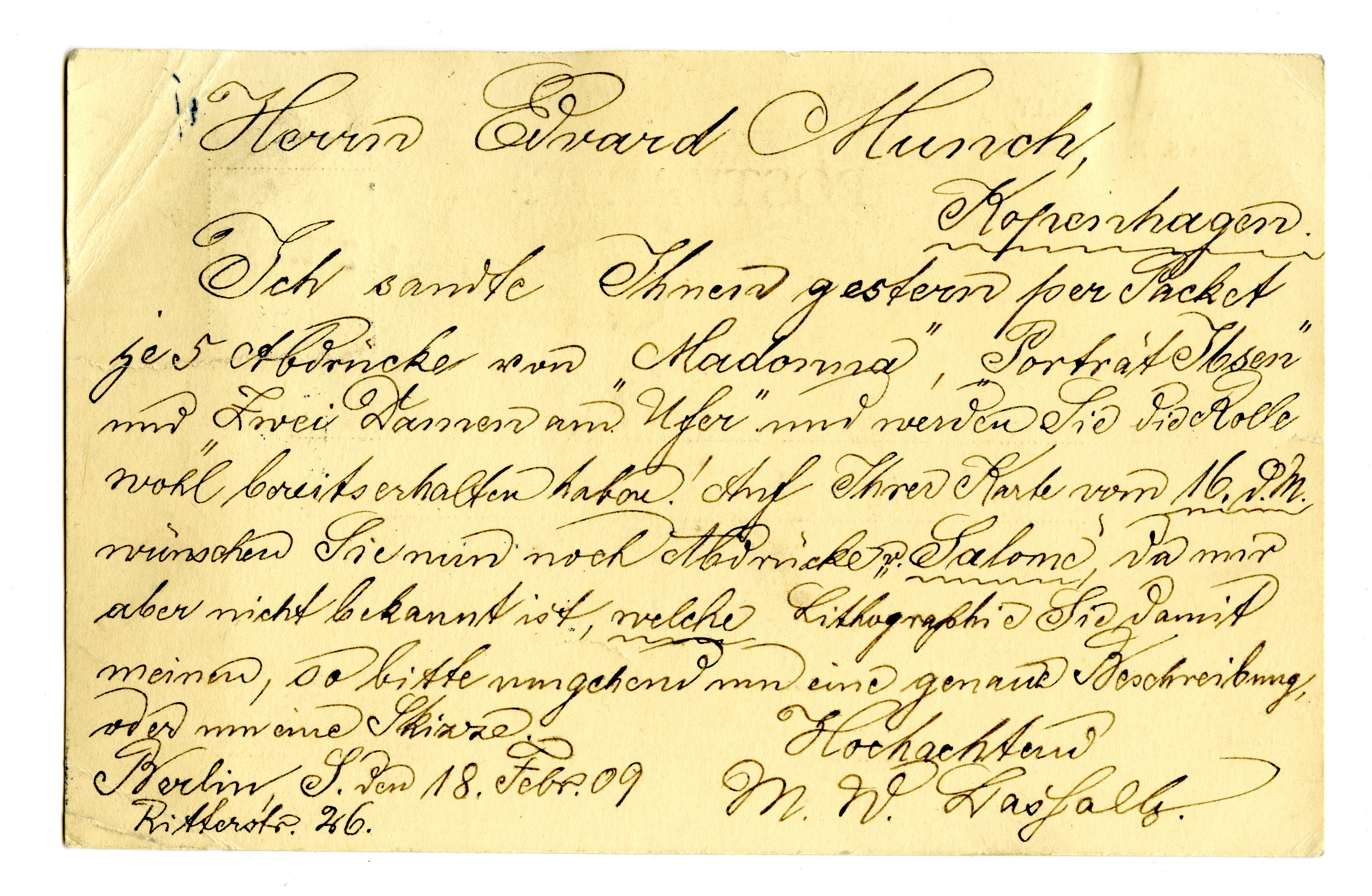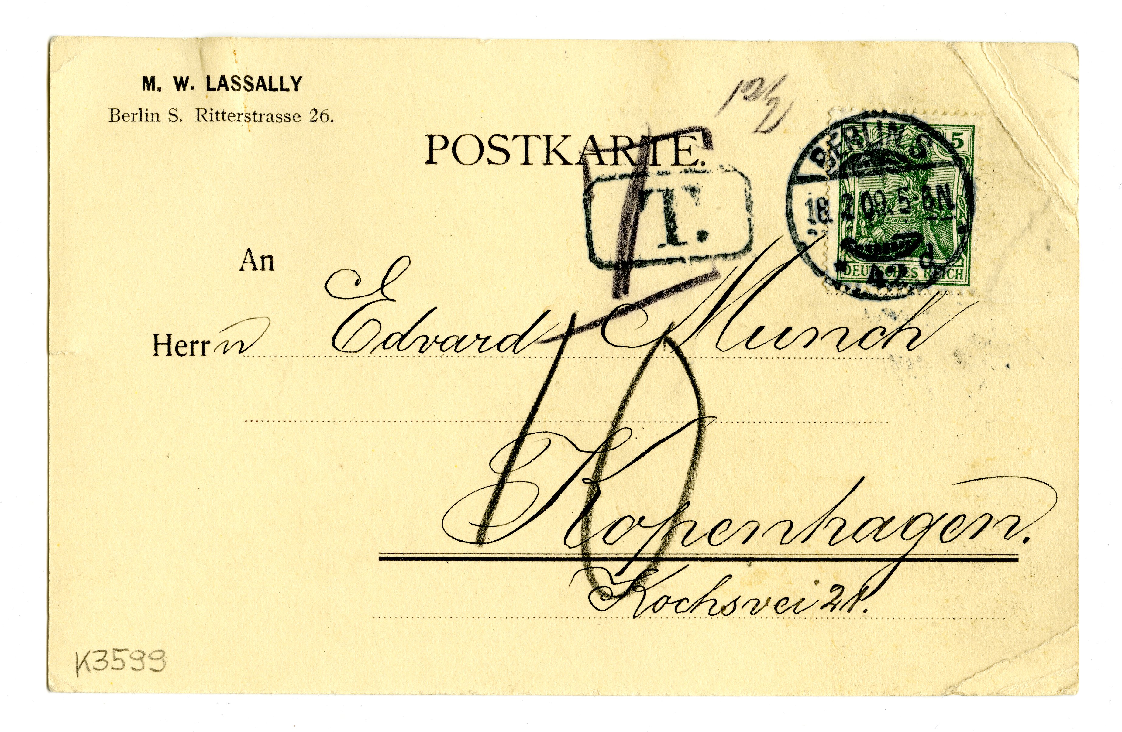 MM K 3599, Munchmuseet. Datert 18.02.1909. Brev fra M. W. Lassally, Graphisches Kunst-Anstalt.