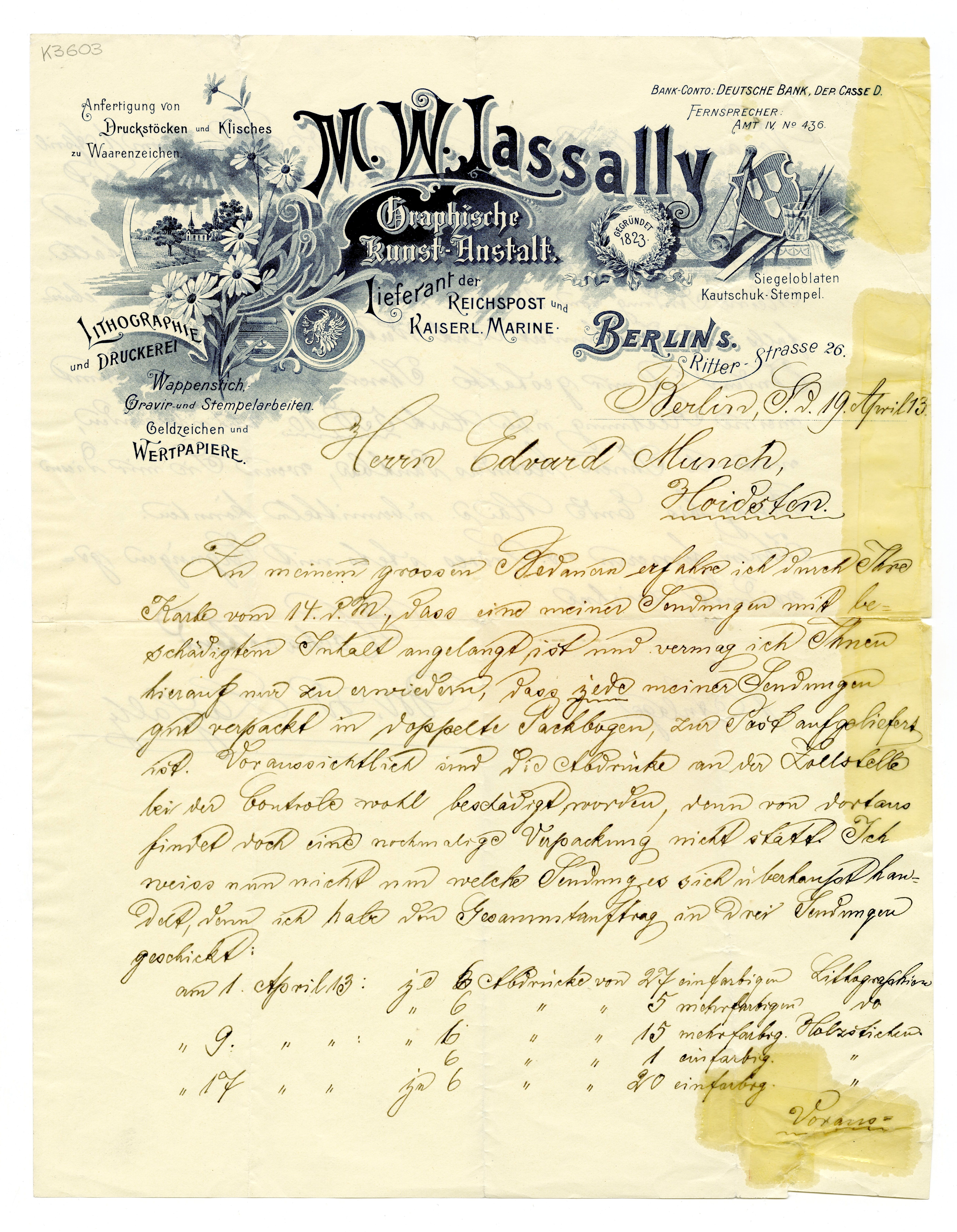 MM K 3603, Munchmuseet. Datert 19.04.1913. Brev fra M. W. Lassally, Graphisches Kunst-Anstalt.