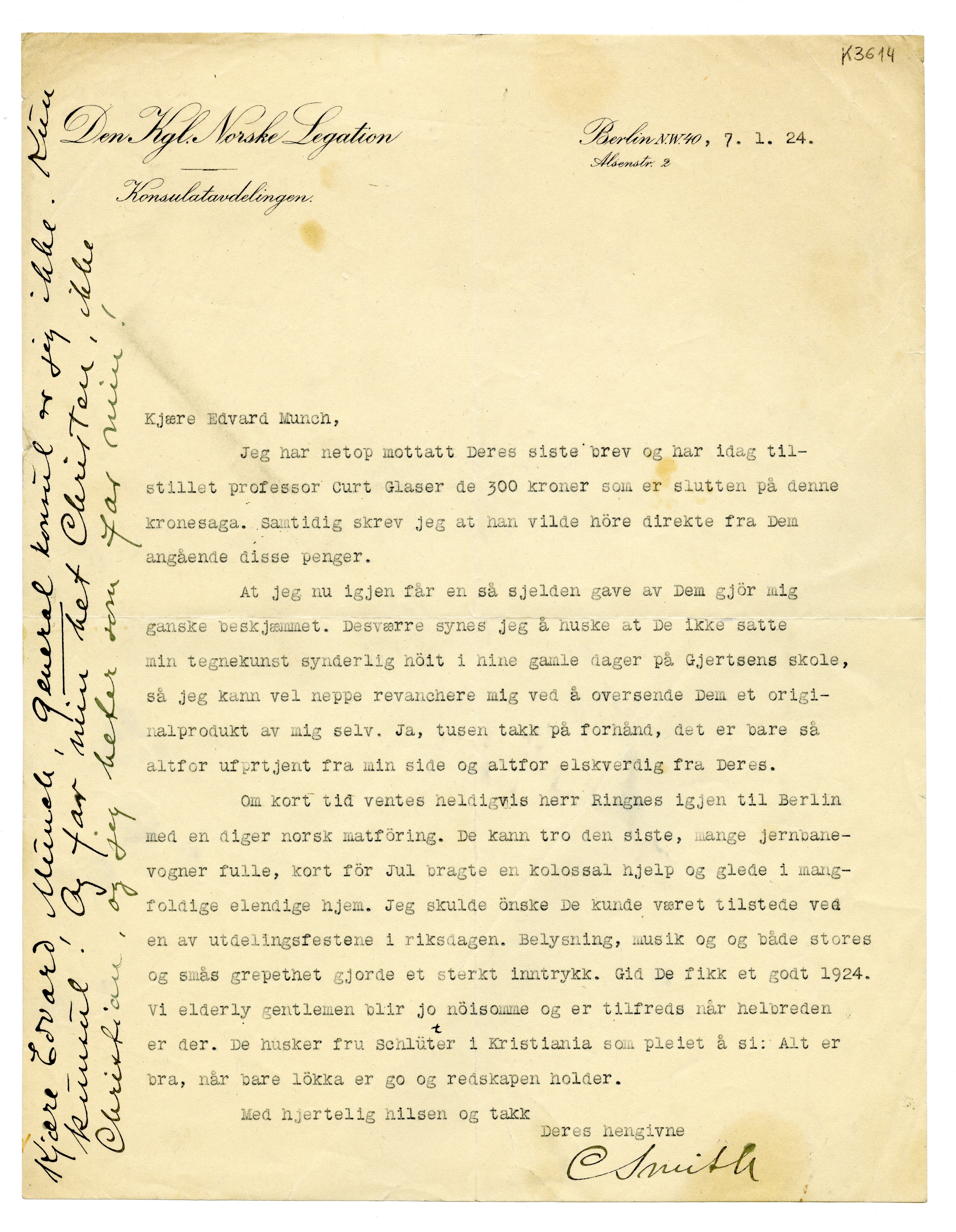 MM K 3614, Munchmuseet. Datert 07.01.1924. Brev fra Christen Smith.